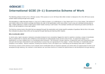 International GCSE (9–1) Economics Scheme of Work The following scheme of work is for a 140 hour course. If the course is run on 120 hours then either revision is reduced to 20 or the 100 hours course content needs working through more rapidly. The assumption is made that each lesson is 1 hour so if it refers to lesson 1 it is referring to a 1 hour lesson and 2-3 is a 2 hour lesson. The scheme of work clearly refers to the content coverage and follows the order of the specification which was written in such a way as to develop learning step by step. Explicit reference is made to what course content needs covering in each lesson. The exemplar activities and resources give advice and tips on what to do with students to cover each section. The final two columns look at the skills that are assessed through the examination and include specific examples of questions that do this in the exam. Also indicated are places where skills can be acquired through teaching and learning within lessons. Why transferable skills? In recent years, higher education institutions and global employers have consistently flagged the need for students to develop a range of transferable skills to enable them to respond with confidence to the demands of undergraduate study and the world of work. To support the design of our qualifications, we have mapped them to a transferable skills framework. The framework includes cognitive, intrapersonal skills and interpersonal skills and each skill has been interpreted for each specification to ensure they are appropriate for the subject. Further information on transferable skills is available on the website. Pearson materials, including this scheme of work, will support you in identifying and developing these skills in students. The final two columns of this scheme of work indicate which transferable skills are explicitly assessed, and where there are opportunities for them to be developed through teaching. Our intention is that teachers can use these columns to increase the opportunities for skill development through teaching. 1 © Pearson Education Ltd 2017 International GCSE (9–1) Economics Lesson(s) Content coverage 1 1.1.1 The economic problem Course content a) The problem of scarcity – where there are unlimited wants and finite resources, leading to the need to make choices. b) Opportunity cost and its effect on economic agents (consumers, producers and government) 2 Exemplar activities and resources Which skills acquired in this lesson are explicitly assessed through examination Which skills could be acquired through teaching and delivery in this lesson a) Show images or list a range of scarce and more abundant goodsget them to consider how rare or not they are. Relate these products to being scarce or abundant. Some useful examples are oil, fresh drinking water, diamonds, gold, truffles, gas, cod, and caviar. As an extension you may consider how in some countries products are scarcer than others. Use this to formally define scarcity. b) Get students to consider their own choices and to consider the options they had, what they chose and what they gave up. Relate these to opportunity costs. Getting them to consider the subjects they considered for A level and how those they rejected are their opportunity costs. Formally define the term opportunity costs. © Pearson Education Ltd 2017 Scheme of Work Look at this from the perspective of consumers in the supermarket, e.g. if I buy Coca Cola I forgo Pepsi. Show a chart that summarises the spending by a government. Consider the choices they have made. Link to increasing spending on one area within the same budget- question what the opportunity costs will be. 2-3 1.1.1 The economic problem © Pearson Education Ltd 2017 c) The use of diagrams to show production possibility curve c) Give the scenario of a desert island with a stranded person. Explain that the island has two products they can possibly produce. If they focus on one product show there is a limit to how many they can produce. If they choose the other there is a maximum too. Then look at how they could increase the production of one good but then have to sacrifice the other good (link to opportunity costs). Construct a diagram to summarise the combinations of goods. Label as appropriate. Introduce capital and consumer goods and construct a similar diagram. Highlight that these can be concave to origin or straight line. Make sure you define Production 3 International GCSE (9–1) Economics d) Production possibility curve diagram should be used to show: 4 - the maximu m productiv e potential of an economy - fully employed or unemploy ed resources - opportuni ty cost - positive or negative economic growth that shifts the productio n possibility Possibility Curves. d) On these diagrams label points and then explain that all the points on the line show he economy at its maximum productive potential and that resources are fully employed. Show points below the line where unemployment exists. Show a point on the line and show what the opportunity costs is at that point, i.e. how many of the other goods have been given up. Show movements between two points and measure what the opportunity costs will be. Show what happens to the diagram when there is economic growth shifting the PPC outwards. Similarly show then negative economic growth and focus on the whole PPC curve moving inwards. Show points that are unobtainable on your PPC diagram. e) Consider scenarios that might cause economic growth and economic decline. These could include for economic decline, war, disease, natural disaster, harvest failure and emigration. Equally look at factors that can lead to economic growth © Pearson Education Ltd 2017 Scheme of Work frontier (PPF) outwards and inwards - possible and unobtain able productio n. e.g. immigration, increasing birth rate, reducing school leaving age, increasing retirement age, investment in capital goods, investment in training and education, increased quanti