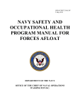 OPNAVINST 5100.19F 5 May 2019 NAVY SAFETY AND OCCUPATIONAL HEALTH PROGRAM MANUAL FOR FORCES AFLOAT DEPARTMENT OF THE NAVY OFFICE OF THE CHIEF OF NAVAL OPERATIONS WASHINGTON D.C. DEPARTMENT OF THE NAVY OFFICE OF THE CHIEF OF NAVAL OPERATIONS 2000 NAVY PENTAGON WASHINGTON DC 20350-2000 OPNAVINST 5100.19F N09F 5 May 2019 OPNAV INSTRUCTION 5100.19F From: Chief of Naval Operations Subj: NAVY SAFETY AND OCCUPATIONAL HEALTH PROGRAM MANUAL FOR FORCES AFLOAT Ref: (a) OPNAVINST 5100.23G 1. Purpose. To implement the Navy Safety and Occupational Health (SOH) Program Manual and the requirements of reference (a) for afloat commands. This instruction has been completely revised and should be reviewed in their entirety. Major changes are summarized in chapter A1, paragraph 3. 2. Cancellation. OPNAVINST 5100.19E. 3. Applicability. This instruction applies to all U.S. Navy afloat commands. Navy echelon 2 command responsibilities are identified to ensure U.S. Navy afloat commands receive the SOH support they need. 4. Discussion. This instruction provides naval afloat command safety standards and precautions necessary to carry out the program established in reference (a). 5. Action. All afloat commands must comply with the implementing policy guidance stated and established in this instruction. The policies, procedures, and actions prescribed here are published without the necessity for implementing instructions from the echelon 2 commands, bureaus, and offices, except where specifically directed. However, commands having significant SOH responsibilities (e.g., Military Sealift Command (MSC)) should provide appropriate supplemental guidance. 6. Records Management a. Records created as a result of this instruction, regardless of format or media, must be maintained and dispositioned for the standard subject identification codes 1000 through 13000 series per the records disposition schedules located on the Department of the Navy/Assistant for Administration, Directives and Records Management Division portal page at https://portal.secnav.navy.mil/orgs/DUSNM/DONAA/DRM/Records-and-InformationManagement/Approved%20Record%20Schedules/Forms/AllItems.aspx. OPNAVINST 5100.19F 5 May 2019 b. For questions concerning the management of records related to this instruction or the records disposition schedules, please contact the local records manager or the Department of the Navy/Assistant for Administration, Directives and Records Management Division program office. 7. Review and Effective Date. Per OPNAVINST 5215.17A, the Office of the Chief of Naval Operations (OPNAV) Special Assistant for Safety (N09F) will review this instruction annually on the anniversary of its issuance date to ensure applicability, currency, and consistency with Federal, Department of Defense (DoD), Secretary of the Navy (SECNAV), and Navy policy and statutory authority using OPNAV 5215/40 Review of Instruction. This instruction will be in effect for 10 years, unless revised or cancelled in the interim, and will be reissued by the 10-year anniversary date if it is still required, unless it meets one of the exceptions in OPNAVINST 5215.17A, paragraph 9. Otherwise, if the instruction is no longer required, it will be processed for cancellation as soon as the need for cancellation is known following the guidance in OPNAV Manual 5215.1 of May 2016. 8. Forms. Forms mandated in this instruction manual are listed in chapter A1, paragraph 9. MARK L. LEAVITT Special Assistant for Safety Releasability and distribution: This instruction is cleared for public release and is available electronically only via Department of the Navy Issuances Web site, https://www.secnav.navy.mil/doni 2 OPNAVINST 5100.19F 5 May 2019 TABLE OF CONTENTS SECTION A. SAFETY AND OCCUPATIONAL HEALTH PROGRAM Chapter 1. 1. 2. 3. 4. 5. 6. 7. 8. 9. INTRODUCTION ............................................................................................ A1-1 Background ....................................................................................................... A1-1 Purpose and Organization of this Instruction Manual ...................................... A1-1 Major Changes .................................................................................................. A1-3 Applicability ..................................................................................................... A1-4 References and Definition of Terms ................................................................. A1-5 SOH Manual Changes....................................................................................... A1-5 Terminology...................................................................................................... A1-5 Precedence ........................................................................................................ A1-5 Forms ................................................................................................................ A1-6 Chapter 2. 1. 2. 3. 4. SOH PROGRAM ORGANIZATION AND RESPONSIBILITIES................. A2-1 Policy ................................................................................................................ A2-1 Overall Navy Program ...................................................................................... A2-1 Command Program ........................................................................................... A2-5 Training ........................................................................................................... A2-11 Chapter 3. INSPECTIONS, ASSESSMENTS, ASSISTS, AND MEDICAL SURVEILLANCE ............................................................................................ A3-1 Discussion ......................................................................................................... A3-1 Safety Inspections ............................................................................................. A3-1 Self Assessments ...............................................