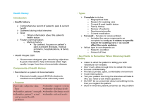 Health History Introduction • Health history Comprehensive record of patient’s past & current health Gathered during initial interview Goal o Obtain information about the patient’s health status Fosters communication o Medical history By contrast, focuses on patient’s past & present illnesses, medical problems, hospitalizations, & family history • Health People 2020 Government-designed plan describing objectives & goals intended to help individuals attain highquality, longer lives free of preventable disease Components of Health History • Recorded in a system of documentation Electronic health record (EHR) & electronic medical record (EMR) most commonly used • Purpose • Types Complete includes: o Biographical data o Reason for seeking care o Current & past health status o Family history o Review of systems o Psychosocial profile o Current medication Focused – focuses on acute problem o Includes the same components as complete but only as it relates to specific reason for seeking care or as would affect the acute problem Which type to use depends on: o Patient’s condition o Amount of time • Key Points to Remember When Obtaining Health History Listen to what the patient is telling you both verbally & non-verbally Don’t rush; allow enough time to obtain the data Ensure confidentiality Provide a private, quiet, comfortable environment Avoid interruptions Tell your patient how long the interview will take & why you need to ask these questions Do NOT be so concerned about completing forms, that you neglect the patient Start w/ what the patient perceives as the problem Use open-ended questions to elicit the patient’s perspective Attend to any acute problems such as pain, before obtaining a detailed history Remember that quality is more important than that quantity of information obtained • Outline Biographic data Reason for seeking care History of Present Illness/Current health status/present health status Past history Family history Psychosocial history Review of body systems • Biographic Data Demographic data about the patient Establish trust & rapport prior to asking questions about sensitive information such as sexual health Name & address Age & date of birth Birthplace o Environmental & cultural factors that contributed to patient’s health o Determine length of time patient spent in & near place of birth & places patient moved prior to current residence Gender o Associated health risks o Transgender individuals Marital status o Asking if person in partnership includes all sexual orientations Sexual orientation o Orientation labels include straight, lesbian, gay, bisexual, trans, queer, etc. Race/ethnicity/nationality o Shared biologic & genetic traits Religion o Organizing framework for beliefs & practices o Can impose restrictions that have an impact on health Occupation o Determines whether physical, psychological, or environmental factors impact patient’s health Health insurance o Does not indicate patient’s inclination to participate in healthcare Source of information o Patient is primary source Reliability of source o Person providing information is able to provide clear, accurate account (consistent info) Referral o Identifies primary care physician/practitioner; if NO referral source identified, may need to make referral for follow-up Advance directives o Allows you to comply w/ patient’s healthcare wishes if advance directives exist Education/educational level o Helps determine teaching approaches; do NOT assume educational level correlates w/ knowledge & understanding (ex. Diabetic PhD holder who is unfamiliar w/ the disease & its management) o Do NOT talk down to patient who has had little formal education • Reason for Seeking Care – also known as chief complaint, presenting problem, or reason for the visit: Ask your patient why she/he is seeking healthcare Document patients’ direct quote (list patient’s statements) Gives you the patient’s perspective on the problem through their eyes o (ex. Tell me why you came to the clinic today?) o (ex. What happened that brought you to the hospital?) • Current Health Status – also culled current health status; Present Health History Primary healthcare – reason of seeking care generally relates to health maintenance or promotion o Usual state of health o Any major health problems o Usual patterns of health of healthcare o Any health concerns Secondary level – reason for seeking care is when there is an acute problem; ask the patient to state what the problem is & how long it has been going on Tertiary level – reason for seeking care is when there is a well-defined problem, chronic problem, or acute problem that is resolving • Mnemonic devices: OLDCARTS o Onset o Location o Duration o Character o Associated or aggravating factors o Relieving factors o Timing o Severity PQRSTU o Provocative or Palliative o Quality or Quantity o Region or Radiation/Related symptoms o Severity/Severity Scale o Timing (Onset, Duration, Frequency) o Understanding patient’s perception COLDSPA o Character o Onset o Location o Duration o Severity o Pattern o Associated factors/how it affects the patient LOIQAPF o Location o Onset o Intensity o Quality o Aggravating/Associated/Alleviating factors o Pain Goal o Functional Goal • At the secondary & tertiary levels patients have existing problems Symptom analysis needs to be performed to assess your patient’s presenting symptoms thorough o Try to determine how disabling the problem is for your patient o o o o • Using PQRSTU in Symptom analysis o Precipitating/Palliative factors What were you doing when the problem started? Does anything make it better, like medications or certain positions? o Does anything make it worse, like movement or breathing? Quality/Quantity Can you describe the symptom? What does it feel like, look like, or sound like? How often are you experiencing it? To what degree does this problem affect your ability to perform your usual da