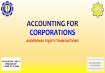 ACCOUNTING FOR CORPORATIONS ADDITIONAL EQUITY TRANSACTIONS ACCOUNTING 3 AND 4 WED AND SAT 7:30AM TO 10:30AM LEARNING OBJECTIVES • • • • • Prepare entries incorporating a partnership Describe the characteristics of preference share Compare preference share and ordinary shares Analyze and record preference share and ordinary shares Explain and compute for legal capital considering preference share • Explain and record delinquent shares, treasury shares, retired shares and donated shares • Prepare the shareholders equity section in good form ACCOUNTING ACCOUNTING 33 AND and 44 WED WED AND and SAT SAT 7:30AM 7:30am TO to 10:30am 10:30AM INCORPORATING A PARTNERSHIP Same with our discussion in accounting for partnership under the topic Dissolution. ACCOUNTING ACCOUNTING 33 AND and 44 WED WED AND and SAT SAT 7:30AM 7:30am TO to 10:30am 10:30AM PREFERENCE SHARE Shareholders believe that preference shares are: ✓ Are less risky than the ordinary shares ✓ Have a rate of return higher than the ordinary shares ✓ Have a fixed rate of dividend amount and ✓ Enjoy preferential rights over dividends and over assets Share that has preferential rights as follows: 1. Preference over distribution of dividends 2. Preference over distribution of assets Preference share may be: ACCOUNTING ACCOUNTING 33 AND and 44 • convertible to ordinary shares WED WED AND and SAT SAT • Redeemable or repurchase by the corporation 7:30AM 7:30am TO to 10:30am 10:30AM ORDINARY SHARES Advantages of Ordinary shares over the Preference shares: ✓ Right to vote ✓ Right over residue dividends and assets after satisfying the preferential claims ACCOUNTING ACCOUNTING 33 AND and 44 WED WED AND and SAT SAT 7:30AM 7:30am TO to 10:30am 10:30AM ISSUANCE OF TWO CLASSES OF STOCKS Accounts titles used Ordinary share Subscribed ordinary share Subscription ReceivableOrdinary Preference share Subscribed preference share Subscription ReceivablePreference ACCOUNTING ACCOUNTING 33 AND and 44 WED WED AND and SAT SAT 7:30AM 7:30am TO to 10:30am 10:30AM Share PremiumOrdinary Share PremiumPreference ISSUANCE OF TWO CLASSES OF STOCKS Shareholders’ Equity ACCOUNTING ACCOUNTING 33 AND and 44 WED WED AND and SAT SAT 7:30AM 7:30am TO to 10:30am 10:30AM LEGAL CAPITAL It is measured by: 1. Aggregate of the par value of all issued par value shares, and 2. Aggregate of the cash and the value of any contributions paid for all issued no par value shares ACCOUNTING ACCOUNTING 33 AND and 44 WED WED AND and SAT SAT 7:30AM 7:30am TO to 10:30am 10:30AM DELINQUENT SHARES When stock subscription is not paid on call date or on the date fixed by the Board, the stock is said to be delinquent. ACCOUNTING ACCOUNTING 33 AND and 44 WED WED AND and SAT SAT 7:30AM 7:30am TO to 10:30am 10:30AM DELINQUENT SHARES ILLUSTRATIVE PROBLEM Assume that Abi subscribed to 100 shares on June 1, 2021 at the par value of P100. Subscription Receivable (P100 x 100) ₱ 10,000 Subscribed Share Capital ₱ 10,000 A 25% down payment was given by A, the balance payable in two equal installments, on June 30 and July 30. ₱ Cash Subscription Receivable ACCOUNTING ACCOUNTING 33 AND and 44 WED WED AND and SAT SAT 7:30AM 7:30am TO to 10:30am 10:30AM 2,500 ₱ 2,500 DELINQUENT SHARES ILLUSTRATIVE PROBLEM She paid the first installment but defaulted in the second installment. ₱ Cash 3,750 Subscription Receivable ₱ 3,750 ₱ 3,750 The unpaid subscription was offered for sale in a public auction. Due from the Highest Bidder Subscription Receivable ACCOUNTING ACCOUNTING 33 AND and 44 WED WED AND and SAT SAT 7:30AM 7:30am TO to 10:30am 10:30AM ₱ 3,750 DELINQUENT SHARES ILLUSTRATIVE PROBLEM Advertising cost amounted to P500. Due from the Highest Bidder Cash ₱ 500 ₱ 500 Nicole made a bid for 90 shares, Soraya for 75 shares and Belle for 80 shares. Soraya being the highest bidder paid the amount due plus interest of P425. Stock certificate were issued for Abi and Soraya. ₱ Cash 4,675 Due from the Highest Bidder Interest Income ACCOUNTING ACCOUNTING 33 AND and 44 WED WED AND and SAT SAT 7:30AM 7:30am TO to 10:30am 10:30AM Subscribed Share Capital Share Capital ₱ ₱ ₱ 4,250 425 ₱ 10,000 10,000 TREASURY SHARES Features: 1. These are shares of the corporation 2. Already paid and issued to the shareholders 3. Then reacquired by the corporation ACCOUNTING ACCOUNTING 33 AND and 44 WED WED AND and SAT SAT 7:30AM 7:30am TO to 10:30am 10:30AM ILLUSTRATIVE PROBLEM TWO METHODS IN RECORDING TREASURY SHARES CHACHA Corporation data are as follows: Ordinary Share Capital, with a par value of P100 Share Premium Retained Earnings June 10 Reacquired 500 ordinary shares for treasury at P80 per share COST METHOD Treasury Share (500 x P80) Cash June 12 P1,000,000 50,000 1,200,000 PAR VALUE METHOD Php 40,000 Php 40,000 Treasury Share (500 x P100) Php 50,000 Cash Php Share Premium from Treasury shares 40,000 10,000 50 treasury shares were sold @ P75 per share Cash Php ACCOUNTING ACCOUNTING 33 AND and 44 Retained earnings WED WED AND and SAT SAT shares (50 shares) 7:30AM 7:30am TO toTreasury 10:30am 10:30AM 3,750 250 Php 4,000 Cash Php 3,750 Share Premium from Treasury shares 1,250 Treasury shares Php 5,000 ILLUSTRATIVE PROBLEM TWO METHODS IN RECORDING TREASURY SHARES CHACHA Corporation data are as follows: Ordinary Share Capital, with a par value of P100 Share Premium Retained Earnings June 15 100 treasury shares were sold for P10,000 COST METHOD Cash PAR VALUE METHOD 10,000 Treasury shares (100 x P80) Share Premium from Treasury shares June 20 Cash (150 x P70) P1,000,000 50,000 1,200,000 8,000 2,000 Cash 10,000 Treasury shares (100 x P100) 10,000 150 treasury shares were sold @ P70 per share ACCOUNTING ACCOUNTING 33 AND and 44 Share Premium WED WED AND and SAT SAT from Treasury shares 7:30AM 7:30am TO toTreasury 10:30am 10:30AM shares (150 x P80) 10,500 1,500 12,000 Cash (150 x P70) Share Premium from Treasury shares Treasury shares (150 x P100) 10,500 4,500 15,000 ILLUSTRATIVE PROBLEM TW