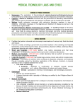 ▪ ▪ ▪ ▪ ▪ ▪ ▪ ▪ ▪ ▪ ▪ ▪ Heinemann - The application of the principles of natural, physical, and biological sciences to the performance of laboratory procedures which aid in the diagnosis and treatment of diseases. Fagelson - Branch of medicine concerned with the performance of laboratory determinations and analyses used in the diagnosis and treatment of disease and the maintenance of health. Walters - Health profession concerned with performing laboratory analyses in view of obtaining information necessary in the diagnosis and treatment of disease as well as in the maintenance of good health. RA 5527 (Philippine Medical Technology Act of 1969) - An auxiliary branch of laboratory medicine which deals with the examination of tissues, secretion and excretion of the human body and body fluids by various electronic, chemical, microscopic and other medical laboratory procedures or techniques either manual or automated which will aid the physician in the diagnosis study and treatment of disease and in the promotion of health in general. Facilities that perform chemical and microscopic examinations of various body fluids like blood and tissues. Found in a variety of settings: government and private hospitals or free standing (non-hospital) laboratories such as those found in clinics, group practices, physician’s offices, veterinary offices, government agencies and military institutions. Small size hospitals: (<100 beds) perform only routine procedures and that more complicated or infrequently requested tests may be sent to reference laboratories. Medium size hospitals: (100-300 beds) contain laboratory that can perform all routine tests including more complicated procedures Large size hospitals: (>300 beds) can handle large volumes of work and perform complex tests. Pathology - The practice of medicine which contributes to diagnosis, prognosis, and treatment through knowledge gained by laboratory applications of the biologic, chemical or physical sciences to man or material obtained from a man. o Two areas of Pathology ❖ Anatomic – diagnosis or confirmation of diseases through autopsy examination and cellular differentiation of autopsy and surgical tissues ❖ Clinical – specializes in chemical, microbiological, and hematologic procedures. Pathologist o Director of a clinical laboratory o Licensed physician with a specialty in Pathology as certified by the Philippine Board of Pathology Medical Technologist o Have a baccalaureate degree from a college or university recognized by Commission on Higher Education (CHED); o Has completed a specified clinical internship in a training laboratory accredited by the Bureau of Health Facilities and Services (BHFS) of the Department of Health (DOH); and o Passed the licensure examination administered by the Board of Medical Technology of the Professional Regulation Commission. o Medical detectives JaniceBassig 1|5 o They work under pressure with speed, accuracy and precision. They adhere to high ethical standards of performance. Early Beginning of Medical Technology ▪ 460 B.C – Hippocrates o Father of Medicine o Formulated the Hippocratic Oath (the code of ethics for practicing physicians) o Described four ‘humors’ or body fluids in man – blood, phlegm, yellow bile and the black bile. o These four humors were believed to be the source of diseases in ancient times ▪ 600 B.C – Polyuria of diabetes was noted in ancient times. o Urinalysis is regarded as the oldest of laboratory procedures today. o Visual examination of urine at bedside could diagnose illness. o Hindu physician - recorded the sweet taste of diabetic urine ▪ 1500 B.C – Vivian Herrick o Medical technologist who traces the beginning of medical technology when intestinal parasites such as Taenia and Ascaris were first identified. o Ebers Papyrus - a book for the treatment of diseases was published (three stages of hookworm infection and diseases) ▪ 14th century – Anna Fagelson o Medical technology started when a prominent Italian doctor, Mondino de’ Liuzzi, employed Alessandra Giliani to perform different tasks in the laboratory, unfortunately she died due to laboratory acquired infection. ▪ 1632 – Anton van Leeuwenhoek o Invented the first functional microscope o He was the first to describe red blood cells, to see protozoa, and to classify bacteria according to shape. o His invention led to the rapid progress of microbiology and pathology ▪ ▪ ▪ ▪ ▪ ▪ ▪ World War II – most widespread war that occurred from 1939-1945. December 07, 1941 – the pearl harbor was invaded by Japan 1944 – US bases were built in Leyte (around 75 miles away from Manila Bay) January 09, 1945 – 850 US Ships of the 6th US Army began around-about to LIingayen Gulf attempting to mislead the Japanese. ❖ Finally, real medical facilities were made available to the Philippines which includes the 26th Medical Laboratory of the 6th US Army. ❖ Location: Quiricada, Sta. Cruz, Manila (Manila Public Health Laboratory) Laboratory was formerly re-organized by: Dr. Pio de Roda and assisted by Dr. Mariano Icasiano (Manila City Health Officer) A training program for individuals aspiring to become laboratory workers was offered in 1947 by Dr. Pio de Roda in collaboration with Dr. Prudencia Sta. Ana ❖ They prepare a formal syllabus of the training program. ❖ Dr. Briones joined the two Trainees were mostly: high school graduates and paramedical graduates JaniceBassig 2|5 ▪ ▪ ▪ ▪ ▪ ▪ ▪ ▪ ▪ ▪ ▪ 1954 – The first medical technology course was offered by Philippine Union College of Baesa, Caloocan, Rizal (Now located in Silang, Cavite) ❖ First Graduate – Dr. Jesse Umali who is an OB-gynecologist and owner of Omega Lab, Vito Cruz, Manila Dr. Antonio Gabriel and Dr. Gustavo Reyes – The faculty of Pharmacy, UST offered MT as an elective to 4th and 5th year B.S Pharmacy students. Rev. Fr. Lorenzo Rodriguez - decided to offer it as a cours