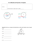 10.1 CIRCLES and Properties of Tangents CIRCLE A circle with center P is called “circle P” is written _________. Tell whether the line, ray, or segment is best described as a radius, chord, diameter, secant, or tangent of C. 1. BC ____________________ 2. EA ____________________ 3. DE ____________________ 4. AB ____________________ 5. B ____________________ 6. FA ____________________ Possibilities for Coplanar Circles: 2 POINTS OF INTERSECTION 1 POINT OF INTERSECTION NO POINTS OF INTERSECTION Common Tangents: Line of Centers: COMMON EXTERNAL TANGENT COMMON INTERNAL TANGENT Tell how many common tangents the circles have and draw them. 7. 8. Radius to a Tangent Relationship: 9. PRACTICE: 10. PT is tangent to O. Find PT. 11. In the diagram, B is a point of tangency. Find the length of the radius of C. 2 Tangent to a Circle Relationship: PRACTICE: 12. RS is tangent to C at S and RT is tangent to C at T. Find the value(s) of x. 13. PS and PT are tangent to O. Find the measures of P, S, and T if the mO=110°. 10.2 Arc Measures and Central Angles VOCABULARY The Measure of Central angles Adjacent Arcs TYPES OF ARCS MINOR ARC ADB m AB ______ m ______ MAJOR ARC Major Arc Minor Arc Semi-Circle Major Arc Minor Arc Semi-Circle Given P. Find each measure. = _______ Major Arc Minor Arc Semi-Circle = _______ Major Arc Minor Arc Semi-Circle = _______ Major Arc Minor Arc Semi-Circle = _______ Major Arc Minor Arc Semi-Circle = _______ Major Arc Minor Arc Semi-Circle SEMI-CIRCLE NOW, try this one! Find the following measurements and label each arc as minor, major, or semicircle. Given: F. mDFC _____ m DE ______ Major Arc m Minor Arc ABC Major Arc Semi-Circle ______ Minor Arc Semi-Circle Congruent Circles: mAFB _____ mAFD _____ m EC ______ Major Arc Minor Arc Semi-Circle m ADB ______ Major Arc Minor Arc m DAB ______ Major Arc Minor Arc Semi-Circle Congruent Arcs: P Semi-Circle 10.3 Apply Properties of Chords ANY CHORD DIVIDES A CIRCLE INTO TWO ARCS Chord Relationships: Congruent Chords «-----» Congruent Arcs EXAMPLE 1: Find the value of x. EXAMPLE 2: Find the value of x. EXAMPLE 3: Find EXAMPLE 4: Find Radius to a Chord «-----» Perpendicular Bisector (Arc too!) EXAMPLE 1: Find QS. EXAMPLE 2: Find the measure of arc PSR. EXAMPLE 3: Find the value of x. EXAMPLE 4: Suppose a chord of a circle is 8 inches from the center and is 30 inches long. Find the length of the radius. DRAW A PICTURE! EXAMPLE 5: COMBO! Find the following in O. E Given: m AB = 120° m AEB _____ m AC _____ mAOC _____ m CBE ______ EC _____ OA ______ OD _____ AD ______ and OC = 12 DC _____ Congruent Chords «-----» Equidistant from Center EXAMPLE 1: Find DC in M. EXAMPLE 2: Find the value of x. 10.4 Use Inscribed Angles and Polygons Inscribed Angles «-----» Intercepted Arcs VERTEX IS __________________________ EXAMPLE 1: Find the measure of <A. EXAMPLE 2: Find the measure of arc BC. EXAMPLE 3: Find the measure of <B. EXAMPLE 4: Find the measure of <C. If a right triangle is inscribed in a circle, then the hypotenuse is a DIAMTER of the circle! EXAMPLE 5: Find the measure of <HGJ. EXAMPLE 6: Name two pairs of congruent angles. If two inscribed angles of a circle intercept the same arc, then the angles are congruent! Inscribed «-----» Circumscribed Inscribed Quadrilateral «-----» Opposite Angles Supplementary EXAMPLE 1: Find the value of x and y. EXAMPLE 2: Could a circle be circumscribed about the quadrilateral? The only way a quadrilateral can be inscribed in a circle is if the opposite angles are supplementary! 10.5 Apply other Angle Relationships in Circles INTERSECTING LINES AND CIRCLES: If two lines intersect in a circle, they form 3 different types of angles as shown below. NOTICE WHERE EACH VERTEX IS . . . Ask yourself, where is the VERTEX located? Ask yourself, where is the VERTEX located? Ask yourself, where is the VERTEX located? TANGENT-CHORD ANGLES Where is the VERTEX located? _________________ EXAMPLE 1: Given line m is tangent. Find the measure of <1 EXAMPLE 2: Given the line is tangent. Find the value of x. Make sure the angle is a combination of a tangent and a chord, NOT A SECANT AND A CHORD! CHORD-CHORD ANGLES (The BOW-TIE ANGLE) Where is the VERTEX located? _________________ EXAMPLE 1: Find the value of x. EXAMPLE 2: Find the value of x. Notice in Example 2, chords are just parts of secants so it is still a CHORD-CHORD angle! EXAMPLE 3: Find the measure of <1. EXAMPLE 4: Find the value of x. EXAMPLE 5: COMBINATION PROBLEM: Given line m is tangent. Find the measures of <1, <2, <3, and <4. <1: where is the vertex? __________ so the rule is _______________; m<1 = _______ <2: where is the vertex? __________ so the rule is _______________; m<2 = _______ <3: where is the vertex? __________ so the rule is _______________; m<3 = _______ <4: where is the vertex? __________ so the rule is _______________; m<4 = _______ TANGENT-SECANT ANGLES SECANT-SECANT ANGLES TANGENT-TANGENT ANGLES Where is the VERTEX located? _________________ EXAMPLE 1: Find the value of x. EXAMPLE 2: Find the value of y. EXAMPLE 3: Find the measure of arcs 1 and 2. EXAMPLE 4: Find the measure of <1. What pattern do you notice with the TANGENT-TANGENT angles from Example 3 and 4? EXAMPLE 5: Find the value of x. EXAMPLE 6: Find the value of x. With all of these types of angles, you can see that it is really important that you can distinguish between the types so keep asking yourself: WHERE IS THE VERTEX? VERTEX LOCATION ON THE CENTER ON THE CIRCLE INSIDE THE CIRCLE OUTSIDE THE CIRCLE OUTSIDE THE CIRCLE (T-T) EXTRA PRACTICE: TYPE OF ANGLE RULE 10.6 Find Segment Lengths in Circles Segments of Chords EXAMPLE 1: Find the value of x. EXAMPLE 3: Given: AB = 8, DE = 3, and EC = 4. Find the length of AE. EXAMPLE 2: Find the value of x. Segments of Secants & Segments of Secants/Tangents Segments of Secants Segments of Secants & Tangents EXAMPLE 1: Find the value of x. EXAMPLE 2: Find the value of x. EXAMPLE 3: Find the value of x. EXAMPLE 4: Find the value of x.