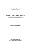 University of the Philippines - Diliman College of Architecture PUERTA DE STA. LUCIA A CONSERVATION MANAGEMENT PLAN GUTIERREZ, MARLIN NOAH P. PROF. MARKEL CESAR LUNA PROF. MICHAEL ANGELO LIWANAG TABLE OF CONTENTS INTRODUCTION ............................................................................................. 4 BACKGROUND ........................................................................................................................................................ 4 PURPOSE OF THE STUDY ........................................................................................................................................... 4 GOALS AND OBJECTIVES ........................................................................................................................................... 5 SCOPE AND LIMITATIONS .......................................................................................................................................... 5 METHODOLOGY ...................................................................................................................................................... 6 Data Collection ............................................................................................................................................... 6 Workplan and Schedule ................................................................................................................................. 6 PART I – UNDERSTANDING THE PLACE ........................................................... 8 1.1. HISTORY RELEVANT TO THE PLACE ....................................................................................................................... 8 A Brief History of Intramuros and Its Walls .................................................................................................... 8 1.2. CHRONOLOGY AND DEVELOPMENT SEQUENCE ..................................................................................................... 16 History of Puerta de Sta Lucia and its Environ ............................................................................................. 16 1.3. SIGNIFICANT PEOPLE AND GROUPS ASSOCIATED WITH PLACE .................................................................................. 18 1.4. LANDSCAPE, SETTINGS, AND VIEWS ................................................................................................................... 19 1.5. NATURAL ENVIRONMENT: LANDFORM, GEOLOGY, AND VEGETATION ....................................................................... 21 Changing Landforms .................................................................................................................................... 21 Physical Characteristics of Manila ............................................................................................................... 23 1.6. PUERTA DE STA. LUCIA STRUCTURE .................................................................................................................... 23 1781 Floor Plan Technical Description ......................................................................................................... 23 The Grid’s Influence...................................................................................................................................... 24 Architectural Style ........................................................................................................................................ 25 Ownership and Use ...................................................................................................................................... 29 Construction Material .................................................................................................................................. 33 1.7. CULTURAL LANDSCAPE .................................................................................................................................... 34 Colonial Esplanade: From Puerta de Sta. Lucia to Malecón Drive ............................................................... 34 From the Diary of Dr. Jose Rizal ................................................................................................................... 36 PART II – ASSESSMENT OF SIGNIFICANCE ..................................................... 38 2.1. CRITERIA FOR ASSESSMENT .............................................................................................................................. 38 2.2. SIGNIFICANCE OF COMPONENTS ........................................................................................................................ 39 Comparative Functional Analysis ................................................................................................................. 39 Comparative Architectural Analysis ............................................................................................................. 40 2.3. ASSESSMENT BY CRITERION .............................................................................................................................. 42 Aesthetic and Architectural Value ................................................................................................................ 42 Historical Value ............................................................................................................................................ 42 Social Value .................................................................................................................................................. 42 2.4. STATEMENT OF SIGNIFICANCE ........................................................................................................................... 42 PART III – IDENTIFICATION OF ISSUES .......................................................... 43 3.1. CONDITIONS AND THREAT (FABRIC SURVEY) .............................................................................................