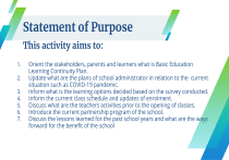 Statement of Purpose This activity aims to: 1. 2. 3. 4. 5. 6. 7. Orient the stakeholders, parents and learners what is Basic Education Learning Continuity Plan. Update what are the plans of school administrator in relation to the current situation such as COVID-19 pandemic. Inform what is the learning options decided based on the survey conducted. Inform the current class schedule and updates of enrolment. Discuss what are the teachers activities prior to the opening of classes. Introduce the current partnership program of the school. Discuss the lessons learned for the past school years and what are the ways forward for the benefit of the school Don Jose Acevedo Integrated School LEARNING CONTINUITY PLAN FOR S.Y. 2021-2022 JOEL D. ARROYO, EdD School Principal I Don Jose Acevedo Integrated School believes that education in the new framework is not a finger pointing task, instead it is a unified action between the government, DepEd, NGOs and the parents for the learners they serve. Careful planning and factors analysis should be carefully made in order to have an effective learning continuity plan. We educators are not only concern on the education alone but for the safety of everybody. Nobody wants COVID 19 but we can’t help but accept the reality that pandemic situation created a new normal in the era of education were DJAIS motto is “WE HELP, OBEY, INNOVATE for us to successfully survive! DJAIS LCP for SY 2021-2022 are based on : Survey Analysis based on 325 respondents LEARNERS • 80% of the learners have no access to technology such as computers, laptop, netbook, and tablet. • 25% of learners are without smartphones. • 67.34% of learners have no access to internet. • 70% of learners are not knowledgeable in using MS operations, Platforms, and don’t know how to use Web Browser. • Survey results reveal that 97% are incompetent in using MS Teams, Zoom and Workplace Teachers • Proficiency/capability of teachers to handle Online class where only 7 out of 16 teachers or 44% are proficient enough with Microsoft apps and communication platforms. • 6 out of 16 teachers or 38% are not knowledgeable in using quizmaster, google meet, flipped classroom, and google classroom who need mentoring session from proficient teacher. • 6 out of 16 or 40% are not knowledgeable in using Hangout. • 80% of pupils don’t have laptops, 75% percent have cellphones but only 27% have internet connections. Conclusion So therefore, based on teachers and learners factors mentioned in the analysis, the most appropriate learning modalities to use in the education of learners in this pandemic situation is Distance Learning Modality (Modular it can be a pure modular in the primary while in the intermediate and high school level, modular offline will have an enhancement activity such as Radio Based and Television Based Instruction). Online activities can also be implemented in the middle of the school depending on the possible response of the parents in providing gadget to their children. Face to face classes will soon be implemented if cases of COVID 19 will drop off to zero. Thus, this plan will be possible with the supervision of our Roxas City Division and our government as well. 8 LEARNING MODALITY GRADE LEVEL • • Distance Learning (Modular, with TBL, RBL as enhancement activities, face to face) NO. OF PUPILS TEACHERS Kinder 25 Fatima C. Mogato Grade I 33 Lolita C. Cabantug Grade II 32 Mary Joy D. Villanueva Grade III 39 Grade IV Grade V Grade VI Grade VII Grade VIII Grade IX 23 27 39 35 47 28 Roselyn C. Catamin Russel C. Fundal, Rachel Kim A. San Juan, Debbie Cris C. Aguilar, Sisa P. Cerado, Isagane S. Fundal Grade X 22 Rica Joy G. Pontilar, Krizzel C. Catamin, Marvie C. Ballenas (Elem. Teacher), Ma. Cristina Balpongo (Elem. Teacher) Annie Deslate- (Proposed LSB), Joeven D. Abalayan-(Proposed LSB) John Patrick Apelado Learners will have 3 days/week (Monday, Wednesday, and Friday) of education at home facilitated by their parents or guardians if the COVID 19 cases still increasing. 2 days/week (1/2 of the total number of learners per grade level on Tuesday and the other half will be on Thursday) of education in school for face to face classes. They will follow the proposed modified class schedule as follow: 9 KINDERGARTEN CLASS Distant Learning Program of Activities S.Y. 2021-2022 TIME NUMBER OF MINUTES 6:00 - 8:00 8:00 - 8:10 120 10 8:10 - 8:30 8:30 - 9:30 20 60 9:30 - 10:00 10:00 - 10:30 10:30-10:45 10:45 - 11:00 30 30 15 15 TOTAL 180 ACTIVITIES Personal Needs (Taking a bath, breakfast, hand washing and tooth brushing activities) Sharing Period(experiences, poems, news and informal conversation)- Using Modules/ TVI/ RBI Self-Selected Activities Work Period (More structured activities maybe done like working on log books related to an experience pre-readingexercises, etc.) )- Using Modules/ TVI/ RBI Play Time and Snacks Rest Story time or Indoor Activities-Using Modules/ TVI/ RBI 10 11 12 13 14 LEARNER’S ACTIVITY Learning Options Kinder to Grade III Will use the Distance Learning/modular delivery mode in print and digital format for 3 days (Monday, Wednesday and Friday). At the same time learners will use the television and radio based instruction as enhancement activities. Face to face learning will be catered every Tuesday and Thursday. Learning Options Grade IV-VI Will have the modular offline delivery mode which will utilize the digital modules for 3 days (Monday, Wednesday and Friday). At the same time learners will use the television and radio based instruction as enhancement activities. Face to face learning will be catered every Tuesday and Thursday. Learning Options Grade VII-X Will also be in distance learning modality where learners will have 3 days modular offline activity which will utilize modules in print and digital format (Monday, Wednesday and Friday). At the same time learners will use the television and radio based instruction as enhancement activities. Face to face 