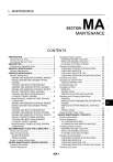 MAINTENANCE L MAINTENANCE SECTION MA MAINTENANCE A B C D CONTENTS PREPARATION ........................................................... 3 Special Service Tools ............................................... 3 Commercial Service Tools ........................................ 3 DESCRIPTION ............................................................ 4 Pre-Delivery Inspection Items .................................. 4 GENERAL MAINTENANCE ....................................... 6 General Maintenance ............................................... 6 PERIODIC MAINTENANCE ....................................... 7 Periodic Maintenance ............................................... 7 ENGINE AND EMISSION CONTROL MAINTENANCE (QR20DE AND QR25DE PETROL ENGINE) ............................................................... 7 CHASSIS AND BODY MAINTENANCE (QR20DE AND QR25DE PETROL ENGINE) ....... 8 ENGINE AND EMISSION CONTROL MAINTENANCE (YD22DDTI DIESEL ENGINE) ................ 9 CHASSIS AND BODY MAINTENANCE (YD22DDTI DIESEL ENGINE) .............................. 9 MAINTENANCE UNDER SEVERE DRIVING CONDITIONS ...................................................... 10 ENGINE AND EMISSION CONTROL MAINTENANCE (QR20DE AND QR25DE PETROL ENGINE) ............................................................. 12 CHASSIS AND BODY MAINTENANCE (QR20DE AND QR25DE PETROL ENGINE) ..... 13 ENGINE AND EMISSION CONTROL MAINTENANCE (YD22DDTI DIESEL ENGINE) .............. 14 CHASSIS AND BODY MAINTENANCE (YD22DDTI DIESEL ENGINE) ............................ 14 MAINTENANCE UNDER SEVERE DRIVING CONDITIONS ...................................................... 15 RECOMMENDED FLUIDS AND LUBRICANTS ...... 17 Fluids and Lubricants ............................................. 17 SAE Viscosity Number ........................................... 18 GASOLINE ENGINE ........................................... 18 DIESEL ENGINE ................................................. 18 Engine Coolant Mixture Ratio ................................ 19 ENGINE MAINTENANCE (QR20DE·QR25DE) ........ 20 Checking Drive Belts .............................................. 20 Tension Adjustment ................................................ 20 Changing Engine Coolant ....................................... 20 DRAINING ENGINE COOLANT .......................... 20 REFILLING ENGINE COOLANT ......................... 21 FLUSHING COOLING SYSTEM ......................... 22 Checking Cooling System ...................................... 22 CHECKING COOLING SYSTEM HOSES ........... 22 CHECKING RADIATOR ...................................... 22 CHECKING RADIATOR CAP .............................. 22 CHECKING RADIATOR SYSTEM FOR LEAKS... 23 Checking Fuel Lines ............................................... 24 Changing Air Cleaner Filter .................................... 24 VISCOUS PAPER TYPE ..................................... 24 Changing Engine Oil ............................................... 24 Changing Oil Filter .................................................. 25 REMOVAL ........................................................... 25 INSTALLATION ................................................... 25 INSPECTION AFTER INSTALLATION ................ 26 Checking and Changing Spark Plugs ..................... 26 REMOVAL ........................................................... 26 INSPECTION AFTER REMOVAL (EXCEPT FOR RUSSIA) .............................................................. 26 INSPECTION AFTER REMOVAL (FOR RUSSIA) ..................................................................... 27 INSTALLATION ................................................... 28 Checking EVAP Vapor Lines .................................. 28 ENGINE MAINTENANCE (YD22DDTI) .................... 29 Checking Drive Belts .............................................. 29 Tension Adjustment ................................................ 29 A/C COMPRESSOR BELT .................................. 30 ALTERNATOR AND WATER PUMP BELT .......... 30 Changing Engine Coolant ....................................... 30 DRAINING ENGINE COOLANT .......................... 30 REFILLING ENGINE COOLANT ......................... 31 FLUSHING COOLING SYSTEM ......................... 32 Checking Cooling System ...................................... 32 CHECKING COOLING SYSTEM HOSES ........... 32 CHECKING RADIATOR ...................................... 32 CHECKING RADIATOR CAP .............................. 33 CHECKING RADIATOR SYSTEM FOR LEAKS... 33 Checking Fuel Lines ............................................... 34 MA-1 E F G H I J K MA M Changing Fuel Filter ............................................... 34 Draining Water from Fuel Filter ............................... 34 Draining Water from Fuel Filter (With Fuel Filter Warning) ................................................................. 34 Changing Air Cleaner Filter .................................... 35 VISCOUS PAPER TYPE ..................................... 35 Changing Engine Oil ............................................... 35 Changing Oil Filter (TYPE A) .................................. 36 REMOVAL ........................................................... 36 INSTALLATION .................................................... 36 INSPECTION AFTER INSTALLATION ................ 36 Changing Oil Filter (TYPE B) .................................. 37 REMOVAL ........................................................... 37 INSTALLATION .................................................... 38 INSPECTION AFTER INSTALLATION ................ 38 CHASSIS AND BODY MAINTENANCE ................... 39 Checking Exhaust System ...................................... 39 Checking Clutch Fluid Level and Leaks ................. 39 Checking Clutch System ........................................ 39 Checking M/T Oil .................................................... 39 Changing M/T Oil .................................................... 40 Che