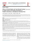 Archives of Physical Medicine and Rehabilitation journal homepage: www.archives-pmr.org Archives of Physical Medicine and Rehabilitation 2021;102:1059-66 ORIGINAL RESEARCH Effects of Virtual Reality and Task-Oriented Training on Hand Function and Activity Performance in Pediatric Hand Burns: A Randomized Controlled Trial Fatma Alzahraa H. Kamel, PhD,a,b Maged A. Basha, PhDb,c From the aDepartment of Physical Therapy for Surgery, Faculty of Physical Therapy, Cairo University, Cairo, Egypt; bDepartment of Physical Therapy, College of Medical Rehabilitation, Qassim University, Qassim, Buraidah, Saudi Arabia; and cDepartment of Physical Therapy, El-Sahel Teaching Hospital, General Organization for Teaching Hospitals and Institutes, Cairo, Egypt. Abstract Objective: To assess the efficacy of a motion-sensing, hands-free gaming device and task-oriented training (TOT) programs on improving hand function, activity performance, and satisfaction in pediatric hand burns. Design: A randomized controlled trial. Setting: Outpatient rehabilitation center. Participants: Fifty children with deep partial-thickness or full-thickness hand burns. (NZ50; mean age, 10.701.64y; range, 7-14y) Interventions: Children were randomized into 1 of the following 3 groups: the motion-sensing, hands-free gaming device group that used interactive video games plus traditional rehabilitation (TR); the TOT group that used real materials plus TR; and the control group that only received TR, all groups received the interventions 3 days per week for 8 weeks. Main Outcome Measures: We assessed the children at the baseline and after 8 weeks of intervention. The primary outcome measures were the Jebsen-Taylor Hand Function Test, Duruoz Hand Index (DHI), and Canadian Occupational Performance Measure (COPM). The secondary outcome measures were range of motion (ROM) of the digits, grip strength, and pinch strengths (tip, palmer, and lateral pinch). Results: There was a significant increase in all measurements of the motion-sensing, hands-free gaming device and TOT groups compared with that of the control group postintervention (P<.05). There was no significant change in Jebsen-Taylor Hand Function Test, COPM performance, ROM, grip strength, and tip and lateral pinch strengths between the motion-sensing, hands-free gaming device group and TOT group (P>.05), whereas there was a significant increase in DHI, COPM satisfaction, and palmer pinch strength (P<.05) in the motion-sensing, hands-free gaming device group compared with the TOT group postintervention. Conclusions: The motion-sensing, hands-free gaming device and TOT programs resulted in significant improvement in hand function, activity performance and satisfaction, ROM of the digits, grip strength, and pinch strengths in pediatric hand burns compared with the traditional hand rehabilitation. Archives of Physical Medicine and Rehabilitation 2021;102:1059-66 ª 2021 by the American Congress of Rehabilitation Medicine The severity and prevalence of hand burns is well recognized, with rehabilitation implications and final outcomes well beyond what can be measured by evaluating the affected percentage of total body surface area on its own.1 The function of the hands is 1 of the key determinants of the quality of life in pediatric hand burns (PHB). PHB can induce different hand deformities and Clinical Trial Registration No.: NCT04497103. Disclosures: none. contractures, and the functional skills gained after hand burn disproportionately affects the child’s capacity to reintegrate completely into their preinjured position in society.2-6 Despite traditional rehabilitation (TR) of PHB, hand function can remain impaired,7-10 and two-thirds of patients with full-thickness hand burn injuries change careers because of their functional hand disability.11 Virtual reality (VR) has been used in functional rehabilitation of upper extremity defects, and task-specific training efficacy increased through repetitive and positive feedback when tasks 0003-9993/21/$36 - see front matter ª 2021 by the American Congress of Rehabilitation Medicine https://doi.org/10.1016/j.apmr.2021.01.087 1060 were ordered in a random training series.12,13 Xbox Kinecta is an interactive and enjoyable training device that produces a virtual rehabilitation scene that systemically manages the intensity of training.14 In randomized controlled trials, Kinect-based VR rehabilitation used in patients with burns,15,16 patients with stroke,17 children with cerebral palsy,18 and children with arthritis19 resulted in increased upper extremity function and activity performance and participation and has superior results on outcomes compared with TR. Task-oriented training (TOT) concentrates on performance and engagement in compliance with the recommendations of the International Classification of Functioning, Disability and Health. In TOT the child learns problem-solving skills and successful alternative techniques by adjusting to various situations to accomplish the activity. TOT literature reports that in neurologic and musculoskeletal patients the use of problem-solving skills is superior to training requiring numerous repeated movement patterns for increasing function and participation of the upper extremity.19-22 VR has been used in burn studies mainly for pain management and increase range of motion (ROM) in acute burns.15,16,23,24 No studies in the existing literature have assessed the effect of Xbox Kinect-based rehabilitation or TOT in PHB. The objective of this work was to evaluate the efficacy of Xbox Kinect and TOT in PHB in enhancing hand function, activity performance and satisfaction, ROM of digits, grip strength, and pinch strengths. Methods Trial design This was a randomized controlled trial conducted between May 2018 and September 2019. We recruited all participants from the burn units of teaching hospitals in Cairo, Egypt. All of the children’s guardians signed an informed consent form. The Ethics Committee gra