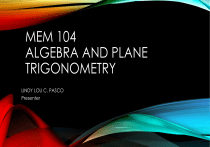 MEM 104 ALGEBRA AND PLANE TRIGONOMETRY LINDY LOU C. PASCO Presenter TOPIC Solutions of Right Triangles Solutions of Right Triangles The process of finding the missing measurements is known as solving the triangle If the triangle is a right triangle, then one of the angles is 90°. Therefore, you can solve the right triangle if you are given the measures of two of the three sides or if you are given the measure of one side and one of the other two angles . If the triangle is a right triangle, you can use simple trigonometric ratios to find the missing parts. A. Solving a right triangle given the measure of the two parts; the length of the hypotenuse and the length of one leg Example: Triangle BCA is right-angled at C. If π = 23 and π = 17 , find ∠ π΄, ∠π΅ and π . Express your answer into two decimal places. Solution: a. Side b is the adjacent side of ∠π΄; c is the hypotenuse of right triangle BCA. Use CAH, that is ππππππππ‘ cos π = βπ¦πππ‘πππ’π π Sketch the figure π cos π΄ = π 17 cos π΄ = 23 cos π΄ = 0.7391 π΄ ≈ 42.3400 We use scientific calculator to find an angle whose cosine value is 0.7391 b. Since in part (a), it was already found that ∠π΄ ≈ 42.34π then, ∠π΅ = 90π − 42.34π ∠π΅ ≈ 47.66π c. Find a by using the Pythagorean Theorem π2 + π 2 = π 2 π2 + (17)2 = (23)2 π2 = 529 − 289 π2 = 240 π = 240 π ≈ 15.49 The complete set of solutions of the given triangle are: ∠π΅ ≈ 47.66π ∠π΄ ≈ 42.34π ∠πΆ = 900 π ≈ 15.49 π = 17 π = 23 B. Solving a right triangle given the length of the hypotenuse and the measure of one acute angle Example: Triangle BCA is right-angled at C, if π = 27 and ∠ π΄ = 58π , find ∠ π΅, b, and a. Solution: a. To find B, since B and A are complementary angles, then ∠π΅ + ∠π΄ = 90π ∠π΅ = 90π − 58π ∠π΅ = 32π b. To find b, since b is the adjacent side of ∠π΄ and c is the hypotenuse of right βπ΅πΆπ΄ , then use CAH ππππππππ‘ cos π = π = 27 cos 58π βπ¦πππ‘πππ’π π π cos π΄ = π cos 58π = π 27 π = 27(0.5299) π ≈ 14.31 c. To find a, since a is the opposite side of ∠π΄ and c is the hypotenuse of right βπ΅πΆπ΄ , then use SOH πππππ ππ‘π sin π = βπ¦πππ‘πππ’π π π sin π΄ = π π sin 58 = 27 π π = 27 sin 58π The complete set of solutions of the given triangle are: ∠π΅ = 320 ∠π΄ = 580 ∠πΆ = 900 π = 27(0.8480) π ≈ 22.9 π ≈ 22.9 π ≈ 14.31 π = 27 C. Solving a right triangle given the length of one leg and the measure of one acute angle Example: Solution: Triangle ACB is right-angled at C. If ∠ π΄ = 63π and a= 11 cm, find ∠ π΅, b, and c. a. To find ∠B, take note that ∠ B and ∠ A are complementary angles. Then, ∠ B + ∠ A= 90π ∠ B = 90π − 63π ∠ B = 27π b. To find b, since b is the adjacent side and a is the opposite side of ∠π΄, then use TOA πππππ ππ‘π 11 π tan π = tan 63 = ππππππππ‘ π π tan π΄ = π tan 63π = 11 π tan 63π 11 = π π(1.9626) = 11 11 π= 1.9625 π ≈ 5.60 ππ c. To find c, since c is the hypotenuse and a is the opposite side of ∠π΄, then use SOH πππππ ππ‘π sin π = βπ¦πππ‘πππ’π π The complete set of solutions of the given triangle are: ∠π΅ = 270 ∠π΄ = 630 ∠πΆ = 900 π sin π΄ = π sin 63π = 11 π π = 11 π ≈ 5.60 ππ π ≈ 12.35 ππ π sin 63π = 11 π(0.8910) = 11 11 π= 0.8910 π ≈ 12.35 ππ D. Solving a right triangle given the length of the two legs Example: Triangle ACB is right-angled at C. If a =18.5 cm and b= 14.2 cm, find c, ∠ π΄ πππ ∠ π΅. Solution: a. To find c, use Pythagorean Theorem π 2 = π2 + π2 π 2 = (18.5)2 +(14.2)2 b. To find ∠π΄ , since a and b are opposite and adjacent side of ∠π΄ respectively, then use TOA π 2 = 342.25 + 201.64 π2 = 543.89 π = 543.89 π ≈23.32 cm πππππ ππ‘π tan π = ππππππππ‘ π tan π΄ = π tan π΄ = 18.5 14.5 tan π΄ = 1.3028 π΄ ≈ 52π We can use our scientific calculator to find an angle whose tangent is 1.3028 c. Based on the fact that ∠ A and ∠ B are complementary, the measure of angle ∠ B is 90π − 52π = 38π The complete set of solutions of the given triangle are: ∠π΅ = 380 ∠π΄ ≈ 52π ∠πΆ = 900 π = 18.5 ππ π = 14.2 ππ π ≈23.32 cm Law of Sines Learning Objectives 1. Use the Law of Sines to solve oblique triangles. 2. Find the area of an oblique triangle using the sine function. 3. Solve applied problems using the Law of Sines. Using the Law of Sines to Solve Oblique Triangles Any triangle that is not a right triangle is an oblique triangle. Solving an oblique triangle means finding the measurements of all three angles and all three sides. To do so, we need to start with at least three of these values, including at least one of the sides. We will investigate three possible oblique triangle problem situations: 1. ASA (angle-side-angle) We know the measurements of two angles and the included side. 2. AAS (angle-angle-side) We know the measurements of two angles and a side that is not between the known angles. 3. SSA (side-side-angle) We know the measurements of two sides and an angle that is not between the known sides. Knowing how to approach each of these situations enables us to solve oblique triangles without having to drop a perpendicular to form two right triangles. Instead, we can use the fact that the ratio of the measurement of one of the angles to the length of its opposite side will be equal to the other two ratios of angle measure to opposite side. Let’s see how this statement is derived by considering the triangle shown in Figure 10.6. β π β π Using the right triangle relationships, we know that sin α = and sin β = . Solving both equations for β gives two different expressions for β. β= π sin πΌ and β = π sin π½ We then set the expressions equal to each other. Simil