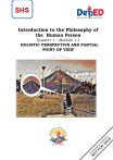 SHS Introduction to the Philosophy of the Human Person Quarter 1 – Module 1.1 HOLISTIC PERSPECTIVE AND PARTIAL POINT OF VIEW Introduction to the Philosophy of the Human Person – SHS Module Title: Module 1.1- HOLISTIC PERSPECTIVE AND PARTIAL POINT OF VIEW Republic Act 8293, section 176 states that: No copyright shall subsist in any work of the Government of the Philippines. However, prior approval of the government agency or office wherein the work is created shall be necessary for the exploitation of such work for a profit. Such agency or office may, among other things, impose as a condition the payment of royalties. Borrowed materials (i.e., songs, stories, poems, pictures, photos, brand names, trademarks, etc.) included in this book are owned by their respective copyright holders. Every effort has been exerted to locate and seek permission to use these materials from their respective copyright owners. The publisher and authors do not represent nor claim ownership over them. Regional Director: Assistant Regional Director: Regional EPS: Division EPS: Gilbert T. Sadsad Jessie L. Amin Sheila C. Bulawan Presyl A. Bello, SDO Legazpi City Development Team of the Module Writer: JESON D. BALINGBING- Pag-asa NHS, SDO Legazpi City Editor: JESSIE MARIE MATA MORCOSO- Pawa HS, SDO Legazpi City ALVIN A. SARIO, PhD – University of Santo Tomas, Legazpi Reviewers: GERRY A. BAJARO – Oro Site HS, SDO Legazpi City JESON D. BALINGBING - Pag-asa NHS, SDO Legazpi City ROMEO A. TUSI- Pawa HS, SDO Legazpi City ROMMEL U. QUIÑONES – Homapon HS, SDO Legazpi City Illustrator: VIAN GABRIEL SPES B. QUINONES – Grade 7, Philippine Science HS, Goa, Camarines Sur Layout Artist: Cover Photo: JESON D. BALINGBING- Pag-asa NHS, SDO Legazpi City 2 INTRODUCTION Have you ever asked yourself questions like, “Who am I?”, “What makes me happy?”, “What is my purpose in this world?”, or “What can I do to make the world a better place?” If yes, then, congratulations! You are doing philosophy. People often misinterpret philosophy as something that is unreasonable and unresponsive to a desired meaningful questions. Philosophy is a broad discipline that encompasses “the study of all existence in this world”. In fact, it is a perfect avenue for all your queries as it offers unlimited scope of understanding about you, others, and the world. According to a pre-eminent Greek philosopher, Plato and a 15th-century French philosopher, Rene Descartes (also known as the father of modern philosophy), the goal of philosophy is to wonder and doubt, respectively. To wonder and doubt are not just as simple as you think. Indeed, doing philosophy is not an easy task. It requires you to think holistically, critically and analytically on particular situations or problems. It takes a process for you to understand the process of doing philosophy. OBJECTIVES At the end of this module, you should be able to: 1. Distinguish a holistic perspective from a partial point of view (PPT11/12-Ia-1.1), 2. Explain the importance of holistic thinking over partial thinking; and 3. Write a “Personal Action Plan” on how to deal with everyday life from a holistic perspective. VOCABULARY Now, that you know your targets for the day, have a glimpse of the new words below which may appear in this module. ANALYTICAL pertains to analytical thinking that promotes a partial point of view as a process of knowing things. BIAS means being unfair. HOLISTIC is the ability to see things fully, not partially. JUDGMENT is the ability to think and come up with decisions based on the observed situation. OBJECTIVE is the state of being fair. PARTIAL is the ability to see the parts rather than the whole. PERSPECTIVE refers to a person’s thinking that shows fair and valid judgment. POINT OF VIEW pertains to a person’s thinking that shows a particular opinion about something. PRE-TEST A. True or False Direction: Write the letter “T” if the statement is true and “F” if the statement is false. Write your answer in your notebook. 1. Looking for different brands of clothes to buy is an example of partial point of view. 2. Partial point of view promotes more valid, sound and logical solution to the problem. 3. Understanding the past and background of a bully student shows partial point of view. 4. Holistic perspective helps us understand a problem from different point of views so we can see it more fully. 5. Holistic perspective enables a person take step back and see the different angles of reality. 2 B. Multiple Choice Direction: Read and answer each item carefully. Encircle you answer. 1. Your friends get into a fight that you have nothing to do with, which of the following actions shows holistic perspective? a. take one’s side because he/she is loyal. b. take one’s side because the other is not genuine. c. consider both sides of the story so you can give the best advice. d. consider both sides of the story to know who you are going to take your side. 2. Why does holistic perspective be given more importance than partial point of view? a. because it generates less knowledge or information. b. because it generates more knowledge or information. c. because it considers the single aspect of a situation. d. because it considers the selected aspect of a situation. 3. How would you respond holistically if you find out that one of your neighbors has been infected with COVID-19 virus? a. Emergentism and Atomism b. Emergentism and Vitalism c. Reductionism and Vitalism d. Reductionism and Atomism 4. Which of the following situations shows partial point of view? a. A mother loves equally all the family members even some of them are not responsible. b. A mayor gives money to his/her constituents regardless of socio economic status. c. A student searches all related literature to gather relevant and reliable sources for his/her study. d. A doctor focuses on a specific set of symptoms to determine the cause of a patient’s illness. 5. What is the impact of h
