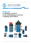 f KRAUS & NAIMER BLUE LINE SWITCHGEAR www.krausnaimer.com Catalog 100 CL Switches 10 A-20 A C, CA, CAD Switches 10 A-315 A L Switches 350 A-2400 A SINCE 1907 KRAUS & NAIMER The development of the Blue Line rotary switch, contactor and motor starter product ranges is based on more than seventy-five years experience by Kraus & Naimer in the design and manufacture of electrical switchgear. Kraus & Naimer pioneered the introduction of the cam operated rotary switch and continues to be recognized as the world leader in that product field. BLUE LINE Blue Line products are protected by numerous patents throughout the industrial world. They are built to national and international standards and designed to withstand adverse temperatures and climates. Blue Line products are accepted and universally recognized for their quality and workmanship. They are supported by a worldwide sales and service organization. The Kraus & Naimer Registered Trademark f WORLDWIDE SYMBOL FOR QUALITY SWITCHGEAR Disconnectors and Main Switches acc. to IEC 60947-3 see Catalog 500 Contents Page Construction Data 2 Dimensions and Nominal Ratings 3 How to order 4, 5 Switch Function and Configuration CL Switches 10 A-20 A C, CA and CAD Switches 10 A-315 A ON/OFF Switches Double-throw Switches General Application Switches Coding Switches Multi-step Switches Voltmeter Switches Ammeter Switches Volt-ammeter Switches Control Switches Motor Switches 6, 7 8-10 10 11 12-14 15-17 17-19 19 19, 20 21-23 L Switches 350 A-2400 A ON/OFF Switches Double-throw Switches Multi-step Switches 24-26 26, 27 27, 28 Types of Mounting Panel Mounting Base Mounting Wall Mounting 29-33 34 35 Escutcheon Plates 36, 37 Handles 38 International Standards and Approvals 39 Technical Data 40-43 Dimensions Panel Mounting Base Mounting Wall Mounting Overall Switch Lengths Blue Line Switchgear: Summary 44-48 48, 49 50 50, 51 52 Construction Data The load switches of the C, CA, CAD and CL-series offer a solution for most cam switch applications. Different contact designs, contact materials and terminals allow for their use as control switches, instrumentation switches and motor control switches, as well as in electronic circuitry and in aggressive environments according to IEC 60947-3 and VDE 0660 part 107. CL Switches The stage is the basis for all switches and can be supplied with a maximum of 2 contacts. The terminals are accessible from the side. CA and CAD switches are supplied with open terminals to facilitate wiring and are protected against accidental finger contact according to EN 50274, VDE 0660 part 514 and BGV A2. Captive plus-minus terminal screws and integrated screwdriver guides also reduce wiring. The switches of the new CL-series are supplied with IDC terminals (Insulation Displacement Connection) instead of the conventional screw type terminals. The stripping or preparation of the insulation is no longer required. Eliminate errors due to i.e., stripped end of the conductor too long or too short, incorrect sleeves used, sleeves crimped incorrectly or wrong crimping tool is used, terminal screws not tightened properly etc. The CL switches reduce installation time by 60 %-70 % compared to the screw type terminals. This translates to significant cost savings. For connecting 2 conductors to a terminal an additional screw terminal with plus-minus screw is available. CA and CAD Switches If a positive manual operation or a higher DC rating is required, many of these switches can be fitted with a snap action latching mechanism suffix „S“ - to the switch type. The cam-operated switches L350-L2000 are continuous current rated for off-load switching. They may be used to switch resistive or low inductive loads. Special Contact Systems CA4/CA4-1 CAD11/CAD12 C Switches High contact reliability by multiple cross-point contacts, electronic compatible, CA4 with 1 µ and CA4-1 with 35 µ gold plating. H-bridge with „cross-wire“ contact system, high contact reliability also at lower voltages. CAD11 with gold-plated contacts, CAD12 with silver contact. L Switches Type Size Possible Switching Angles Max. No. of Stages CA4, CA4-1 CL4 CA10-CA25 CA10S-CA25S CAD11, CAD12 CL10 CA10B-CA25B C26, C32, C42 C26S, C32S, C42S C43, C80, C125 C315 L350/51, L630/31, L1000/01, L1250/51 L400, L600, L800, L1200, L1600, L2000 S00 S00 S0 S0 S0 S0 S1 S1 S1 S2 S3 S2 30°, 45°, 60°, 90° 30°, 45°, 60°, 90° 30°, 45°, 60°, 90° 60° 30°, 45°, 60°, 90° 30°, 45°, 60°, 90° 30°, 45°, 60°, 90° 20°, 30°, 45°, 60°, 90° 60° 20°, 30°, 45°, 60°, 90° 20°, 30°, 45°, 60°, 90° 30°, 45°, 60°, 90° 9 8 12 on request 12 10 12 12 on request 12 12 12 2 S3 30°, 45°, 60°, 90° 12 Above illustrates the standard terminal positions. Nominal Ratings Switch Size Insulation Voltage1 Thermal Current Motor Rating 3 x 380 V-440 V Ui V Iu/Ith A AC-23 kW AC-3 kW CA4 CA4-1 CL4 440 440 440 10 10 10 3 3 3 2,2 2,2 2,2 CA10 CA11 CA20 CA25 CAD11 CAD12 CL10 690 690 690 690 600 600 690 20 20 25 32 6 6 20 7,5 7,5 11 15 7,5 5,5 5,5 7,5 11 5,5 CA10B CA11B CA20B CA25B C26 C32 C42 690 690 690 690 690 690 690 20 20 25 32 32 50 63 7,5 7,5 11 15 15 22 30 5,5 5,5 7,5 11 11 15 18,5 C43 C80 C125 L350 L351 L630 L631 L1000 L1001 L1250 L1251 690 690 690 690 690 690 690 690 690 690 690 63 115 150 350 350 6302 6302 10002 10002 12502 12502 30 45 75 90 90 90 90 90 90 90 90 18,5 30 37 37 37 37 37 37 37 37 37 C315 C3163 L400 L600 L800 L1200 L1600 L2000 690 1000 690 690 690 690 690 690 315 315 500 8002 11002 14502 19002 24002 132 132 132 132 132 132 132 132 55 55 55 55 55 55 55 55 30 1.18˝sq S00 48 1.89˝sq S0 According to IEC 60947-3/VDE 0660 part 107 Type 64 2.52˝sq S1 88 3.46˝sq S2 130 5.12˝sq S3 For further technical details, refer to pages 40-43. To furnish with gold contacts and quick connects see page 4. 1 Valid for lines with grounded common neutral termination, overvoltage category III, pollution degree 3. Values for other supply systems 2 3 on request. Ambient temperature 35 °C max. Add