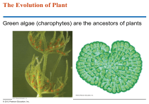 The Evolution of Plant Green algae (charophytes) are the ancestors of plants © 2012 Pearson Education, Inc. 17.1 Plants have adaptations for life on land More than 500 million years ago, the algal ancestors of plants may have carpeted moist fringes of lakes and coastal salt marshes. Plants and green algae called charophytes – are thought to have evolved from a common ancestor, – have complex multicellular bodies, and – are photosynthetic eukaryotes. – Algae do not have tissues like plants © 2012 Pearson Education, Inc. 17.1 Plants have adaptations for life on land Life on land offered many opportunities for plant adaptations that took advantage of – unlimited sunlight, – abundant CO2, and – initially, few pathogens or herbivores. © 2012 Pearson Education, Inc. 17.1 Plants have adaptations for life on land But life on land had disadvantages too. On land, plants must – maintain moisture inside their cells, to keep from drying out, – support their body in a nonbuoyant medium, – reproduce and disperse offspring without water, and – obtain resources from soil and air. © 2012 Pearson Education, Inc. 17.1 Plants have adaptations for life on land Unlike land plants, algae – generally have no rigid tissues, – are supported by surrounding water, – obtain CO2 and minerals directly from the water surrounding the entire algal body, – receive light and perform photosynthesis over most of their body, – use flagellated sperm that swim to fertilize an egg, and – disperse offspring by water. © 2012 Pearson Education, Inc. Figure 17.1C Key Vascular tissue Pollen Spores Leaf Spores Alga Surrounding water supports alga. Whole alga Leaf performs photosynthesis; absorbs Stem water, CO2, and minerals from Roots the water. Flagellated sperm Holdfast (anchors alga) Flagellated sperm Seed Flagellated sperm Stem Leaf Roots Moss Stomata only on sporophytes; primitive roots anchor plants; no lignin; no vascular tissue; fertilization requires moisture Fern Stomata; roots anchor plants, absorb water; lignified cell walls; vascular tissue; fertilization requires moisture Stem Roots Pine tree Stomata; roots anchor plants, absorb water; lignified cell walls; vascular tissue; fertilization does not require moisture 17.1 Plants have adaptations for life on land Land plants maintain moisture in their cells using – a waxy cuticle and – cells that regulate the opening and closing of stomata. Land plants obtain – water and minerals from roots in the soil and – CO2 from the air and sunlight through leaves. Growth-producing regions of cell division, called apical meristems, are found near the tips of stems and roots. © 2012 Pearson Education, Inc. 17.1 Plants have adaptations for life on land In many land plants, water and minerals move up from roots to stems and leaves using vascular tissues. – Xylem – consists of dead cells and – conveys water and minerals. – Phloem – consists of living cells and – conveys sugars. © 2012 Pearson Education, Inc. 17.1 Plants have adaptations for life on land In all plants, the – gametes and embryos must be kept moist, – fertilized egg (zygote) develops into an embryo while attached to and nourished by the parent plant, and – life cycle involves an alternation of a – haploid generation, which produces eggs and sperm, and – diploid generation, which produces spores within protective structures called sporangia. Pines and flowering plants have pollen grains, structures that contain the sperm-producing cells. © 2012 Pearson Education, Inc. Fig. 17.2 Plant diversity reflects the evolutionary history of the plant kingdom Land plants Hornworts 1 Nonvascular plants (bryophytes) Ancestral green alga Liverworts Origin of land plants (about 475 mya) Mosses 450 400 350 Millions of years ago (mya) 300 Angiosperms 0 Vascular plants 500 Origin of seed plants (about 360 mya) Seed plants 3 Lycophytes (club mosses, spike mosses, quillworts) Pterophytes or Monilophytes (ferns, horsetails, whisk ferns) Gymnosperms Seedless vascular plants 2 Origin of vascular plants (about 425 mya) 17.2 Plant diversity reflects the evolutionary history of the plant kingdom Early diversification of plants gave rise to seedless, nonvascular plants called bryophytes, including – _____, that we saw in laboratory – liverworts, and – hornworts. © 2012 Pearson Education, Inc. 17.2 Plant diversity reflects the evolutionary history of the plant kingdom These plants resemble other plants in having apical meristems and embryos retained on the parent plant, but they lack – true roots, – leaves, and – stems. © 2012 Pearson Education, Inc. Figure 17.2B Bryophytes _____ Liverwort Hornwort 17.2 Plant diversity reflects the evolutionary history of the plant kingdom About 425 million years ago, vascular plants evolved with lignin-hardened vascular tissues. The seedless vascular plants include – lycophytes (including club mosses) and – Pterophytes or monilophytes (ferns and their relatives). © 2012 Pearson Education, Inc. Figure 17.2C Seedless vascular plants fern (a pterophyte or monilophyte), spores under ____ Club moss (a lycophyte). Spores are produced in the upright tan-colored structures. 17.2 Plant diversity reflects the evolutionary history of the plant kingdom The first vascular plants with seeds evolved about 360 million years ago. A seed consists of an embryo packaged with a food supply within a protective covering. © 2012 Pearson Education, Inc. 17.2 Plant diversity reflects the evolutionary history of the plant kingdom Vascular plants with seeds include – gymnosperms (including ginkgo, cycad, and conifer species) and – angiosperms (such as flowering trees and grasses). © 2012 Pearson Education, Inc. 17.2 Plant diversity reflects the evolutionary history of the plant kingdom Gymnosperms – have naked seeds that are not produced in fruits and – include ginkgo, cycad, and conifer species. © 2012 Pearson Education, Inc. Figure 17.2D Gymnosperm