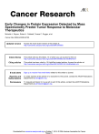 Early Changes in Protein Expression Detected by Mass Spectrometry Predict Tumor Response to Molecular Therapeutics Michelle L. Reyzer, Robert L. Caldwell, Teresa C. Dugger, et al. Cancer Res 2004;64:9093-9100. Updated version Access the most recent version of this article at: http://cancerres.aacrjournals.org/content/64/24/9093 Cited Articles This article cites by 29 articles, 14 of which you can access for free at: http://cancerres.aacrjournals.org/content/64/24/9093.full.html#ref-list-1 Citing articles This article has been cited by 10 HighWire-hosted articles. Access the articles at: http://cancerres.aacrjournals.org/content/64/24/9093.full.html#related-urls E-mail alerts Reprints and Subscriptions Permissions Sign up to receive free email-alerts related to this article or journal. To order reprints of this article or to subscribe to the journal, contact the AACR Publications Department at pubs@aacr.org. To request permission to re-use all or part of this article, contact the AACR Publications Department at permissions@aacr.org. Downloaded from cancerres.aacrjournals.org on October 7, 2014. © 2004 American Association for Cancer Research. [CANCER RESEARCH 64, 9093–9100, December 15, 2004] Early Changes in Protein Expression Detected by Mass Spectrometry Predict Tumor Response to Molecular Therapeutics Michelle L. Reyzer,1,2 Robert L. Caldwell,1,2 Teresa C. Dugger,3 James T. Forbes,3 Christoph A. Ritter,6 Marta Guix,3 Carlos L. Arteaga,3,4,5 and Richard M. Caprioli1,2,5 1 Mass Spectrometry Research Center, Departments of 2Biochemistry, 3Medicine, and 4Cancer Biology, 5Vanderbilt-Ingram Comprehensive Cancer Center, Vanderbilt University School of Medicine, Nashville, Tennessee; and 6Department of Pharmacology and Institute of Pharmacy, Peter Holtz Research Center of Pharmacology and Experimental Therapeutics, Ernst-Moritz-Arndt-Universitat Greifswald, Greifswald, Germany ABSTRACT Biomarkers that predict therapeutic response are essential for the development of anticancer therapies. We have used matrix-assisted laser desorption/ionization mass spectrometry (MALDI-MS) to directly analyze protein profiles in mouse mammary tumor virus/HER2 transgenic mouse frozen tumor sections after treatment with the erbB receptor inhibitors OSI-774 and Herceptin. Inhibition of tumor cell proliferation and induction of apoptosis and tumor reduction were predicted by a >80% reduction in thymosin 4 and ubiquitin levels that were detectable after 16 hours of a single drug dose before any evidence of in situ cellular activity. These effects were time- and dose-dependent, and their spatial distribution in the tumor correlated with that of the small-molecule inhibitor OSI-774. In addition, they predicted for therapeutic synergy of OSI-774 and Herceptin as well as for drug resistance. These results suggest that drug-induced early proteomic changes as measured by MALDI-MS can be used to predict the therapeutic response to established and novel therapies. INTRODUCTION There is an increasing number of molecule-targeted anticancer therapies, both established and in clinical development. In most cases, the tumors that are dependent on the molecular targets of these therapies and, therefore, potentially sensitive to these drugs, are not easily recognizable. Therefore, it becomes imperative to identify a molecular signature or predictive marker before or during preclinical anticancer drug development to guide this process. Such information would allow the selection of appropriate patients into efficacy studies as well as the exclusion of patients in whom these drugs are unlikely to exhibit any clinical benefit. In some cases, this predictive molecular signature is known. For example, the presence of estrogen and progesterone receptors in breast cancers predicts for response to antiestrogens (1). Clinical responses to the anti-HER2 (erbB2) humanized IgG1 trastuzumab (Herceptin) are limited to breast tumors with HER2 gene amplification (2). Likewise, gastrointestinal stromal tumors with mutations in c-Kit respond to the small molecule c-Kit tyrosine kinase inhibitor imatinib (Gleevec; ref. 3). On the other hand, recent trials with epidermal growth factor receptor (EGFR) inhibitors in unselected patients with epithelial tumors that are known to express the receptor RNA and protein have shown limited to no clinical activity (4, 5). Interestingly, two groups recently reported EGFR gene mutations in lung cancers that exhibited robust clinical responses to the EGFR tyrosine kinase inhibitor gefitinib (Iressa; refs. 6, 7), additionally underscoring the presence of molecular signatures or surrogate markers than can predict drug action. Proteomics approaches, including two-dimensional gel electrophoresis and matrix-assisted laser desorption/ionization mass spectrometry (MALDI-MS), have been shown to be powerful tools to discover biomarkers that distinguish normal from diseased tissues. Chaurand et al. (8) used MALDI-MS to directly analyze mouse colon tissue and showed that protein patterns were significantly different between tumor tissue and normal colon tissue. Several tumor-specific protein markers were identified in this work (8). Yanagisawa et al. (9) recently showed that tumor subsets of non–small-cell lung cancer give rise to unique protein patterns. They reported that MALDI-MS– derived protein profiles from human lung tissue could accurately distinguish normal lung, adenocarcinoma, squamous-cell carcinoma, and large-cell carcinoma. They also identified markers that were indicative of patient prognosis (9). In this article, we show that protein changes initiated by treatment with a small molecule inhibitor of the EGFR tyrosine kinase and/or a HER2 blocking antibody predict for cellular and clinical activity in oncogene-expressing mammary tumors. These changes can be observed as early as after 16 hours of treatment and, thus, support the use of proteomic-based approaches to potentially guide individualized anticance