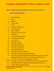 PASSING GEOGRAPHY WITH A DISTINCTION Master the following areas in geography in order to get a distinction one. MAP READING i. ii. iii. iv. v. vi. vii. viii. ix. x. xi. xii. xiii. xiv. xv. xvi. xvii. xviii. xix. xx. xxi. xxii. xxiii. xxiv. xxv. Grid Reference Area Distance Detour index Trend Bearing and Direction Vertical interval Inter-visibility Direction of flow of river Amplitude Location and hemisphere Drawing a sketch map Cross section Describing relief Describing drainage Drainage patterns/types Describing vegetation Describing settlement Describing settlement patterns Describing Transport and communication Describing Relationships between geographical aspects e.g Relief Drainage, Relief and Transport, Drainage and Settlement e.t.c Factors for the presence of geographical aspects Describing economic activities/land use types using map extract Describing problems/challenges faced by people in the areas Sample Map Reading questions STAHIZA GEOGRAPHY DEPARTMENT hilarykah@gmail.com Page 1 PHOTOGRAPHIC INTERPRETATION i. ii. iii. iv. v. vi. vii. viii. ix. Types of photographs Drawing a landscape sketch Economic activities/ land use types Relationships between geographical aspects in the photograph Formation of various features seen in the photograph Economic importance of features and land use types Problems faced by the region seen in the photograph Effects of the land use type on the environment Sample photographs and questions STAHIZA GEOGRAPHY DEPARTMENT hilarykah@gmail.com Page 2 FIELD WORK i. ii. iii. iv. v. vi. vii. viii. ix. x. xi. xii. Topic of study Objectives/Aims/Goals of the study Pre-field activities(preparation stage) Data collection (How different method are used) Advantages and disadvantages of using particular methods Problems faced during data collection Skills obtained from the field Sketches Sketch map of the area studied/Lay out Cross section/relief section/line Transect/Transverse/Catena Panoramic view (panorama) Relationships between geographical aspects (importance/findings/significances/ Conclusions) Physical –physical Physical-human Human-human Effect of land use on physical environment Follow-up activities (post field work) Recommendations STAHIZA GEOGRAPHY DEPARTMENT hilarykah@gmail.com Page 3 GENERAL SUMMARY OF GEOGRAPHY i. ii. iii. iv. v. vi. vii. viii. Drawing maps East Africa Africa Rest of Africa North American maps Rhine lands China Studying maps East Africa Africa Rest of Africa North American maps Rhine lands China Statistics How to draw a; Bar graph Line graph Combined Bar and Line Graph Pie-chart Factors favouring…… Adjective + Factor + Use of the factor + e.g Benefits/importance/contributions/positive effects/values/significances Contribution + Resultant effect/impact + e.g Problems/challenges/bottlenecks faced Problem + Resultant effect/impact + e.g Problems resulting /Negative effects Problem + Cause + e.g Solution to problems faced and resulting Mind the language use in the question (Solution + Reason + e.g) STAHIZA GEOGRAPHY DEPARTMENT hilarykah@gmail.com Page 4 MAP READING A map is a representation of physical and human features of a particular area on a sheet of paper as seen, drawn and printed from above using conventional symbols. GRID REFERENCES These are networks of lines running vertically and horizontally on the map extract. These are used to locate features on a map extract. The horizontal lines are known as Northings while vertical lines are known as Eastings. While reading grid reference, start with Eastings then Northings as illustrated below; 10 11 12 13 14 15 16 21 21 20 .X 19 20 .Z 19 18 18 17 Y. 16 17 16 10 11 12 13 14 15 16 Northings Eastings e.g X 115199 Try this; Y STAHIZA GEOGRAPHY DEPARTMENT hilarykah@gmail.com ……………… Z ….....………… Page 5 Sample question to do: Using the map extract of NABYESO, What is the grid reference of; a. Arwotcek road junction b. Ayabi bore hole What is the feature at grid reference? a. 851034 b. 801959 CALCULATING AREA ON MAP EXTRACT Area is the total distance covered or occupied by a feature. This has a Formula as Full squares + Half squares 2 Count all the fully covered boxes and then count the boxes that are partially covered by the feature. E.g 10 + 189 = 10+9 =19 squares 21 1Square 1km 19 squares X 1km = 19km2 Area = 19km2 MEASURING DISTANCE OF LINEAR OBJECTS ON A MAP EXTRACT e.g A road, railway line, river, boundary e.t.c Identify the feature in the question on the map extract. The start point and the end point Using a straight edged piece of paper, measure a short but straight distance portion of the feature up to the end point. STAHIZA GEOGRAPHY DEPARTMENT hilarykah@gmail.com Page 6 Transfer the distance of the feature marked on paper to the linear scale on the map extract starting from zero rightwards to determine the distance in kilometers. The remaining distance can be measured in meters using the same scale but from zero leftwards. E.g 6km +500 meters =6.5km DETOUR INDEX This has a formula; Actual distance – straight distance X 100 Actual distance The Actual distance is the 6.5km as obtained above. The straight distance is obtained by joining the two points in question along the linear feature like a road and then using a straight edge of a paper; get the distance of the straight line e.g 3.5km 6.5 - 3.5 x100 6.5 3.0 x100 = 46.15% 6.5 TREND This is the degree segments from the point of start to the point of end along a transport route. Identify the transport route in question and the two points asked. Draw a line to join the two points along the transport route. Draw a compass direction in the middle of the line. Using a protractor, measure from north clockwise up to when the line is met e.g 0450. Measure again from north clockwise up to when the line is met the second time. E.g 2250. It is then recorded as 0450_ 2250 CALCULATING BEARING AND DETERMINING DIRECTION ON MAP EXTRACT Bearing of one geographical feature from another is measured using a protractor s