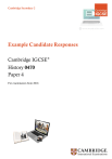 Cambridge Secondary 2 Example Candidate Responses Cambridge IGCSE® History 0470 Paper 4 For examination from 2016 In order to help us develop the highest quality Curriculum Support resources, we are undertaking a continuous programme of review; not only to measure the success of our resources but also to highlight areas for improvement and to identify new development needs. We invite you to complete our survey by visiting the website below. Your comments on the quality and relevance of Cambridge Curriculum Support resources are very important to us. https://www.surveymonkey.co.uk/r/GL6ZNJB Do you want to become a Cambridge consultant and help us develop support materials? Please follow the link below to register your interest. http://www.cie.org.uk/cambridge-for/teachers/teacherconsultants/ Cambridge International Examinations retains the copyright on all its publications. Registered Centres are permitted to copy material from this booklet for their own internal use. However, we cannot give permission to Centres to photocopy any material that is acknowledged to a third party even for internal use within a Centre. Contents Introduction 4 Assessment at a glance 6 Paper 4 – Alternative to Coursework 7 Question 4 Depth Study B: Germany, 1918–1945 9 Question 8 Depth Study D: The USA, 1919–1941 20 Question 4 Depth Study B: Germany, 1918–1945 31 Question 8 Depth Study D: The USA, 1919–1941 42 Example Candidate Responses – Paper 4 Introduction The main aim of this booklet is to show the standards for those teaching Cambridge IGCSE History (0470), and how different levels of candidates’ performance (high, middle and low) relate to the subject’s curriculum and assessment objectives. In this booklet candidate responses have been chosen to exemplify a range of answers. Each response is accompanied by a brief commentary explaining the strengths and weaknesses of the answers. . For ease of reference the following format for each component has been adopted: Question Mark scheme Example candidate response Examiner comment Each question is followed by an extract of the mark scheme used by examiners. This is then followed by examples of marked candidate responses, each with an examiner comment on performance. Comments are given to indicate where and why marks were awarded, and how additional marks could have been obtained. In this way, it is possible to understand what candidates have done to gain their marks and what they still have to do to improve their marks. This document illustrates the standard of candidate work for those parts of the assessment which help teachers assess what is required to achieve marks beyond what should be clear from the mark scheme. Some question types where the answer is clear from the mark scheme, such as short answers and multiple choice, have therefore been omitted. Past papers, Examiner Reports and other teacher support materials are available on Teacher Support at https://teachers.cie.org.uk 4 Cambridge IGCSE® History 0470 Example Candidate Responses – Paper 4 Cambridge IGCSE® History 0470 5 Example Candidate Responses – Paper 4 Assessment at a glance All candidates take three components. All candidates take Paper 1 and Paper 2, and choose either Component 3 or Paper 4. All candidates take: Paper 1 Written paper 60 marks and: 2 hours 40% Candidates answer two questions from Section A (Core Content) and one question from Section B (Depth Study) All questions are in the form of structured essays, split into three parts: (a), (b) and (c) Paper 2 Written paper 50 marks 2 hours 33% Candidates answer six questions on one prescribed topic taken from the Core Content. There is a range of source material relating to each topic. The prescribed topic changes in each examination session – see Section 4 of the syllabus Externally marked Externally marked All candidates take either: Component 3 Coursework 40 marks or: 27% Candidates produce one piece of extended writing based on a Depth Study from the syllabus or a Depth Study devised by the Centre Paper 4 Written paper – Alternative to Coursework 40 marks Candidates answer one question on a Depth Study. Externally marked Internally assessed/externally moderated 6 Cambridge IGCSE® History 0470 1 hour 27% Example Candidate Responses – Paper 4 Paper 4 – Alternative to Coursework Level descriptors In all four examples shown below – the following level descriptors apply. Cambridge IGCSE® History 0470 7 Example Candidate Responses – Paper 4 8 Cambridge IGCSE® History 0470 Example Candidate Responses – Paper 4 Question 4 Depth Study B: Germany, 1918–1945 Mark scheme Cambridge IGCSE® History 0470 9 Example Candidate Responses – Paper 4 Example candidate response – high I believe that the use of violence and terror was very important in Hitler’s consolidation of power, however it was only this, combined with other methods such as propaganda and rearmament that resulted in Hitler being able to control Germany effectively. Violence was important because it made Germans fearful, fearful of what would happen to them if they openly opposed the regime. They had seen what the SA had done to the Communists in the streets, scenes of organised violence and brutality from the Nazi Brownshirts had installed this fear into the German people. This meant that any Nazi- Skeptics, of which there were a fair amount in the years immediately following 1933 would keep their arguments against Hitler to themselves. Violence did not persuade people that Hitler was a saviour and the hero of Germany, violence was used in the police state as a means of dealing with loose ends and made sure that there was no public opposition to Nazi Germany. Violence was also important because it showed people order in the midst of political and economic instability in Germany at the time. Having previously seen politicians squabbling about which cabinet ministers are in office, the sight of the Government dealing with opposition swiftly