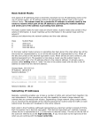 Basic Subnet Masks One aspect of IP addressing that is extremely important to how IP addressing works is the use of subnet masks. An IP address without the appropriate subnet mask is like Laurel without Hardy. The subnet mask for a particular IP address is actually used by the router to resolve which part of the IP address is providing the network address and which part of the address is providing host address. The basic subnet masks for each class are shown below. Subnet masks also consist of four octets of information. A router matches up the information in the subnet mask with the actual IP address and determines the network address and the node address. Class Subnet Mask A B C 255.0.0.0 255.255.0.0 255.255.255.0 In the basic subnet masks (where no subnetting has been done) the octet either has all the bits turned on (represented by 1s) or all the bits turned off (represented by Os). When all the bits are turned on the decimal equivalent is 255. When all bits are set to binary 0, the decimal equivalent is 0. The question is how does a router use the subnet mask to determine which part of an IP address refers to the network address. It actually uses a process called anding where it "ands" the bits in the subnet mask with the bits in the IP address to determine the network address. Subnet-Mask: 255.255.0.0 IP-Address: 180.20.5.9 Network-Address: ? Subnet Mask: 11111111 11111111 00000000 00000000 IP-Address: 10110100 00010100 00000101 00001001 -------------------------------------------------------Network-Address: 10110100 00010100 00000000 00000000 Network-Address: 180.20 Subnetting IP Addresses Basically, subnetting enables you to take a number of LAN's and connect them together into one internetwork. It also provides you with the capability to break a large network into subnets that are connected with routers. Segmenting a large network using routers allows you to maximize the bandwidth of the network because the routers keep the traffic on each subnet local; the data isn't broadcast to the entire network. Each octet in the IP address (although represented as a decimal number) consists of 8 bits. Each bit position has a decimal equivalent. That decimal equivalent isn't realized, however, unless the bit is represented as a 1 (0 bits have no decimal value). The bits on the far left of the octet are referred to as the high-order bits. If you move down to the right end of the octet you are working with the lower-order bits. Creating Subnets on a Class A Network The subnetting math is actually easiest when working with Class A and Class B networks. Let's say that you've been assigned the network address 10.0.0.0 and you need 30 subnets. In Class A networks, the first octet defines the network address. The remaining three octets provide the node address information because you have all the possible bit combinations available in 3 octets. That's 24 bit positions, so the number of node addresses available would be 2^24-2 or 16,777,214 nodes. The reason that you must subtract 2 from the possible node addresses is that you lose two possibilities because the bits in the node octets cannot be set to all 1s or 0s. When the node octets are all set to 1, that address is used to broadcast messages to all the nodes on the network-it means all nodes-and so can't be used for an actual node address.When the node octets are all set to 0, that address signifies the network wire address. In our case, if all the node octets are set to 0, you get the address 10.0.0.0, which remember is our network address, which becomes very important when you configure IP networks on a router. Creating the Network Subnet Mask We want 30 subnets, right now our network address 10.0.0.0 only supplies bits for the network address (the first octet) and bits for node addresses (the other three octets). So, how do we create subnets? We steal some bits from the node octets and use them to create the subnets (you can't steal bits from the network octet because this is provided to you by the people who assign IP networks -- it is basically cast in stone). So, will steal bits from the first node octet to create our subnets (the second octet in the 10.0.0.0 address-from left to right). This means that the possible number of node addresses is going to be decreased because you are going to take some of the bits to create subnets (with bits removed for subnets, you get less node addresses). Stealing the bits will not only let us compute ranges of IP addresses for each subnet (each of the 30 subnets will have a different range of IP addresses), but it also lets us create a new subnet mask for the entire network. This new subnet mask will let routers and other devices on the network know that you have divided the network into subnets and it will also tell them how many logical subnets have been created. But first things first, you must figure out how many bits you need to steal to come up with 30 subnets. Remember that each bit in an octet has a decimal value. For example, the first low-order bit on the far right of the octet has a decimal value of 1, the bit to its left has a value of 2 and so on. So, to create 30 subnets you add the lower order bits' decimal values until you come up with a value of 31. Why, 31 and not 30? You cannot use subnet 0, which is what you derive when we steal only the first lower-order bit. When we know how many bits it takes to create 30 subnets -- 5 bits, we can create the new subnet mask for the entire Class A network. Forget for the moment that we used lower order bits (adding from right to left) to come up with the 30 subnets. Take the first five high order bits (128, 64, 32, 16, and 8) working from left to right. Add them together: 128+64+32+16+8=248. The 248 is very important. Normally, a Class A subnet mask is 255.0.0.0. but this Class A network has been subnetted, so the new subnet mask is 255.248.0.0. This new subnet mask tells routers and other devices that this Class A network contains 30 subnets. Now 