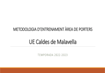 METODOLOGIA D’ENTRENAMENT ÀREA DE PORTERS UE Caldes de Malavella TEMPORADA 2022-2023 DIMENSIONS D’ENTRENAMENT TÈCNICA COMUNICACIÓ PSICOLÒGICA TÀCTICA CONDICIONAL PLANIFICACIÓ METODOLÒGICA DIMENSIÓ TÈCNICA BLOCATGE DESVIAMENT I PROLONGACIONS POSICIONAMENT BASE DESPEJES CAIGUDES JOC DE PEUS I GOLPEJOS DESPLAÇAMENTS LLANÇAMENTS DIMENSIÓ TÈCNICA: Blocatges Trobem diferents tipus de blocatges tenint en compte les alçades i la direcció de la pilota. 1- Blocatge a mijta altura (per sobre del genolls i per sota les espatlles). 2- Blocatge aèri (per sobre de les espatlles). 3- Blocatge ras (per sota els genolls). L’acció de blocatge pot èsser executada en: 1- Blocatge directe. 2- Blocatge indirecte o amb 2 temps. (parada + blocatge o parada amb bot + blocatge). Accions de blocatge amb caiguda: 1- Blocatge lateral ras. 2- Blocatge lateral a mitja altura. 3- Blocatge lateral aèri. DIMENSIÓ TÈCNICA: Posició de base La posició de base la podem definir com aquella posició on el porter està a punt d’intervenir de manera inmediata. La posició la concretem de la següent manera: 1- Flexió de cames i flexió de tronc lleugerament decantant endavant. 2- Mans exteses col·locades al costat de la cintura. 3- Puntes del peu. DIMENSIÓ TÈCNICA: Caigudes Les caigudes les utilitzem per interceptar la pilota en les accions on arribem a partir de la posició de base. Trobem les següents caigudes: 1- Caiguda lateral rasa. 2- Caiguda lateral a mitja altura. 3- Caiguda lateral aèrea. 4- Caiguda frontal. Tenim en compte tres aspectes important: 1- La cama que dona impuls ha de ser la natural (dreta si caiem al costat dret). 2- Hem d’atacar la pilota en una trajectòria en diagonal. 3- Cal anar a interceptar la pilota en dues mans i en el cas que no hi arribem sempre hi anirem amb la mà natural. 4- Utilitzem la mà canviada quan la trajectòria de la pilota és lateralment elevada. DIMENSIÓ TÈCNICA: Desplaçaments Els desplaçaments ho entenem com una de les bases tècniques més importants a treballar i perfeccionar. Trobem tres tipus de desplaçament a utilitzar: 1- Desplaçament lateral. 2- Desplaçament creuat. 3- Desplaçament posterior. La convinació d’aquestes desplaçaments és clau per poder optimiar el temps de reacció. DIMENSIÓ TÈCNICA: Desviament i prolongacions Utilitzem el desviament en les següents situacions: -SEMPRE que no tinguem opció de blocar. -Quan la trajectòria, la força o la visualització de la pilota sigui dificultosa. El desviament haurà de ser sempre en ZONES LATERALS o bé, en zones sense presència de jugadors de l’equip contrari. DIMENSIÓ TÈCNICA: Despejes Utilitzarem els despejes sempre que hi ha hagin les següents situacions: -Oposició de jugadors contraris o propis que ens dificultin el blocatge o desviament. -Situacions on s’arribi de manera justa a interceptar la pilota. Els despejes s’hauran de realitzar amb la màxima superfície plana possible dels punys, depenen de les situacions en una o dues mans. DIMENSIÓ TÈCNICA: Joc de peus i golpejos El joc de peus dels porters el limitem a 3 contactes. Per tal de parar, orientar i desplaçar. En els casos que s’hagi de conservar la pilota en situació de sortida de joc, es poden realitzar més contacte amb la pilota. En els casos de inici de joc en pilota plantada és obligatori situar la pilota en la zona central de l’àrea petita per tal de poder obtenir més sortides de joc. El golpeig en sortida de pilota jugada ha de dur-se a terme amb volea lateral, tenint en compte que és el golpeig que pot faciliar més l’arribada de la pilota a altres jugadors de l’equip. DIMENSIÓ TÈCNICA: Llançaments Els llançaments són una de les part principals per tal de poder donar una sortida ràpida al joc després d’una recuperació. També són una de les accions tècniques utilitzem per superar línies de presió en la sortida de pilota i iniciar el nostre atac. Trobem diferents tipus de llançaments: 1- Llançament mà alta. 2- Llançament lateral. 3- Llançament mà baixa. DIMENSIÓ TÀCTICA POSICIONAMENT BISECTIU POSICIONAMENT LATERAL REDUCCIÓ D'ESPAIS COBERTURA JOC A L'ÀREA I CONTROL DEL JOC DIMENSIÓ TÀCTICA POSICIONAMENT BISECTRIU -Entenem en el posicionament amb bisectiu com el posicionament bàsic dins el terreny de joc. -Per entendre de manera senzilla aquest posicionament el podem definir com “Punt intermig entre la referència dels dos pals i la pilota”. -Aquest punt canvia en funció de la posició de la pilota i cal desplaçar-se constantment per tal de poder estar correctament posicionat en aquesta zona. DIMENSIÓ TÀCTICA POSICIONAMENT LATERAL El posicionament lateral és la posició en la qual el porter es col·loca per tal de poder resposta a una jugada situada en la zona lateral del terreny de joc. La posició haurà de tenir en compte els següents aspectes. -Posició intermitja a la porteria, lleugerament decantant en la part posterior. 1- Desplaçament frontal per atacar la possible pilota en la zona 1. 2- Desplaçament lateral per atacar la possible pilota en zona 2. 3- Desplaçament creuat per atacar la possible pilota en zona 3. DIMENSIÓ TÀCTICA COBERTURA TÀCTICA La cobertura a la zona defensiva la utilitzem per poder interceptar aquestes pilotes col·locades a l’esquena de la defensa. Haurem de tenir en compte els 3 possibles punts de pressió. La posició del porter doncs haurà de ser adelantada i d’uns 10 m a camp propi i 15-20 m a camp contrari. DIMENSIÓ TÀCTICA REDUCCIÓ D’ESPAIS El concepte de reducció d’espais apareix en totes les accions en les que participa el porter, entenen com aquell espai en el qual el porter redueix la distància amb la pilota i el jugador contrari per tal de poder reduir la zona de gol a la seva porteria. En situacions d’accions d’1x1, segones jugades i xut frontal és on s’ha de treball de manera més analítica. La reducció d’espais ha de tenir 3 claus: 1- Execusió a la màxima veloci