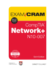 Hiva-Network.Com About This E-Book EPUB is an open, industry-standard format for e-books. However, support for EPUB and its many features varies across reading devices and applications. Use your device or app settings to customize the presentation to your liking. Settings that you can customize often include font, font size, single or double column, landscape or portrait mode, and figures that you can click or tap to enlarge. For additional information about the settings and features on your reading device or app, visit the device manufacturer’s Web site. Many titles include programming code or configuration examples. To optimize the presentation of these elements, view the e-book in single-column, landscape mode and adjust the font size to the smallest setting. In addition to presenting code and configurations in the reflowable text format, we have included images of the code that mimic the presentation found in the print book; therefore, where the reflowable format may compromise the presentation of the code listing, you will see a “Click here to view code image” link. Click the link to view the print-fidelity code image. To return to the previous page viewed, click the Back button on your device or app. CompTIA® Network+ N10-007 Sixth Edition Emmett Dulaney CompTIA® Network+ N10-007 Exam Cram Copyright © 2018 by Pearson Education, Inc. All rights reserved. No part of this book shall be reproduced, stored in a retrieval system, or transmitted by any means, electronic, mechanical, photocopying, recording, or otherwise, without written permission from the publisher. No patent liability is assumed with respect to the use of the information contained herein. Although every precaution has been taken in the preparation of this book, the publisher and author assume no responsibility for errors or omissions. Nor is any liability assumed for damages resulting from the use of the information contained herein. ISBN-13: 978-0-7897-5875-0 ISBN-10: 0-7897-5875-X Library of Congress Control Number: 2017960636 Printed in the United States of America 01 18 Trademarks All terms mentioned in this book that are known to be trademarks or service marks have been appropriately capitalized. Pearson IT Certification cannot attest to the accuracy of this information. Use of a term in this book should not be regarded as affecting the validity of any trademark or service mark. CompTIA is a registered trademark of CompTIA, Inc. Warning and Disclaimer Every effort has been made to make this book as complete and as accurate as possible, but no warranty or fitness is implied. The information provided is on an “as is” basis. The author and the publisher shall have neither liability nor responsibility to any person or entity with respect to any loss or damages arising from the information contained in this book. Special Sales For information about buying this title in bulk quantities, or for special sales opportunities (which may include electronic versions; custom cover designs; and content particular to your business, training goals, marketing focus, or branding interests), please contact our corporate sales department at corpsales@pearsoned.com or (800) 382-3419. For government sales inquiries, please contact governmentsales@pearsoned.com. For questions about sales outside the U.S., please contact intlcs@pearson.com. Editor-in-Chief Mark Taub Product Line Manager Brett Bartow Acquisitions Editor Michelle Newcomb Development Editor Ellie Bru Managing Editor Sandra Schroeder Senior Project Editor Tonya Simpson Copy Editor Barbara Hacha Indexer Erika Millen Proofreader Abigail Manheim Technical Editor Chris Crayton Publishing Coordinator Vanessa Evans Cover Designer Chuti Prasertsith Compositor codeMantra Hiva-Network.Com Contents at a Glance Introduction CHAPTER 1 Introduction to Networking Technologies CHAPTER 2 Models, Ports, Protocols, and Networking Services CHAPTER 3 Addressing, Routing, and Switching CHAPTER 4 Network Components and Devices CHAPTER 5 WAN Technologies CHAPTER 6 Cabling Solutions CHAPTER 7 Wireless Solutions CHAPTER 8 Cloud Computing and Virtualization CHAPTER 9 Network Operations CHAPTER 10 Network Security CHAPTER 11 Network Troubleshooting Glossary Index Table of Contents Introduction CHAPTER 1: Introduction to Networking Technologies Wired and Wireless Network Topologies Bus Topology Ring Topology Star Topology Wired Mesh Topology Wireless Topologies Hybrid Topologies Network Types LANs WLANs WANs MANs CANs SANs PANs IoT Technologies Z-Wave Ant+ Bluetooth NFC IR RFID 802.11 The Magic Behind 802.11n and 802.11ac A Summary of 802.11 Wireless Standards What’s Next? CHAPTER 2: Models, Ports, Protocols, and Networking Services The OSI Networking Model The OSI Seven-Layer Model Comparing OSI to the Four-Layer TCP/IP Model Identifying the OSI Layers at Which Various Network Components Operate Ports and Protocols Connection-Oriented Protocols Versus Connectionless Protocols Internet Protocol Transmission Control Protocol User Datagram Protocol File Transfer Protocol Secure File Transfer Protocol Trivial File Transfer Protocol Simple Mail Transfer Protocol Hypertext Transfer Protocol Hypertext Transfer Protocol Secure Post Office Protocol Version 3/Internet Message Access Protocol Version 4 Telnet Secure Shell Internet Control Message Protocol Network Time Protocol Lightweight Directory Access Protocol H.323 Simple Network Management Protocol Session Initiation Protocol Remote Desktop Protocol Server Message Block Understanding Port Functions ARP and RARP Network Services Domain Name Service (DNS) The DNS Namespace Types of DNS Entries DNS Records DNS in a Practical Implementation Dynamic Host Configuration Protocol The DHCP Process DHCP and DNS Suffixes DHCP Relays and IP Helpers IP Address Management Network Time Protocol What’s Next? CHAPTER 3: Addressing, Routing, and Switching IP Addressing IPv4 IP Address Classes Subnet Mask Assignment Subnetting Identifying the Differences Betwe