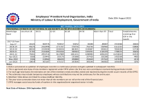 Employees' Provident Fund Organisation, India Ministry of Labour & Employment, Government of India NET PAYROLL DATA EPFO PROVISIONAL ESTIMATE OF NET PAYROLL IN AGE BUCKETS AS PER EPFO RECORDS (IN NUMBERS) Month/Age Less than 18 18-21 22-25 26-28 29-35 More than 35 Band Date 20th August 2022 Total Establishments remitting first ECR in the month 2017-18 from 41622 960776 559017 50252 30280 -89007 1552940 38363 Sep-17 2018-19 95076 2342998 1771707 578756 764746 558940 6112223 60884 2019-20 88550 2539598 2196926 882821 1190687 959812 7858394 52738 2020-21 71701 2144384 2104166 938363 1329291 1120470 7708375 46656 2021-22 75661 2954716 3417889 1661151 2288983 1836225 12234625 62535 Apr-2022 6568 259443 359170 195688 297420 302280 1420569 4485 May-2022 9106 319069 386029 208880 293659 257552 1474295 4219 Jun-2022 10019 365187 471517 265836 383246 340682 1836487 3291 Notes: 1. Data is provisional as updation of employees records is a continuous process and gets updated in subsequent month/s. 2. This is age-band wise data of new members registered under EPFO where the first non-zero contributon received during particular month. 3. For each age-wise band, the estimates are net of the members newly enrolled, exited and rejoined during the month as per records of the EPFO. 4. The estimates may include temporary employees whose contributions may not be continuous for the entire year. 5. Members' data above are linked to unique Aadhaar Identity. 6. The year-wise summation does not mean that all the members are on roll at the end of the financial year. 7. EPFO manages social security funds of workers in the organised/semi organised sector in India Next Date of Release: 20th September 2022 Page 1 of 20 Report due on 20-Aug-2022 2017-18 (from Sep-2017) Number of Number of new EPF members subscribers exited Age (a) (b) Less than 18 56945 15835 18-21 1956512 1057787 22-25 2273547 1897129 26-28 1107156 1218735 29-35 1523720 1728655 More than 35 1539524 1809648 Total 8457404 7727789 2018-19 Number of Number of new EPF members subscribers exited Age (a) (b) Less than 18 119121 30082 18-21 3466827 1652918 22-25 3639959 2992679 26-28 1740667 1976489 29-35 2445396 2793393 More than 35 2532379 2851380 Total 13944349 12296941 Page 2 of 20 Number of exited members who rejoined and resubscribed Net Payroll (c) (d) 512 41622 62051 960776 182599 559017 161831 50252 235215 30280 181117 -89007 823325 1552940 Number of exited members who rejoined and resubscribed Net Payroll (c) (d) 6037 95076 529089 2342998 1124427 1771707 814578 578756 1112743 764746 877941 558940 4464815 6112223 2019-20 Number of Number of new EPF members subscribers exited Age (a) (b) Less than 18 102287 27335 18-21 2946216 1429927 22-25 2872450 2676071 26-28 1282625 1753635 29-35 1873929 2562761 More than 35 1963176 2547185 Total 11040683 10996914 2020-21 Number of Number of new EPF members subscribers exited Age (a) (b) Less than 18 83347 18717 18-21 2309151 1050990 22-25 2090123 2215865 26-28 908664 1505811 29-35 1434322 2342131 More than 35 1723291 2649523 Total 8548898 9783037 Page 3 of 20 Number of exited members who rejoined and resubscribed Net Payroll (c) (d) 13598 88550 1023309 2539598 2000547 2196926 1353831 882821 1879519 1190687 1543821 959812 7814625 7858394 Number of exited members who rejoined and resubscribed Net Payroll (c) (d) 7071 71701 886223 2144384 2229908 2104166 1535510 938363 2237100 1329291 2046702 1120470 8942514 7708375 2021-22 Number of Number of new EPF members subscribers exited Age (a) (b) Less than 18 89352 22329 18-21 3098062 1294808 22-25 2929491 2771213 26-28 1185764 1961274 29-35 1716347 2973940 More than 35 1846047 2968188 Total 10865063 11991752 April 2022 Number of Number of new EPF members subscribers exited Age (a) (b) Less than 18 7361 1381 18-21 261905 101149 22-25 266828 224587 26-28 111950 157990 29-35 166933 242290 More than 35 194712 227563 Total 1009689 954960 Page 4 of 20 Number of exited members who rejoined and resubscribed Net Payroll (c) (d) 8638 75661 1151462 2954716 3259611 3417889 2436661 1661151 3546576 2288983 2958366 1836225 13361314 12234625 Number of exited members who rejoined and resubscribed Net Payroll (c) (d) 588 6568 98687 259443 316929 359170 241728 195688 372777 297420 335131 302280 1365840 1420569 May 2022 Number of Number of new EPF members subscribers exited Age (a) (b) Less than 18 9824 1336 18-21 302924 76905 22-25 267393 177525 26-28 109060 125440 29-35 155067 191344 More than 35 163173 180541 Total 1007441 753091 June 2022 Number of Number of new EPF members subscribers exited Age (a) (b) Less than 18 10009 718 18-21 316901 37966 22-25 282040 92058 26-28 113606 65511 29-35 162808 101172 More than 35 168897 96460 Total 1054261 393885 Page 5 of 20 Number of exited members who rejoined and resubscribed Net Payroll (c) (d) 618 9106 93050 319069 296161 386029 225260 208880 329936 293659 274920 257552 1219945 1474295 Number of exited members who rejoined and resubscribed Net Payroll (c) (d) 728 10019 86252 365187 281535 471517 217741 265836 321610 383246 268245 340682 1176111 1836487 Page 6 of 20 Report due on 20-Aug-2022 2017-18 (from Sep-2017) Number of new EPF subscribers Age (a) Less than 18 56948 18-21 1956512 22-25 2273545 26-28 1107157 29-35 1523715 More than 35 1539527 Total 8457404 Number of new EPF subscribers Age (a) Less than 18 119123 18-21 3466829 22-25 3639953 26-28 1740666 29-35 2445397 More than 35 2532381 Total 13944349 Number of new members who joined in or after Sep-2017 and exited (b) 5388 312213 344088 152817 186712 154124 1155342 2018-19 Number of exited members who rejoined and Net new EPF resubscribed Subscribers (c) (d) 206 51766 20151 1664450 27149 1956606 11486 965826 13910 1350913 9850 1395253 82752 7384814 Number of new members who joined in or after Sep-2017 and exited (b) 20903 945294 1113283 504535 621305 548147 3753467 Number of exited members who rejoined and Net new EPF resubscribed Subscribers (c) (d) 3631 101851 256225 2777760 336608 2863278