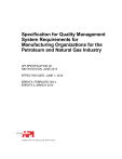 Specification for Quality Management System Requirements for Manufacturing Organizations for the Petroleum and Natural Gas Industry API SPECIFICATION Q1 NINTH EDITION, JUNE 2013 EFFECTIVE DATE: JUNE 1, 2014 ERRATA, FEBRUARY 2014 ERRATA 2, MARCH 2014 Special Notes API publications necessarily address problems of a general nature. With respect to particular circumstances, local, state, and federal laws and regulations should be reviewed. Neither API nor any of API's employees, subcontractors, consultants, committees, or other assignees make any warranty or representation, either express or implied, with respect to the accuracy, completeness, or usefulness of the information contained herein, or assume any liability or responsibility for any use, or the results of such use, of any information or process disclosed in this publication. Neither API nor any of API's employees, subcontractors, consultants, or other assignees represent that use of this publication would not infringe upon privately owned rights. Classified areas may vary depending on the location, conditions, equipment, and substances involved in any given situation. Users of this specification should consult with the appropriate authorities having jurisdiction. Users of this specification should not rely exclusively on the information contained in this specification. Sound business, scientific, engineering, and safety judgment should be used in employing the information contained herein. API is not undertaking to meet the duties of employers, service providers, or suppliers to warn and properly train and equip their employees, and others exposed, concerning health and safety risks and precautions, nor undertaking their obligations to comply with authorities having jurisdiction. Information concerning safety and health risks and proper precautions with respect to particular materials and conditions should be obtained from the employer, the service provider or supplier of that material, or the material safety datasheet. API publications may be used by anyone desiring to do so. Every effort has been made by the Institute to assure the accuracy and reliability of the data contained in them; however, the Institute makes no representation, warranty, or guarantee in connection with this publication and hereby expressly disclaims any liability or responsibility for loss or damage resulting from its use or for the violation of any authorities having jurisdiction with which this publication may conflict. API publications are published to facilitate the broad availability of proven, sound engineering and operating practices. These publications are not intended to obviate the need for applying sound engineering judgment regarding when and where these publications should be utilized. The formulation and publication of API publications is not intended in any way to inhibit anyone from using any other practices. Any manufacturer marking equipment or materials in conformance with the marking requirements of an API standard is solely responsible for complying with all the applicable requirements of that standard. API does not represent, warrant, or guarantee that such products do in fact conform to the applicable API standard. All rights reserved. No part of this work may be reproduced, translated, stored in a retrieval system, or transmitted by any means, electronic, mechanical, photocopying, recording, or otherwise, without prior written permission from the publisher. Contact the Publisher, API Publishing Services, 1220 L Street, NW, Washington, DC 20005. Copyright © 2013 American Petroleum Institute Foreword Nothing contained in any API publication is to be construed as granting any right, by implication or otherwise, for the manufacture, sale, or use of any method, apparatus, or product covered by letters patent. Neither should anything contained in the publication be construed as insuring anyone against liability for infringement of letters patent. Shall: As used in a standard, “shall” denotes a minimum requirement in order to conform to the specification. Should:As used in a standard, “should” denotes a recommendation or that which is advised but not required in order to conform to the specification. This standard shall become effective on the date printed on the cover but may be used voluntarily from the date of distribution. This document was produced under API standardization procedures that ensure appropriate notification and participation in the developmental process and is designated as an API standard. Questions concerning the interpretation of the content of this publication or comments and questions concerning the procedures under which this publication was developed should be directed in writing to the Director of Standards, American Petroleum Institute, 1220 L Street, NW, Washington, DC 20005. Requests for permission to reproduce or translate all or any part of the material published herein should also be addressed to the director. Generally, API standards are reviewed and revised, reaffirmed, or withdrawn at least every five years. A one-time extension of up to two years may be added to this review cycle. Status of the publication can be ascertained from the API Standards Department, telephone (202) 682-8000. A catalog of API publications and materials is published annually by API, 1220 L Street, NW, Washington, DC 20005. Suggested revisions are invited and should be submitted to the Standards Department, API, 1220 L Street, NW, Washington, DC 20005, standards@api.org. iii Contents Page 1 Scope . . . . . . . . . . . . . . . . . . . . . . . . . . . . . . . . . . . . . . . . . . . . . . . . . . . . . . . . . . . . . . . . . . . . . . . . . . . . . . . . . . 1 2 Normative References. . . . . . . . . . . . . . . . . . . . . . . . . . . . . . . . . . . . . . . . . . . . . . . . . . . . . . . . . . . . . . . . . . . . . 1 3 3.1 3.2 Terms, Definitions, and Abbreviations . . . . . . . . . . . . . . . . . . . . . . . . . . . . .