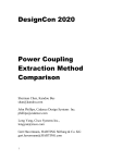 DesignCon 2020 Power Coupling Extraction Method Comparison Sherman Chen, Kandou Bus shan@kandou.com John Phillips, Cadence Design Systems Inc. phillips@cadence.com Long Yang, Cisco Systems Inc., longyan@cisco.com Gert Havermann, HARTING Stiftung & Co. KG gert.havermann@HARTING.com 1 Abstract As the density of package has grown drastically in the past decade, the cross-power-rail coupling effect becomes more and more aggravated and is no longer easy to evade. To handle this increasingly threatening problem, accurate modeling of the cross coupling, plus correct simulation methodology, is indispensable for obtaining trustable simulation result. This paper presents a full scale comparison on the models extracted using Hybrid solver and 3D solver with the focus on the coupling effect modeling. The concept of cross-rail transfer function is introduced first. Then the comparison on the Hybrid and 3D models of a 20Gbps package are presented. The coupling effects in frequency domain and time domain are plotted and analyzed. At the end, a set of designing guidelines are summarized. Author(s) Biography Sherman Shan Chen is a principle SI/PI engineer with Kandou Bus. Sherman has many years of experience and worked at EMC, Intel, and Cisco as SI or PI engineer before joining Kandou. He has a wide range of knowledge in Analogy/Power/SI/PI design for various types of systems including telecommunication, storage and computation, across board, package, and chip levels. Sherman holds an MSEE degree from Zhejiang University, China. His current research interests are SI/PI co-simulation, macromodel, and high speed bus encoding schemes. John Phillips is a principal application engineer with Cadence Design Systems prior to joining Cadence John has worked at many different companies covering such diverse market places as high end compute platforms, mil-aero. During his career he has acquired a broad knowledge of SI, PI and EMC at chip, board and system level. John holds an MSc. Degree form Bolton University, UK. His current interest are SI/PI co-simulation and modelling for both serial and parallel interfaces. Long Yang received his B.S. and M.S. degrees in Xidian University at Xi'an, China and University of Science and Technology of China, in 2001 and 2004 respectively. He started his career at Intel in 2004 as an SI engineer. Later he worked at Ansys, Amphenol-TCS and Intel. Currently he is an SUPI lead at Cisco where he is responsible for the advanced high-speed switch system design and ASIC package design. His interests include signal integrity, power integrity, highspeed interconnect modeling, Serdes modeling and characterization. Gert Havermann is Signal Integrity Engineer and has over 17 years of professional experience within the HARTING Technology Group. Gert Havermann received his Diplom-Ingenieur (FH) degree as an Engineer in Electrical Communications Engineering 2 and Microwave Technology at the University of Applied Sciences Hannover in 2001. He has significant experience with field solver based modeling of RF- and high speed interconnects, digital system simulation and development of test fixtures and Reference Designs for compliance tests. He also designed several Antennas and Sensors for UHFRFID and holds Patents in SI, Antennas and Connector Design. 3 Introduction As one of various solutions for the further extension of Moore’s law, denser packaging technologies such as 3D package, WLCSP, FOP, etc, have been introduced to the industry aiming to enable the delivery of higher throughput within same or smaller package size [1]. This trend has shown good results and is proven able to continue Moore’s law in a scale-out rather than a scale-up way[2][3]. Consequently, along with the sharply increasing circuit density, the feature size (bump size, trace width/spacing, etc.) on package substrates have been downsized from 300+um, to 100um, 30um, and now 10um[10]. Inevitably, the cross coupling between power rails on package is also increased dramatically. The distance between power rails is no longer as spacious as five years ago at which time the inter-rail coupling could normally be avoided or mitigated without much engineering effort. Nowadays in the highly compacted packages, multiple power rails are forced to be routed in very close vicinity and as a result, the inter-rail coupling can no longer be easily avoided. PI engineers must now understand how to characterize and mitigate the increasingly higher cross-rail coupling in order to assure the noise levels seen by the on-die circuits are still within spec, after accounting for all of the noise coupled from other power rails. Following a similar simulation doctrine as that used for SI, to accurately capture the cross-rail coupling effect, the first and foremost task is to obtain a sufficiently accurate PDN model. Unfortunately, the characterization of the power noise cross coupling is not straightforward, especially for highly complicated vertical structures. Frequently we see that the extracted coupling models are far off from the reality, causing either overdesign or compromised performance, or even chip failure eventually. In this area there is literature on the theory base for the analysis methodologies[4][5], and certain preliminary studies on the coupling effect have been performed[6]. Getting down to the extractor categories that are employed for coupling effect extraction, there are mainly two options: 3D solver and Hybrid solver. Traditional 3D full wave solver provides a highly accurate model, but at the expense of a huge computational cost which is often unrealistic for most companies. Meanwhile the Hybrid solver has been used in characterizing PDN for years and has provided reliable results which are well correlated to measurement. Now that the stress goes to the effects of inter-power rail coupling, can a Hybrid solver still deliver as reliable results as a 3D solver does? In this paper, we compare the PDN models extracted with a 