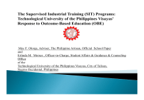 The Supervised Industrial Training (SIT) Programs: Technological University of the Philippines Visayas’ Response to Outcome-Based Education (OBE) May F. Olorga, Adviser, The Philippine Artisan, Official School Paper and Erlinda M. Moises , Officer-in-Charge, Student Affairs & Guidance & Counseling Office of the Technological University of the Philippines Visayas, City of Talisay, Negros Occidental, Philippines The Technological University of the Philippines Visayas, established in 1977 as Visayas Technician Institute, is one of the four campuses comprising the TUP system. Its 3-year Engineering Technology program leads to a 4-year Bachelor of Science in Engineering Technology and the 5- year Bachelor of Science in Electronics Communication Engineering and the Bachelor of Science in Mechanical Engineering degrees. It also offers Bachelor of Technology major in Mechatronics Technology. Ever since its inception as a prototype state school, the school allows and makes arrangements for on-the-job training of its students in private business establishments, shops, factories, warehouses and other facilities based on a joint program developed by the school and participating private entities. An industrial component phase is built in the curriculum of TUP Visayas. The 6-weeks Supervised Industrial Training (SIT) I for First Year students who satisfactorily complied their academic requirements; the 6-weeks SIT 2 for second year students who satisfactorily complied with all the second year academic requirements; and the 20-weeks SIT 3 for third year students who satisfactorily complied with all the 3rd year requirements and the first two stages of the SIT phase. Such on-the-job training programs allow the students to have a hands-on practice, besides real experiential exposure for the students to the real world of work. Moreover, not only the necessary skills are nurtured and developed by the program but also the holistic development of the knowledge, skills, and attitude of the students. The SIT Program also helps the students land a job in the world of industry, even before graduation. This presentation will discuss the Supervised Industrial Training programs of the Technological University of the Philippines Visayas and relate such with the thrusts of Outcomes-Based Education. Specifically, this paper will : A. discuss the curricular offerings of TUPVisayas; B. explain the requisites of the Supervised Industrial Training (SIT); C. present a sample list of the various companies which give the students their Supervised Industrial Training experience ; D. describe the average rating of the student in their Supervised Industrial Training; E. point out similarities of the Supervise Industrial Training with the principles of Outcome Based Education. Scope and limitation of the study Data were culled from the following offices of the Technological University of the Philippines Visayas: Registrar, Academic Affairs, and the Industrial Relations and Job Placement. Sources of said information are all considered public documents (grades, Student Handbook, SIT Booklet, SIT Directory, etc.) Thus, having such public documents, validity of data is not an issue . Related readings concerning Outcome Based Education were taken from the internet. Backgrounder Issuance of the Presidential Letter of Instruction No. 654 in January 1978 formally established the Visayas and Manila Technician Institutes as prototype state schools. Said LOI also specified that the schools should allow and make arrangements for on-the-job training of their students in private business establishments, shops, factories, warehouses and other facilities based on a joint program developed by the school and participating private concerns. Letter of Instruction (LOI) No. 79 issued by President Ferdinand E. Marcos on December 28, 1978 authorizing TUP to administer the operation of THEN Visayas Technician Institute. In 1985, pursuant to TUP Implementing Order No. 85-15, the Visayas Technician Institute was renamed the TUP Visayas campus. TUP Visayas is situated in Talisay City, Negros Occidental with a branch located in Sagay City. The academic offerings of TUP Visayas campus are in the 3-year Technology courses, Bachelor degrees, and Master degrees in Management and Technology. MISSION. The Technological University of the Philippines Visayas ,as the center of excellence in technological education and training, is committed to be a vibrant catalyst of change for the industrial development of the country by exploring more demand –driven, relevant and sustainable pioneering programs. It will continue to nurture its students to develop proper knowledge, skills and attitudes required in the global economic environment. It will ensure its lead role at the cutting edge of technological education through vigorous pursuits in research and extension programs. VISION The Technological University of the Philippines will be the center of excellence in technological education and training. It will be managed by highly trained, dynamic, productive personnel to produce globally competitive and values-oriented graduates. Provide higher and advanced technological education and training which will set the leadership in the technical ,industrial , technological and related professional fields. Provide a stream of trained manpower , highly qualified and competent in technical skills , as an approach to matching manpower needs in the region and the nation. Pursue research and development programs dovetailed to national priorities. Complement efforts in the transfer of technology to the countryside through extension services to balance access to education and training opportunities. TUPVISAYAS CURRICULAR OFFERINGS TUPVisayas offers four degree programs, three of which are technician based, namely the 5- year Bachelor of Science in Electronics Engineering (BSSECE), 5-yearBachelor of Science in Mechanical Engineering, and the 4-year Bachelor of Science in Engineering 