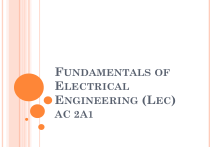 FUNDAMENTALS OF ELECTRICAL ENGINEERING (LEC) AC 2A1 Course Outline 1. DC/AC Sources and Electrical Circuit Components, Voltage and Current Laws 2. Nodal and Mesh Analysis a. General nodal analysis b. General mesh analysis 3. Circuit Analysis Techniques a. Linearity and superposition b. Source transformation c. Thevenin and Norton equivalent circuits d. Maximum power transfer e. Delta-wye conversion f. Circuits with controlled sources and the ideal op amp 4. Characteristics of Energy-storing Elements a. Capacitors and capacitance b. Inductors and inductance 5. Analysis of RL and RC Circuits a. Source-free RL and RC circuits b. Driven RL and RC circuits 6. Analysis of RLC circuits a. Source-free series and parallel RLC circuits b. Complete response of RLC circuits 7. Sinusoidal Steady-state Analysis in the Frequency Domain a. The phasor concept and phasor diagram b. Concept of Impedance and admittance c. Nodal and mesh analysis DC/AC SOURCES AND ELECTRICAL CIRCUIT COMPONENTS, VOLTAGE CURRENT LAWS AND OHM’S LAW I=V/R Georg Simon Ohm (1787-1854) I = Current (Amperes) (amps) V = Voltage (Volts) R = Resistance (ohms) How you should be thinking about electric circuits: Current: the actual “substance” that is flowing through the wires of the circuit (electrons!) How you should be thinking about electric circuits: Voltage: a force that pushes the current through the circuit (in this picture it would be equivalent to gravity) How you should be thinking about electric circuits: Resistance: friction that impedes flow of current through the circuit (rocks in the river) WHICH OF THIS WOULD WORK? THE CENTRAL CONCEPT: CLOSED CIRCUIT circuit diagram Scientists usually draw electric circuits using symbols; cell lamp switch wires SIMPLE CIRCUITS Series circuit All in a row 1 path for electricity 1 light goes out and the circuit is broken . Nodal and Mesh Analysis Parallel circuit Many paths for electricity 1 light goes out and the others stay on DIRECT CURRENT When the current in a circuit has a constant direction, the current is called direct current. Most of the circuits analyzed will be assumed to be in steady state, with constant magnitude and direction. Because the potential difference between the terminals of a battery is constant, the battery produces direct current. The battery is known as a source of emf. ELECTROMOTIVE FORCE electromotive force (emf), e, of a battery is the maximum possible voltage that the battery can provide between its terminals. The The emf supplies energy, it does not apply a force. The battery will normally be the source of energy in the circuit. The positive terminal of the battery is at a higher potential than the negative terminal. We consider the wires to have no resistance. INTERNAL BATTERY RESISTANCE If the internal resistance is zero, the terminal voltage equals the emf. In a real battery, there is internal resistance, r. The terminal voltage, DV = e – Ir The emf is equivalent to the open-circuit voltage. This is the terminal voltage when no current is in the circuit. This is the voltage labeled on the battery. The actual potential difference between the terminals of the battery depends on the current in the circuit. Section 28.1 LOAD RESISTANCE The terminal voltage also equals the voltage across the external resistance. This external resistor is called the load resistance. In the previous circuit, the load resistance is just the external resistor. In general, the load resistance could be any electrical device. These resistances represent loads on the battery since it supplies the energy to operate the device containing the resistance. Section 28.1 POWER The total power output of the battery is P = I ΔV = I ε This power is delivered to the external resistor (I 2 R) and to the internal resistor (I2 r). P = I2 R + I2 r The battery is a supply of constant emf. The battery does not supply a constant current since the current in the circuit depends on the resistance connected to the battery. The battery does not supply a constant terminal voltage. Section 28.1 RESISTORS IN SERIES When two or more resistors are connected end-toend, they are said to be in series. For a series combination of resistors, the currents are the same in all the resistors because the amount of charge that passes through one resistor must also pass through the other resistors in the same time interval. The potential difference will divide among the resistors such that the sum of the potential differences across the resistors is equal to the total potential difference across the combination. Section 28.2 RESISTORS IN SERIES, CONT Currents are the same I = I1 = I2 Potentials add ΔV = V1 + V2 = IR1 + IR2 = I (R1+R2) Consequence of Conservation of Energy The equivalent resistance has the same effect on the circuit as the original combination of resistors. Section 28.2 EQUIVALENT RESISTANCE – SERIES Req = R1 + R2 + R3 + … The equivalent resistance of a series combination of resistors is the algebraic sum of the individual resistances and is always greater than any individual resistance. If one device in the series circuit creates an open circuit, all devices are inoperative. Section 28.2 EQUIVALENT RESISTANCE – SERIES – AN EXAMPLE All three representations are equivalent. Two resistors are replaced with their equivalent resistance. Section 28.2 SOME CIRCUIT NOTES A local change in one part of a circuit may result in a global change throughout the circuit. For example, changing one resistor will affect the currents and voltages in all the other resistors and the terminal voltage of the battery. In a series circuit, there is one path for the current to take. In a parallel circuit, there are multiple paths for the current to take. Section 28.2 RESISTORS IN PARALLEL The potential difference across each resistor is the same because each is connected directly across the battery terminals. ΔV = ΔV1 = ΔV2 A junction is a point where the current can split. The current, I, that enters junction