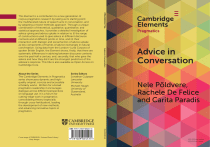 Advice in Conversation https://doi.org/10.1017/9781009053617 Published online by Cambridge University Press Cover image: K TSDESIGN / Science Photo Library / Getty Images Series Editors Jonathan Culpeper Lancaster University Michael Haugh University of Queensland, Australia Pragmatics Advice in Conversation About the Series The Cambridge Elements in Pragmatics series showcases dynamic and highquality original, concise and accessible scholarly works. Written for a broad pragmatics readership it encourages dialogue across different perspectives on language use. It is a forum for cutting-edge work in pragmatics: consolidating theory (especially through cross-fertilization), leading the development of new methods, and advancing innovative topics in pragmatics. Põldvere et al. This Element is a contribution to a new generation of corpus pragmatics research by taking as its starting point the multifaceted nature of speech acts in conversation, and by adopting a mixed-methods approach. Through a unique combination of theoretical, qualitative, quantitative, and statistical approaches, it provides a detailed investigation of advice-giving and advice uptake in relation to (i) the range of constructions used to give advice in different discourse contexts and at different points in time, and (ii) their interaction with dialogic and social factors of advice uptake as key components of frames of advice exchanges in natural conversation. Using data from the London–Lund Corpora of spoken British English, the Element shows, firstly, that there are systematic differences in advising between discourse contexts over the past half a century, and, secondly, that who gave the advice and how they did it are the strongest predictors of the advisee’s response. This title is also available as Open Access on Cambridge Core. Nele Põldvere, Rachele De Felice and Carita Paradis ISSN 2633-6464 (online) ISSN 2633-6456 (print) https://doi.org/10.1017/9781009053617 Published online by Cambridge University Press Elements in Pragmatics edited by Jonathan Culpeper Lancaster University Michael Haugh University of Queensland, Australia ADVICE IN CONVERSATION https://doi.org/10.1017/9781009053617 Published online by Cambridge University Press Corpus Pragmatics Meets Mixed Methods Nele Põldvere Lund University and University of Oslo Rachele De Felice University College London Carita Paradis Lund University Shaftesbury Road, Cambridge CB2 8EA, United Kingdom One Liberty Plaza, 20th Floor, New York, NY 10006, USA 477 Williamstown Road, Port Melbourne, VIC 3207, Australia 314–321, 3rd Floor, Plot 3, Splendor Forum, Jasola District Centre, New Delhi – 110025, India 103 Penang Road, #05–06/07, Visioncrest Commercial, Singapore 238467 Cambridge University Press is part of Cambridge University Press & Assessment, a department of the University of Cambridge. We share the University’s mission to contribute to society through the pursuit of education, learning and research at the highest international levels of excellence. www.cambridge.org Information on this title: www.cambridge.org/9781009054515 DOI: 10.1017/9781009053617 © Nele Põldvere, Rachele De Felice and Carita Paradis 2022 https://doi.org/10.1017/9781009053617 Published online by Cambridge University Press This work is in copyright. It is subject to statutory exceptions and to the provisions of relevant licensing agreements; with the exception of the Creative Commons version the link for which is provided below, no reproduction of any part of this work may take place without the written permission of Cambridge University Press. An online version of this work is published at doi.org/10.1017/9781009053617 under a Creative Commons Open Access license CC-BY-NC-ND 4.0 which permits re-use, distribution and reproduction in any medium for non-commercial purposes providing appropriate credit to the original work is given. You may not distribute derivative works without permission. To view a copy of this license, visit https://creative commons.org/licenses/by-nc-nd/4.0 All versions of this work may contain content reproduced under license from third parties. Permission to reproduce this third-party content must be obtained from these third-parties directly. When citing this work, please include a reference to the DOI 10.1017/9781009053617 First published 2022 A catalogue record for this publication is available from the British Library. ISBN 978-1-009-05451-5 Paperback ISSN 2633-6464 (online) ISSN 2633-6456 (print) Cambridge University Press & Assessment has no responsibility for the persistence or accuracy of URLs for external or third-party internet websites referred to in this publication and does not guarantee that any content on such websites is, or will remain, accurate or appropriate. Advice in Conversation Corpus Pragmatics Meets Mixed Methods Elements in Pragmatics DOI: 10.1017/9781009053617 First published online: October 2022 Nele Põldvere Lund University and University of Oslo Rachele De Felice University College London Carita Paradis Lund University https://doi.org/10.1017/9781009053617 Published online by Cambridge University Press Author for correspondence: Nele Põldvere, nele.poldvere@englund.lu.se Abstract: This Element is a contribution to a new generation of corpus pragmatics research by taking as its starting point the multifaceted nature of speech acts in conversation, and by adopting a mixed-methods approach. Through a unique combination of theoretical, qualitative, quantitative, and statistical approaches, it provides a detailed investigation of advice-giving and advice uptake in relation to (i) the range of constructions used to give advice in different discourse contexts and at different points in time, and (ii) their interaction with dialogic and social factors of advice uptake as key components of frames of advice exchanges in natural conversation. Using data from the London–Lund Corpora of spoken British English, the Element shows, firstly