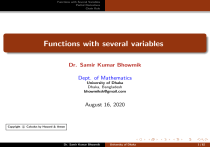 Functions with Several Variables Partial Derivatives Chain Rule Functions with several variables Dr. Samir Kumar Bhowmik Dept. of Mathematics University of Dhaka Dhaka, Bangladesh bhowmiksk@gmail.com August 16, 2020 Copyright c Calculus by Howard & Anton Dr. Samir Kumar Bhowmik University of Dhaka 1 / 62 Functions with Several Variables Partial Derivatives Chain Rule Chapter contents 1 2 3 2 Functions with Several Variables Definition of Functions of Several Variables Limit Continuity Partial Derivatives Definitions and examples Higher Order Partial Derivatives Differential and Differentiability Chain Rule Directional Derivatives Tangent Plane Extrema of function with several variables Dr. Samir Kumar Bhowmik University of Dhaka 2 / 62 Functions with Several Variables Partial Derivatives Chain Rule Definition of Functions of Several Variables Limit Continuity Definition 3 Functions of Several Variables A function of several variables is a function where the domain D is a subset of R2 or R3 and range is a subset of R. Example The function f defined by f (x, y ) = x − y is a function of two variables x and y . Its domain is R2 and its range is R. Example x −y is a function of three variables x, y y −z 3 and z. Its domain is in a subset of R and its range is R. The function g defined by g (x, y , z) = Dr. Samir Kumar Bhowmik University of Dhaka 3 / 62 Functions with Several Variables Partial Derivatives Chain Rule Definition of Functions of Several Variables Limit Continuity Finding the Domain 4 Domain To find the domain of a function of several variables, we look for zero denominators and negatives under square roots. Example Find the domain of the function √ f (x, y ) = x −y . x +y Example Find and sketch the domain for: 1 2 f (x, y ) = x ln y . 2x g (x, y ) = . y − x2 Dr. Samir Kumar Bhowmik University of Dhaka 4 / 62 Functions with Several Variables Partial Derivatives Chain Rule Example Let f (x, y ) = f. √ Definition of Functions of Several Variables Limit Continuity y + 1 + ln(x 2 − y ). Find f (e, 0), and sketch the natural domain of Example Find and sketch the domain for the following functions, also describe the graph of the function in an xyz-coordinate system: 1 2 f (x, y ) = 1 − x − 12 y . p g (x, y ) = − x 2 + y 2 . Example Sketch the contour plot of f (x, y ) = 4x 2 + 9y 2 using level curves of height k = 0, 1, 2, 3, 4, 5. Example Describe the level surfaces f (x, y , z) = x 2 + y 2 + z 2 , g (x, y , z) = z 2 − x 2 − y 2 . Dr. Samir Kumar Bhowmik University of Dhaka 5 / 62 Functions with Several Variables Partial Derivatives Chain Rule Definition of Functions of Several Variables Limit Continuity Limits 6 Example Find the following limits: lim (xy − 2), lim (x,y )→(2,3) (sin xy − x 2 y ) and (x,y )→(−1,π) lim (x,y )→(1,0) y . x +y −1 Formal Definition of Limit Let f be defined on the interior of a circle centred at (a, b), except possibly at (a, b) itself. lim f (x, y ) = ` if for every ε > 0 there exists δ > 0 such that (x,y )→(2,3) p |f (x, y ) − `| < ε whenever 0 < (x − a)2 + (y − b)2 < δ. Example : verify that lim x =a and (x,y )→(a,b) Dr. Samir Kumar Bhowmik lim y = b. (x,y )→(a,b) University of Dhaka 6 / 62 Functions with Several Variables Partial Derivatives Chain Rule Definition of Functions of Several Variables Limit Continuity Limit Theorem 7 Operations on limits If f (x, y ) and g (x, y ) both have limits as (x, y ) approaches (a, b), then 1 lim [f (x, y ) ± g (x, y )] = (x,y )→(a,b) 2 lim [f (x, y )g (x, y )] = [ (x,y )→(a,b) 3 lim lim g (x, y ); lim g (x, y )]; (x,y )→(a,b) f (x, y ) (x,y )→(a,b) lim lim (x,y )→(a,b) f (x, y )][ (x,y )→(a,b) f (x, y ) = (x,y )→(a,b) g (x, y ) lim f (x, y ) ± lim (x,y )→(a,b) g (x, y ) , if lim g (x, y ) 6= 0. (x,y )→(a,b) (x,y )→(a,b) A polynomial in two variables x and y is a sum of cx n y m . The limit of any polynomial is found by substitution. 2x 2 y + 3xy 14 Example: lim = . 13 (x,y )→(2,1) 5xy 2 + 3y Dr. Samir Kumar Bhowmik University of Dhaka 7 / 62 Functions with Several Variables Partial Derivatives Chain Rule Definition of Functions of Several Variables Limit Continuity Limit along a Path 8 Definition A Path is a curve, like a line, a parabola and so on. Examples: The following are pathes passing through the point (a, b) : x = a, (vertical line); y = b, (horizontal line); y = g (x) where b = g (a); and x = g (y ), where a = g (b). Limit along a Path To evaluate the limit along a path y = g (x) passing through (a, b), we repalce y by g (x) and find the limit when x tends to a. When x = g (y ), we repalce x by g (y ) and find the limit when y tends to b. Example : Compute the limit along the indicated path: 1 2 y y . Path: x = 1 lim . Path: y = 0 (x,y )→(1,0) x + y − 1 (x,y )→(1,0) x + y − 1 xy xy . Path: y = x lim . Path: x = y 2 . lim (x,y )→(0,0) x 2 + y 2 (x,y )→(0,0) x 2 + y 2 lim Dr. Samir Kumar Bhowmik University of Dhaka 8 / 62 Functions with Several Variables Partial Derivatives Chain Rule Definition of Functions of Several Variables Limit Continuity Limit along a Path 9 Theorem Let lim (x,y )→(a,b) f (x, y ) = `1 along a path P1 and path P2 . If `1 6= `2 then lim lim (x,y )→(a,b) f (x, y ) = `2 along a f (x, y ) does not exist. (x,y )→(a,b) Example Evaluate xy 2 . (x,y )→(0,0) x 2 + y 4 lim Examples Do the following limits exist y 1 lim . (x,y )→(1,0) x + y − 1 xy 2 lim ? (x,y )→(0,0) x 2 + y 2 Dr. Samir Kumar Bhowmik University of Dhaka 9 / 62 Functions with Several Variables Partial Derivatives Chain Rule Definition of Functions of Several Variables Limit Continuity Very important Theorem 10 Theorem Suppose that |f (x, y ) − `| ≤ g (x, y ) for all (x, y ) in the interior of some circle centred at (a, b), except possibly at (a, b). If lim g (x, y ) = 0, then (x,y )→(a,b) lim f (x, y ) = `. (x,y )→(a,b) Example Evaluate lim x 2y . + y2 (x,y )→(0,0) x 2 Example Does (x − 1)2 ln x exist ? (x,y )