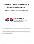 Colorado Threat Assessment & Management Protocol: Adams 12 Five Star Schools example This form was adapted with permission from the Adams County Youth Initiative’s threat assessment documents. We appreciate their excellent work and thank them for sharing. This document is intended as guidance to Colorado schools and was created with collaboration from the Threat Assessment Work Group of the Colorado School Safety Resource Center. Consultation with school legal counsel and local law enforcement is recommended. Additional consultation and template formats may also be obtained from the Colorado School Safety Resource Center, Department of Public Safety. 1|Page CSSRC 4/2019 TABLE OF CONTENTS Threat Assessment Flowchart 3 Threat Assessment Screen 4 Full Team Threat Assessment 6 Response, Management, and Support Plan 17 Threat Assessment Summary Documentation Form 22 Sample Interview Forms 23 2|Page CSSRC 4/2019 Threat Assessment Flow Chart Identify Potential Threat Secure the Safety of the School Student May Pose a Threat Convene Threat Assessment Team Team Determination Employ Threat Assessment Tools Conduct Threat Assessment Screen Student Does Not Pose a Threat Use Full Team Threat Assessment Develop RMS Plan Complete Threat Assessment Summary Documentation Form Document the Process Monitor and Adjust as Necessary 3|Page CSSRC 4/2019 Threat Assessment Screen If necessary take appropriate precautions such as detaining the student and restricting access to coats, backpacks, lockers, etc. prior to completing a Screen or Full Assessment. Complete this form and discuss with at least one other member from your Threat Assessment Team for all threats. Use this form to help determine the need for a Full Team Threat Assessment. This form is intended to be filled out electronically. Person filling out form: Date: Time: School or District Position: Last Name: School: State Assigned Student Identifier (SASID): Date of Birth: Grade: Does the student have an IEP?* Does the student have a 504? First Name: District Assigned Student Identifier: Age: Identified Gender: ☐Yes ☐No Is discipline history ☐Yes included? ☐Yes ☐No Physical Description or Attach Photo: *If the student has an IEP, consider also consulting with someone from the IEP team. ☐No Describe in detail the situation that prompted the Threat Assessment: Date of Incident: Time of Incident: Location of Incident: *Take immediate precautions to notify and protect target(s) and notify parents/guardians when appropriate. Make a report to law enforcement and/or child welfare if necessary. Gather data in order to fill out information below: Yes No Need more info. Do we understand the student's motives and goals? Do we understand the student’s grievances? Have there been any communications suggesting ideas or intent to attack? Has the student shown inappropriate/concerning interest in school attacks or attackers, weapons, or incidents of mass violence? Has the student shown signs of being radicalized or researched radical groups or ideas? Has the student engaged in attack-related behaviors? Does the student have the capacity (resources or ability) to carry out the act? Access to weapons? Is the student experiencing hopelessness, desperation, or despair? Has the student communicated thoughts of suicide or self-harm? Experiencing ☐ ☐ ☐ ☐ ☐ ☐ ☐ ☐ ☐ ☐ ☐ ☐ ☐ ☐ ☐ ☐ ☐ ☐ 4|Page CSSRC 4/2019 hallucinations or delusions? Participating in counseling or therapy? Are you concerned about the student's ability to form trusting relationships with at least one responsible adult? Does the student see violence as an acceptable or desirable way to solve problems? Is the student’s conversation and "story" consistent with his/her actions? Are other people concerned about the student's potential for violence? Describe additional circumstances that might increase the likelihood of violence: ☐ ☐ ☐ ☐ ☐ ☐ ☐ ☐ ☐ ☐ ☐ ☐ Does this incident warrant the completion of a Full Team Threat Assessment as determined by at least two members of your threat assessment team? ☐Yes, continue to Full Team Threat Assessment. ☐No, develop a Response, Management, and Support Plan, hold a re-entry meeting and complete Summary Documentation Form. ☐Need more info., continue to Full Team Threat Assessment or resolve unanswered or unknown questions prior to completing screen. Does the incident warrant the completion of a suicide assessment in addition to, or instead of, a threat assessment? ☐ Yes By whom : When: ☐ No By typing my full name below, I am acknowledging my participation in this Threat Assessment Screen: Please type First and Last Name Please type First and Last Name Title Title Please type First and Last Name Please type First and Last Name Title Date Screen Completed: Title Time: Please print, obtain signature, and keep on file according to district guidelines. This form was developed through a collaboration of school districts in Adams County, Colorado, to include Adams 1, 12, 14, 27J, and 50, with information adapted from the U.S. Department of Secret Service, Federal Bureau of Investigation, U.S. Department of Education, and the Colorado School Safety Resource Center. 5|Page CSSRC 4/2019 Full Team Threat Assessment If necessary take appropriate precautions such as detaining the student and restricting access to coats, backpacks, lockers, etc. prior to completing a Screen or Full Assessment. Use this form after completing the Threat Assessment Screen. The purpose of this form is to organize and analyze the information that has been gathered and to help the team determine a level of concern. This form is intended to be completed electronically. Student Information: Last Name: First Name: School: State Assigned Student District Assigned Identifier (SASID): Student Identifier: Date of Birth: Age: Grade: Identified Gender: Does the student have Is discipline history ☐Yes ☐No an IEP?* included? Does the stu