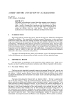 A BRIEF HISTORY AND REVIEW OF ACCELERATORS P.J. Bryant CERN, Geneva, Switzerland ABSTRACT The history of accelerators is traced from three separate roots, through a rapid development to the present day. The well-known Livingston chart is used to illustrate how spectacular this development has been with, on average, an increase of one and a half orders of magnitude in energy per decade, since the early thirties. Several present-day accelerators are reviewed along with plans and hopes for the future. 1. INTRODUCTION High-energy physics research has always been the driving force behind the development of particle accelerators. They started life in physics research laboratories in glass envelopes sealed with varnish and putty with shining electrodes and frequent discharges, but they have long since outgrown this environment to become large-scale facilities offering services to large communities. Although the particle physics community is still the main group, they have been joined by others of whom the synchrotron light users are the largest and fastest growing. There is also an increasing interest in radiation therapy in the medical world and industry has been a long-time user of ion implantation and many other applications. Consequently accelerators now constitute a field of activity in their own right with professional physicists and engineers dedicated to their study, construction and operation. This paper will describe the early history of accelerators, review the important milestones in their development up to the present day and take a preview of future plans and hopes. 2. HISTORICAL ROOTS The early history of accelerators can be traced from three separate roots. Each root is based on an idea for a different acceleration mechanism and all three originated in the twenties. 2 . 1 The main "History Line" The first root to be described is generally taken as the principal "history line", since it was the logical consequence of the vigorous physics research programme in progress at the turn of the century. Indeed, particle physics research has always been the driving force behind accelerator development and it is therefore very natural to also consider high-energy physics as the birth place. The main events along this "history line" are listed in Table 1. The line is started at the end of the last century to show the natural progression through atomic physics to nuclear physics and the inevitable need for higher energy and higher intensity "atomic projectiles" than those provided by natural radioactive sources. In this context, the particle accelerator was a planned development and it fulfilled its goal of performing the first man-controlled splitting of the atom. It was Ernest Rutherford, in the early twenties, who realised this need, but the electrostatic machines, then available, were far from reaching the necessary voltage and for a few years there was no advance. Suddenly, the situation changed in 1928, when Gurney and Gamov independently predicted tunnelling [1] and it appeared that an energy of 500 keV might just suffice to split the atom. This seemed technologically feasible to Rutherford and he immediately encouraged Cockcroft and Walton to start designing a 500 kV particle accelerator. Four years later in 1932, they split the lithium atom with 400 keV protons. This was the first fully man-controlled splitting of the atom [2] which earned them the Nobel prize in 1951. Table 1 Main"History Line' 1895 Lenard. Electron scattering on gases (Nobel Prize). 1913 Franck and Hertz excited electron shells by electron bombardment. 1906 Rutherford bombards mica sheet with natural alphas and develops the theory of atomic scattering. < 100 keV electrons. Wimshurst-type machines. 1911 Rutherford publishes theory of atomic structure. 1919 Rutherford induces a nuclear reaction with natural alphas. Natural alpha particles of several MeV ... Rutherford believes he needs a source of many MeV to continue research on the nucleus. This is far beyond the electrostatic machines then existing, but ... 1928 Gamov predicts tunnelling and perhaps 500 keV would suffice ... 1928 Cockcroft & Walton start designing an 800 kV generator encouraged by Rutherford. 1932 Generator reaches 700 kV and Cockcroft & Walton split lithium atom with only 400 keV protons. They received the Nobel Prize in 1951. Figure 1(a) shows the original apparatus, which is now kept in the Science Museum, London. The top electrode contains the proton source and was held at 400 kV, the intermediate drift tube at 200 kV and final drift tube and target at earth potential. This structure can be seen inside the evacuated glass tube in Fig. 1 above the curtained booth in which the experimenter sat while watching the evidence of nuclear disintegrations on a scintillation screen. The voltage generator, Fig. 1(b), was at the limit of the in-house technology available to Cockcroft and Walton and the design voltage of 800 kV was never reached due to a persistent spark discharge which occurred at just over 700 kV. However, the famous atom-splitting experiment was carried out at 400 kV, well within the capabilities of the apparatus. The Cockcroft Walton generator, as it became known, was widely used for many years after as the input stage (up to 800 kV) for larger accelerators, since it could deliver a high current. At about the same time Van de Graaff, an American who was in Oxford as a Rhodes scholar, invented an electrostatic generator for nuclear physics research and later in Princeton, he built his first machine, which reached a potential of 1.5 MV [3]. It took some time to develop the acceleration tube and this type of machine was not used for physics research until well after the atom had been split in 1932. The principle of this type of generator is shown in Fig. 2. (a) Accelerating column (b) DC generator Fig. 1 Cockcroft and Walton's apparatus for splitting the lithium nucleus Fig. 2 Van de Graaff electrostatic generator Two new features appeare
