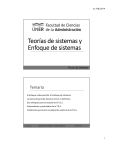 21/08/2019 Teorías de sistemas y Enfoque de sistemas Teoría de Sistemas Temario El enfoque reduccionista. El enfoque de sistemas. La Teoría General de Sistemas (T.G.S.): definición. Dos enfoques para el estudio de la T.G.S. Antecedentes y postulados de la T.G.S. Tendencias que buscan la aplicación práctica de la T.G.S. LICENCIATURA EN SISTEMAS - TEORÍA DE SISTEMAS agosto de 2019 2 1 21/08/2019 Especialización Un profesional del saber es especialista cuando ha profundizado altamente el estudio de una pequeña área del conocimiento. LICENCIATURA EN SISTEMAS - TEORÍA DE SISTEMAS agosto de 2019 3 Enfoque reduccionista o analítico La teoría reduccionista es un enfoque metodológico fundamentado en la especialización. Metodología analítica: estudia los fenómenos complejos basándose en el análisis de sus partes. Esta teoría se concentra en ir de lo general a lo particular. LICENCIATURA EN SISTEMAS - TEORÍA DE SISTEMAS agosto de 2019 4 2 21/08/2019 Enfoque reduccionista o analítico No disfrutamos de todo el espectáculo al “especializarnos”, es decir, al reducir demasiado nuestro objeto de estudio nos perdemos del panorama general. LICENCIATURA EN SISTEMAS - TEORÍA DE SISTEMAS agosto de 2019 5 Enfoque reduccionista o analítico La gran desventaja de la teoría reduccionista es generar oídos especializados de profesionales especialistas que presentan poca comunicación con otras disciplinas, producto de su saber tan particular. LICENCIATURA EN SISTEMAS - TEORÍA DE SISTEMAS agosto de 2019 6 3 21/08/2019 Enfoque de sistemas El enfoque sistémico es considerado una nueva metodología que trata los problemas como un todo; dentro de una perspectiva más amplia, integral, holística. LICENCIATURA EN SISTEMAS - TEORÍA DE SISTEMAS agosto de 2019 7 Algunas diferencias entre los enfoques LICENCIATURA EN SISTEMAS - TEORÍA DE SISTEMAS agosto de 2019 8 4 21/08/2019 Algunas diferencias entre los enfoques Enfoque Analítico Enfoque Sistémico Aísla, se concentra en los elementos Unifica y se concentra en la interacción entre los elementos Estudia la naturaleza de la interacción Estudia los efectos de las interacciones Enfatiza la precisión y los detalles Enfatiza la percepción global Modifica una variable a la vez Modifica grupos de variables simultáneamente Valida hechos por medio de pruebas experimentales dentro del cuerpo de una teoría Valida hechos a través de la comparación del comportamiento del modelo con la realidad LICENCIATURA EN SISTEMAS - TEORÍA DE SISTEMAS agosto de 2019 9 Estudio de sistemas Estudio de sistemas puede desarrollarse bajo Enfoque analítico Enfoque de sistemas LICENCIATURA EN SISTEMAS - TEORÍA DE SISTEMAS agosto de 2019 10 5 21/08/2019 Estudio de sistemas bajo enfoque analítico El análisis como método de estudio e investigación comprende básicamente tres etapas: Reducción Análisis LICENCIATURA EN SISTEMAS - TEORÍA DE SISTEMAS Síntesis agosto de 2019 11 Estudio de sistemas bajo enfoque de sistemas En una metodología sistémica los pasos consisten en: Mirar Supersistema Explicar conducta, propiedades o funciones del Supersistema LICENCIATURA EN SISTEMAS - TEORÍA DE SISTEMAS Explicar la conducta, propiedades o funciones del Sistema (Análisis) agosto de 2019 12 6 21/08/2019 Estudio de sistemas: Ejemplo Para estudiar una organización… … en primer lugar se la divide en subsistemas tales como gerencia de comercialización, gerencia de producción, gerencia de personal, entre otras; luego sigue la división en cada una de ellas pasando a las subgerencias, a los departamentos, a las secciones, a las tareas. El segundo paso consiste en explicar propiedades y funciones de cada una de esas gerencias, subgerencias, departamentos, secciones y tareas; finalmente, partiendo del conocimiento obtenido en cada una de esas partes, se sintetiza una definición de organización. Enfoque analítico … en primer lugar se trata de identificar a los sistemas que contienen a la organización: sistema económico, sistema político, sistema país, sistema región. Luego se definen las propiedades, funciones y relaciones de esos sistemas generales que contienen a la organización. Por último, se define la organización en base a sus funciones y relaciones con esos sistemas que la contienen. Enfoque sistémico LICENCIATURA EN SISTEMAS - TEORÍA DE SISTEMAS agosto de 2019 13 Relaciones y diferencias entre los enfoques para el estudio de sistemas La organización vista desde el enfoque analítico y el enfoque sistémico Comenzando con un estudio del sistema bajo el enfoque sistémico y continuando con el analítico, se obtiene una metodología exhaustiva y complementada. LICENCIATURA EN SISTEMAS - TEORÍA DE SISTEMAS agosto de 2019 14 7 21/08/2019 Mejoramiento • Ajustar el funcionamiento del sistema de modo que el comportamiento se ajuste al diseño original. Rediseño • Supone un proceso creativo, que cuestiona los supuestos sobre los cuales se diseñó el sistema bajo estudio. LICENCIATURA EN SISTEMAS - TEORÍA DE SISTEMAS Cambio Mejoramiento y Rediseño de Sistemas agosto de 2019 15 Mejoramiento de Sistemas Enfoque analítico Indagación introspectiva Lograr mayor eficiencia LICENCIATURA EN SISTEMAS - TEORÍA DE SISTEMAS agosto de 2019 16 8 21/08/2019 Diseño o Rediseño de Sistemas Enfoque de sistema Inducción y síntesis Lograr primero efectividad, luego eficiencia LICENCIATURA EN SISTEMAS - TEORÍA DE SISTEMAS agosto de 2019 17 Teoría General de Sistemas (T.G.S.) El enfoque de sistemas se fundamenta en la Teoría General de Sistemas (T.G.S.). Esta metodología se basa en el análisis de los fenómenos como totalidades constituidas por partes interactuantes entre sí (Sistemas). La T.G.S es una ciencia general de la “totalidad”. Presenta una base metodológica contraria al enfoque reduccionista. En la T.G.S. los objetos de estudio son y se tratan como Sistemas. LICENCIATURA EN SISTEMAS - TEORÍA DE SISTEMAS agosto de 2019 18 9 21/08/2019 Teor