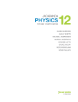 JACARANDA PHYSICS FOR NSW | FOURTH EDITION 12 KAHNI BURROWS DAN O’KEEFFE MICHAEL ANDRIESSEN MURRAY ANDERSON GRAEME LOFTS BRUCE MCKAY PETER PENTLAND ROSS PHILLIPS Fourth edition published 2018 by John Wiley & Sons Australia, Ltd 42 McDougall Street, Milton, Qld 4064 First edition published 2001 Second edition published 2003 Third edition published 2008 Typeset in 11/14 pt Time LT Std © Michael Andriessen, Peter Pentland, Richard Gaut and Bruce McKay 2001 © Michael Andriessen, Peter Pentland, Richard Gaut, Bruce McKay and Jillian Tacon 2003 © Michael Andriessen, Peter Pentland, Richard Gaut, Bruce McKay, Jillian Tacon and Upgrade Business Systems (Ric Morante) 2008 © Murray Anderson, Michael Andriessen, Kahni Burrows, Graeme Lofts, Bruce McKay, Dan O’Keeffe, Peter Pentland and Ross Phillips 2018 The moral rights of the authors have been asserted. ISBN: 978-0-7303-5648-6 Reproduction and communication for educational purposes The Australian Copyright Act 1968 (the Act) allows a maximum of one chapter or 10% of the pages of this work, whichever is the greater, to be reproduced and/or communicated by any educational institution for its educational purposes provided that the educational institution (or the body that administers it) has given a remuneration notice to Copyright Agency Limited (CAL). Reproduction and communication for other purposes Except as permitted under the Act (for example, a fair dealing for the purposes of study, research, criticism or review), no part of this book may be reproduced, stored in a retrieval system, communicated or transmitted in any form or by any means without prior written permission. All inquiries should be made to the publisher. Trademarks Jacaranda, the JacPLUS logo, the learnON, assessON and studyON logos, Wiley and the Wiley logo, and any related trade dress are trademarks or registered trademarks of John Wiley & Sons Inc. and/or its affiliates in the United States, Australia and in other countries, and may not be used without written permission. All other trademarks are the property of their respective owners. Front cover image: © sakkmesterke/Shutterstock Illustrated by various artists, diacriTech and Wiley Composition Services Typeset in India by diacriTech Printed in Singapore by C.O.S. Printers Pte Ltd 10 9 8 7 6 5 4 3 2 1 All activities have been written with the safety of both teacher and student in mind. Some, however, involve physical activity or the use of equipment or tools. All due care should be taken when performing such activities. Neither the publisher nor the authors can accept responsibility for any injury that may be sustained when completing activities described in this textbook. CONTENTS About eBookPLUS .................................................................................................................................................................................................. vii Acknowledgements ................................................................................................................................................................................................. viii 1 Projectile motion 1 1.1 Overview..................................................................................................................................................................................................... 1 1.2 Falling under gravity .............................................................................................................................................................................. 1.3 Projectile motion ..................................................................................................................................................................................... 2 7 1.4 Projection at an angle ........................................................................................................................................................................... 14 1.5 Review ......................................................................................................................................................................................................... 21 2 Circular motion 27 2.1 Overview..................................................................................................................................................................................................... 27 2.2 Uniform circular motion ........................................................................................................................................................................ 28 2.3 Providing centripetal force .................................................................................................................................................................. 34 2.4 Non-uniform circular motion .............................................................................................................................................................. 42 2.5 Rotational kinematics and dynamics .............................................................................................................................................. 45 2.6 Review ......................................................................................................................................................................................................... 52 3 Motion and gravitational fields 59 3.1 Overview..................................................................................................................................................................................................... 59 3.2 Explaining the solar system ................................................................................................................................................................ 60 3.3 Newton’s Law of Universal Gravitation ........................................................................................