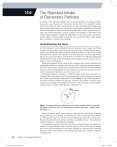 12.6 The Standard Model of Elementary Particles In science, some advances happen when old ideas generate new thinking. Other innovations occur because new ideas force the old ones to be discarded. In this section, you will learn why it was necessary to replace the Rutherford model of the atom with the Bohr model. You will discover how a deeper examination of the atom revealed that matter is made up of much more than just electrons, protons, and neutrons. You will learn about the concepts of matter and antimatter as described in one model of particle physics. Finally, the information in this section may cause you to wonder when it will be possible to describe our vast universe with a single unified theory of physics, or theory of everything. Understanding the Atom In 1909, physicist Ernest Rutherford and his students, Hans Geiger and Ernest Marsden, set out to learn more about the inner structure of atoms. During experiments, they aimed high-speed, positively charged particles at a thin sheet of gold foil. Rutherford and his team expected most of the particles to pass through the foil. Instead, they discovered that a small number of particles were deflected. Rutherford realized that this result meant that all the positive charge in an atom must be concentrated in a very small volume. Rutherford suggested that the atom is like a miniature solar system, with electrons orbiting the nucleus just as planets orbit the Sun. This is called the planetary model of the atom. The electrons in the planetary model are not stationary. The electrons must move in orbits to avoid “falling” into the nucleus as a result of the electric force. The model also proposed that they could move in any orbit. The charge carried by a proton is 1e, and the charge carried by an electron is 2e. Therefore, the total charge carried by a hydrogen atom, which contains one electron and a nucleus consisting of a single proton, is zero (Figure 1). The total charge of neutral atoms of all other elements is also zero. Therefore, the number of protons in the nucleus must be equal to the number of electrons in the neutral atom. This number, called the atomic number of the element, is denoted by Z. proton FE electron e e Figure 1 According to Rutherford’s planetary model of the atom, electrons orbit the nucleus under the influence of the electric force. In a hydrogen atom, an electron with charge 2e orbits a proton with charge 1e. Nearly all atomic nuclei contain protons and neutrons. Protons are positively charged particles, so according to Coulomb’s law, two or more protons collected in a tiny space the size of an atomic nucleus should repel each other and fly apart. Researchers now know that protons experience an additional force—what physicists call the strong force—that holds them together. The neutron is a particle with a zero net electric charge. Protons are attracted to neutrons by this additional force. Since the neutrons do not have electric charge, they do not repel the protons or each other through the Coulomb force. Neutrons help make nuclei more stable by contributing to the strong force without a repulsive Coulomb force. 644 Chapter 12 • Quantum Mechanics 8160_CH12_p644-677.indd 644 NEL 4/30/12 11:15 AM Problems with the Planetary Model Calculations with the planetary model initially attempted to use Newtonian mechanics to describe the atom. However, some fundamental problems with this model were soon apparent. The biggest problem is the stability of an electron orbit. Maxwell’s classical theory of electromagnetism predicts that an electron emits electromagnetic radiation when it orbits a proton. The radiation carries away energy. If the electron in a hydrogen atom loses energy in this way, Newtonian mechanics predicts that it will spiral inward to the nucleus (Figure 2). According to classical physics, an atom in Rutherford’s model is, by nature, unstable. If this model were correct, all atoms would collapse, which is not the case. Physicists were unable to modify the planetary model to make the atoms stable. electron proton Figure 2 The problem with the planetary model of the atom is that the radiation emitted by an orbiting electron predicted by Maxwell’s theory would result in the electron losing energy and spiralling into the nucleus. The Bohr Model of the Atom Investigation 12.6.1 Laser Simulation (page 657) Try the simulation of how a laser works in Investigation 12.6.1 to get a better understanding of energy levels as well as how quantum mechanics is applied in technologies. NEL 8160_CH12_p644-677.indd 645 Shortly after Rutherford published his model of the atom, a young Danish physicist named Niels Bohr began to study the problems associated with the planetary model. Bohr proposed a quantum-mechanical approach to the motion of electrons within the atom. He was inspired by the Planck–Einstein introduction of quanta into the theory of electromagnetic radiation. As a result, he proposed a theory about the motion of electrons within atoms. Bohr’s theory went against the well-established classical laws of mechanics and electromagnetism. Bohr proposed that an electron in an atom can have only certain orbits with particular values for the radius of each orbit. This was in contrast to the Rutherford model, in which an electron could orbit at any radius. The Bohr model requires that a whole-number multiple of electron wavelengths equal the circumference of an orbit. If this condition is not met, then the Bohr model does not allow the orbit. The special values of the orbital radius meant that the electron could only have special values of potential energy and kinetic energy. The total energy could take on only certain discrete, quantized values. Each value of energy corresponds to what is now called an energy level. According to Bohr, when an electron is in an allowed orbit, it does not radiate energy. An electron will emit a single photon when it moves from a higher energy level to a lower ener