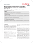 Medicine ® Clinical Case Report OPEN Axillary lymph node metastasis as the first manifestation of male occult breast cancer A Case Report Xinyu Wang, MD, Liwen Fan, MD, Wenxing Yan, MD, Qi Zhang, MD, Shunchao Bao, MD, ∗ Ying Wang, MD, Xin Bao, MD, Linlin Liu, MD Abstract Rational: Occult breast cancer (OBC) is an extremely rare breast cancer and is defined by the presence of axillary metastasis without a primary tumor in the breasts or any abnormality on radiologic examination. Downloaded from https://journals.lww.com/md-journal by BhDMf5ePHKav1zEoum1tQfN4a+kJLhEZgbsIHo4XMi0hCywCX1AWnYQp/IlQrHD31kf1ZzWr4XuOmTi7V7PIxm0d20eG/leNWaqLe5iCcb8PXCQsOSKPiA== on 10/06/2020 Patient concerns: This case report presents a 49-year-old man who was diagnosed with male OBC, which first manifested as an axillary lymph node metastasis followed by the emergence of infraclavicular lymph node metastasis. Neither the breast nor other organs had any abnormality. Diagnosis: The pathological examination revealed metastatic adenocarcinoma. Immunohistochemical (IHC) staining results were positive for estrogen receptor (ER), progesterone receptor (PR), and gross cystic disease fluid protein-15 (GCDFP-15); and negative for human epidermal receptor-2 (Her-2) 1+, cytokeratin (CK) 7, CK20, and thyroid transcription factor-1 (TTF-1). Interventions: The patient underwent left axillary lymph node dissection but not a mastectomy. After the operation, the patient subsequently underwent chemotherapy, radiotherapy, and endocrinotherapy. Outcomes: Currently, he has been followed-up for >4 years without any signs of recurrence. Lessons: Careful physical and imaging examinations combined with pathological analysis are essential in the diagnosis of male OBC. Early surgery remains the primary treatment. Abbreviations: ALND = axillary lymph node dissection, CK = cytokeratin, ER = estrogen receptor, FBC = female breast cancer, GCDFP-15 = gross cystic disease fluid protein-15, Her-2 = human epidermal receptor-2, IHC = immunohistochemial, MBC = male breast cancer, OBC = occult breast cancer, PR = progesterone receptor, TTF-1 = thyroid transcription factor-1. Keywords: axillary lymph node dissection, male, occult breast cancer middle-aged man and aimed to explore and discuss the clinical and pathological characteristics and treatment of this rare type of breast cancer. 1. Introduction Male breast cancer (MBC) is a rare disease that accounts for <1% of all breast cancers and <1% of all male cancers. [1] Male occult breast cancer (OBC) is an extremely rare type of MBC without any symptoms in either breasts. Similar to female OBC, male OBC is normally detected by palpable masses in the axilla. Because of the rarity of male OBC, no randomized controlled trial has been published, and little is known about the accuracy of its diagnosis, clinical characteristics, and standard treatments. Here, we report a case of male OBC that was diagnosed in a 2. Case report A 49-year-old man accidentally discovered a painless quail eggsized mass in his left axilla in November 2013 and visited a local hospital for a medical checkup. A breast ultrasonography (US) examination revealed multiple hypoechoic solid masses in the left axilla, with the largest mass measuring 2.6 1.3 cm in diameter. Color Doppler US showed that the mass had internal vascularity. Neither breast had any abnormality. The first-stage diagnosis was multiple hypoechoic solid masses in the left axilla. He was then referred to the breast surgical clinic at our hospital for further examination and treatment. Physical examination revealed a rigid, mobile, painless mass in his left axilla, measuring approximately 4 3 cm in diameter, whereas the other side’s axilla and both breasts were normal. On November 27, 2013, the patient underwent left axillary mass resection to make an accurate diagnosis. After 7 days, the pathological examination revealed metastatic adenocarcinoma. Immunohistochemical (IHC) staining results were positive for estrogen receptor (ER), progesterone receptor (PR), and gross cystic disease fluid protein-15 (GCDFP-15) and negative for human epidermal receptor-2 1+ (Her-2 1+), cytokeratin (CK) 7, CK20, and thyroid transcription factor-1 (TTF-1). The patient Editor: N/A. The authors declare no funding or conflicts of interest. Department of Radiotherapy, The Second Hospital of Jilin University, Changchun, Jilin Province, China. ∗ Correspondence: Linlin Liu, Department of Radiotherapy, The Second Hospital of Jilin University, Changchun, Jilin Province, 130041, China (e-mail: 2116864820@qq.com). Copyright © 2018 the Author(s). Published by Wolters Kluwer Health, Inc. This is an open access article distributed under the terms of the Creative Commons Attribution-Non Commercial-No Derivatives License 4.0 (CCBY-NCND), where it is permissible to download and share the work provided it is properly cited. The work cannot be changed in any way or used commercially without permission from the journal. Medicine (2018) 97:50(e13706) Received: 31 August 2018 / Accepted: 22 November 2018 http://dx.doi.org/10.1097/MD.0000000000013706 1 Fan et al. Medicine (2018) 97:50 Medicine was subsequently admitted to the department of breast surgery and underwent a positron emission tomography with integrated computed tomography (PET-CT) scan of the entire body. The scan revealed several lesions with increased uptake in the left axilla and infraclavicular regions but no lesions in either breast or other organs. Although we recommended mammography, the patient declined. The patient had been smoking and drinking for >30 years, and he had neither significant medical history nor any family member who was diagnosed with cancer. In particular, he had no history of taking hormonal drugs. After consultation, the diagnosis was considered to be male OBC that first manifested as an axillary lymph node metastasis followed by the emergence of infraclavicular lymph node metastasis. On December 17, 2013, the patie