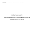 METHOD STATEMENT FOR DISLOCATION AND PROTECTION OF THE EXISTING HYDRO-ENGINEERING INSTALLATIONS Method statement for Dislocation and protection of the existing hydro-engineering installations on the E-763 Highway METHOD STATEMENT FOR DISLOCATION AND PROTECTION OF THE EXISTING HYDRO-ENGINEERING INSTALLATIONS Sadržaj 1.SCOPE OF THE WORKS AND TECHNICAL SOLUTION ......................................................................... 3 2. METHOD OF CONSTRUCTION FOR TRENCHING AND PIPE LAYING WORKS .................................... 4 2.1. Setting out of the pipeline route ............................................................................................................. 4 2.2 Trench excavation strutting .......................................................................................................................... 4 2.3 Trench de-watering if necessary ............................................................................................................. 5 2.4 Compaction of the trench bottom after excavation ............................................................................... 6 2.5 Laying the sand bedding up to the level of pipe and thumping.............................................................. 6 2.6 Pipe laying, levelling and connecting of the pipes (General) .................................................................. 6 3. INSTALLATION OF WATER SUPPLY - HDPE PIPES ....................................................................................... 7 3.1 Granular bedding ................................................................................................................................... 12 3.2 Backfilling ............................................................................................................................................... 13 3.3 Testing ......................................................................................................................................................... 13 3.4 Cleaning and disinfection of pipelines ........................................................................................................ 14 4 HEALTH AND SAFETY........................................................................................................................ 14 4.1 General requirements to health and safety .............................................................................................. 14 METHOD STATEMENT FOR DISLOCATION AND PROTECTION OF THE EXISTING HYDRO-ENGINEERING INSTALLATIONS 1.SCOPE OF THE WORKS AND TECHNICAL SOLUTION The scope of the project, and this method statement is a part of the new built E-763 highway that connects Belgrade with the South Adriatic. The dislocation of the hydro-engineering installations is a part of the subsection 4 (out of total of 5 subsections) of the project. With the construction of this sub-section of the highway, there is a need to protect the existing water supply networks that were on its way according to the projected route ot the highway. This volume deals with the protection or relocation of the hydraulic installations. The position of hydraulic installations (water supply) was determined exclusively according to the data obtained in the conditions of utility company `Komunalac` Lucani. The intersections are at the following highway stations: Municipality of Lucani - km 135+700 water pipe PEHD DN140; - km 137+847 water pipe PEHD DN110; - km 140+680 - km 141+093 water pipe PEHD DN40; - km 141+221 water pipe PVC O300; - km 142+038 water pipe PEHD DN40. The pipe material of the existing installations is mainly plastic - high density polyethylene PEHD and polyvinyl chloride PVC. All pipelines are for nominal pressures of 10 bar. The designed solution for all pipelines is similar: it is planned to lay a pipeline that will be moved to a protective pipe perpendicular to the route of the highway (the shortest crossing). On both sides of the highway,manholes are planned at 1 m outside the highway fence, and the stretch of the new water supply system in the part below the highway is in a protective pipe. The manholes contain shutters and a drain in case the section is emptied. The water from the outlet is poured into the sewer-type inspection descent, which is 0.5 m lower than the level of the discharge pipe, from where the water can be evacuated by a mobile pump. For the relocated installations, the stations of their crossing with the highway are given. In order to determine the position of the protective pipe comparations of the existing pipeline and the new pipeline are given in parallel. The levels of the dislocated waterwork pipes were determined in such a way as to maintain the direction of slope of the existing pipes, in order to avoid new drains or air valves. The direction of the slope was determined according to the elevations of the terrain. The levels of the displaced water mains were made so that the layer of earth above the pipe was not less than 1m. The direction of the pipe slope was determined according to the elevations of the terrain, but in such a way as to fit in with the existing waterwork slopes. All designed displaced pipes are made of polyethylene (PEHD) for working pressures of 10 bar, of appropriate nominal diameters. Protective pipes for water supply are intended to be made of polypropylene, DN110 mm DN500 mm designed for heavy traffic (SN16). Of the facilities at the waterworks, only manholes are planned in front of and behind the highway. Securing with anchor blocks and concrete plinths is planned at the pipeline turns and under the einforcement in the METHOD STATEMENT FOR DISLOCATION AND PROTECTION OF THE EXISTING HYDRO-ENGINEERING INSTALLATIONS manholes. On the sections of the pipeline under the highway, the backfilling of the pipes is with gravel, and on the sections in green areas it is with excavated material. 2. METHOD OF CONSTRUCTION FOR TRENCHING AND PIPE LAYING WORKS 2.1. Setting out of the pip