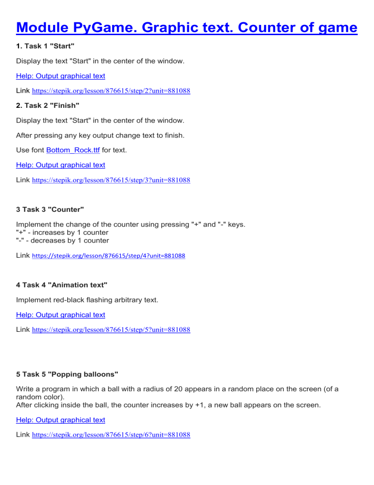Module PyGame. Graphic text. Counter of game 1. Task 1 "Start" Display the text "Start" in the center of the window. Help: Output graphical text Link https://stepik.org/lesson/876615/step/2?unit=881088 2. Task 2 "Finish" Display the text "Start" in the center of the window. After pressing any key output change text to finish. Use font Bottom_Rock.ttf for text. Help: Output graphical text Link https://stepik.org/lesson/876615/step/3?unit=881088 3 Task 3 "Counter" Implement the change of the counter using pressing "+" and "-" keys. "+" - increases by 1 counter "-" - decreases by 1 counter Link https://stepik.org/lesson/876615/step/4?unit=881088 4 Task 4 "Animation text" Implement red-black flashing arbitrary text. Help: Output graphical text Link https://stepik.org/lesson/876615/step/5?unit=881088 5 Task 5 "Popping balloons" Write a program in which a ball with a radius of 20 appears in a random place on the screen (of a random color). After clicking inside the ball, the counter increases by +1, a new ball appears on the screen. Help: Output graphical text Link https://stepik.org/lesson/876615/step/6?unit=881088 6 Task 6 "Get text for movement" Write a program to move text from top to bottom. The text for the movement must be entered in the program window Help: Output graphical text Link https://stepik.org/lesson/876615/step/7?unit=881088 7 Task 7 "Catch an apple" Write a program: 1) The apple falls from the top to the bottom along a random Y coordinate; 2) The bowl is controlled by moving the mouse along the bottom edge of the window; 3) Press "Space" when an apple into the bowl. If the apple is in the bowl counter increments by 1 and run new an apple. 4) Finish the game if the counter reaches 5. Help: Mouse events Help: Animation Help: Output graphical text Link https://stepik.org/lesson/876615/step/8?unit=881088