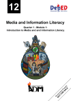 Media and Information Literacy - Senior High School Alternative Delivery Mode Quarter 1 - Module 1: Introduction to Media and Information Literacy First Edition, 2020 Republic Act 8293, section 176 states that: No copyright shall subsist in any work of the Government of the Philippines. However, prior approval of the government agency or office wherein the work is created shall be necessary for exploitation of such work for profit. Such agency or office may, among other things, impose as a condition the payment of royalty. Borrowed materials (i.e., songs, stories, poems, pictures, photos, brand names, trademarks, etc.) included in this book are owned by their respective copyright holders. Every effort has been exerted to locate and seek permission to use these materials from their respective copyright owners. The publisher and authors do not represent nor claim ownership over them. Published by the Department of Education – Region X – Northern Mindanao Regional Director: Dr. Arturo B. Bayocot, CESO V Development Team of the Module: Author: Marilou team L. Lora Development of the module Reviewers: Therese Mae C. Maandig Arian M. Edullantes Author: Marilou L. Lora Abihail L. Gimena Editors: Illustrator: Michael A. Calipusan Reviewers: Therese Mae Jay C. Maandig Arian M. Edullantes Management Team: Abihail L. Gimena Illustrator and Layout Artist: Chairperson: Jay Dr.Calipusan Arturo B. Bayocot, CESO III Michael A. Regional Director Co-Chairpersons: Dr. Victor G. De Gracia Jr., CESO V Management Team: Asst. Himaya B. SinataoRegional Director Mala Epra B. Magnaong Joel D. Potane CES, CLMD Members: Dr. Bienvenido U. Tagolimot, Jr. Regional ADM Coordinator Elson C. Jamero EPS-Designate-TLE Printed in the Philippines by Department ofthe Education - Alternative Delivery Mode –(DepEd-ADM) Printed in Philippines by: Department of Education Regional Office 10 Office Address: Zone 1, Upper Balulang Cagayan de Oro City 9000 OfficeTelefax: Address: Masterson Avenue, Upper Balulang, Zone 1, Cagayan de Oro (088) 880-7071, (088) 880-7072 E-mail Address:City, region10@deped.gov.ph Cagayan de Oro, Lalawigan ng Misamis Oriental Telefax: ________________________________________________ E-mail Address: ________________________________________________ Senior High School Media and Information Literacy Quarter 1 - Module 1: Introduction to Media and and Information Literacy This instructional material was collaboratively developed and reviewed by educators from public and private schools, colleges, and or/universities. We encourage teachers and other education stakeholders to email their feedback, comments, and recommendations to the Department of Education at action@ deped.gov.ph. We value your feedback and recommendations. Department of Education ● Republic of the Philippines Table of Contents What This Module is About ...................................................................................................I What I Need to Know............................................................................................................I How to Learn from this Module............................................................................................II Icons of this Module.............................................................................................................II What I Know .......................................................................................................................III Lesson 1: Introduction to Media and Information Literacy .......................1 What I Need to Know ...................................................................................1 What’s New: Different Kinds of Media ..........................................................2 What Is It ......................................................................................................3 What’s More: Identification of the Use of Media ...........................................3 What Is It: Definition of Terms ......................................................................4 What’s More: Case Analysis.........................................................................5 What’s New: Inventory of Media Habit, Lifestyle and Preferences...............6 What I Have Learned: Synthesizing your Learning ......................................7 What I Can Do: Online Browsing of Satirical Sites .......................................8 Lesson 2: Information Literacy ....................................................................9 What’s In ......................................................................................................9 What I Need to Know ...................................................................................9 What’s New: Situational Simulation............................................................10 What Is It: Stages/ Elements of Information Literacy .................................10 What’s More: Social Media Scenario .........................................................11 What I Have Learned: Information Ethics...................................................12 What I Can Do: Detecting Fake News Online ............................................13 Summary ...........................................................................................................................14 Assessment: (Post-Test)....................................................................................................15 Key to Answers ..................................................................................................................16 References ........................................................................................................................20 What This Module is About Welcome to the 21st Century Society! We live in a world where the quality of information we receive largely determines our choices and ensuing actions, including our capacity to enjoy fundamental freedoms and the abilit