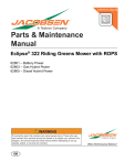 4187721-Rev B 6 5 9 11 16 15 13 7 8 18 1 - INCLUDES ITEMS 3 - 16 17 19 3 10 4 Parts & Maintenance Manual Eclipse® 322 Riding Greens Mower with ROPS 62801 – Battery Power 62803 – Gas Hybrid Power 62805 – Diesel Hybrid Power WARNING If incorrectly used, this machine can cause severe injury. Those who use and maintain this machine should be trained in its proper use, warned of its dangers, and should read the entire manual before attempting to set up, operate, adjust, or service the machine. GB When Performance Matters.™ FORWORD This manual contains adjustment, maintenance, troubleshooting instructions, and parts list for your new Jacobsen machine. This manual should be stored with the equipment for reference during operation. ® 11524 WILMAR BLVD, CHARLOTTE, NC 28273 PRODUCT OF U.S.A. Before you operate your machine, you and each operator you employ should read the manual carefully in its entirety. By following the safety, operating, and maintenance instructions, you will prolong the life of your equipment and maintain its maximum efficiency. If additional information Jacobsen Dealer. is needed, contact kg A Textron Company 1-800-848-1636 (US) kW your The serial plate is located on the rear frame rail. Jacobsen recommends you record these numbers below for easy reference. Suggested Stocking Guide To Keep your Equipment fully operational and productive, Jacobsen suggests you maintain a stock of the more commonly used maintenance items. We have included part numbers for additional support materials and training aids. To order any of the following material: 1. Write your full name and complete address on your order form. 2. Explain where and how to make shipment: ❑ UPS ❑ Regular Mail ❑ Overnight ❑ 2nd Day 3. Order by the quantity desired, the part number, and the description of the part. 4. Send or bring the order to your authorized Jacobsen Dealer. Service Parts Qty. Part No. 5002644 4183591 4216281 5001951 Description Qty. Part No. Diesel Engine Oil Filter Diesel Engine Fuel Filter Diesel Engine Air Filter Belt, Diesel Alternator - Water Pump Description 5000440 Gas Engine Oil Filter 5000436 Gas Engine Fuel Filter 5000441 Gas Engine Air Filter Service Support Material Qty. Part No. 4187720 4187721 Description Qty. Safety & Operation Manual Parts & Maintenance Manual Part No. 4222980 4222983 Description Kubota Z482 Engine Parts Manual Operator Training Video Proposition 65 Warning © Copyright 2010, Jacobsen, A Textron Company. “All rights reserved, including the right to reproduce this material or portions thereof in any form.” 2 LITHO IN U.S.A. 9-2010 This product contains or emits chemicals known to State of California to cause cancer and birth defects or other reproductive harm. Table of Contents 1 1.1 1.2 2 2.1 2.2 2.3 2.4 2.5 2.6 2.7 2.8 2.9 3 3.1 3.2 3.3 3.4 3.5 3.6 3.7 3.8 4 4.1 4.2 4.3 4.4 4.5 4.6 4.7 4.8 4.9 4.10 4.11 4.12 4.13 4.14 4.15 4.16 4.17 4.18 4.19 4.20 5 5.1 5.2 5.3 5.4 5.5 5.6 5.7 5.8 5.9 5.10 5.11 5.12 Safety Operating Safety .................................................. 4 Important Safety Notes .........................................5 Specifications Product Identification............................................ 6 Hybrid Engines .....................................................6 Hybrid Batteries ....................................................7 Battery Power Module ..........................................7 Cutting Units: ........................................................7 Mower ...................................................................7 Declaration of Conformity .....................................8 Weights and Dimensions ....................................10 Accessories & Support Literature .......................10 LCD Display LCD Display Unit (LDU) ..................................... 11 Frequency of Cut ................................................17 General Information ............................................21 System Error Codes ...........................................21 Reel Control Unit Error Codes ............................22 Traction & Steering Controller Error Codes ........26 Over-Voltage Limit Controller Error Codes .........30 Hybrid Engine Controller Error Codes ................32 Adjustments General............................................................... 34 Bedknife-To-Reel ...............................................34 Bedknife Adjustment ..........................................35 Cutting Height .....................................................35 Reel Bearing .......................................................36 Reel Stabilizer Rods ...........................................36 Armrest Height Adjustment ................................36 Armrest Pivot ......................................................37 Steering Chain Tension ......................................37 Proximity Switches .............................................37 Hood Stops .........................................................38 Lift Stops ............................................................38 Diesel Engine Alternator Belt .............................39 Headlight Adjustment .........................................39 Traction Pedal Adjustment .................................39 Grass Catcher Yoke Adjustment ........................40 Diesel Throttle Actuator Adjustment ...................40 Gas Throttle Actuator Adjustment ......................41 Torque Specification ...........................................42 Specific Torque ..................................................42 Batteries Battery Safety..................................................... 43 Battery Conditioning ...........................................43 Battery Systems .................................................45 Battery Filling (Battery Powered Mowers) ..........45 Battery Maintenance ..........................................46 Battery Performance ..........................................46 Batt