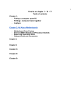 1 Final is on chapter 1 - 10 - 77 Table of contents Chapter 1: - Taking a computer apart PC - Putting a computer back together - Laptops Chapter 2: All About Motherboards - - Motherboard Form Factors Intel and AMD Chipsets and Processor Sockets Buses and Expansion Slots Onboard Ports and Connectors Chapter 3: Chapter 4: Chapter 5: Chapter 6: Chapter 9: 2 - CompTIA A+ guide ➤ Professional certs (good for 3 years) Exams: Hardware / Networking Software / Cloud 3 years pass both 3 Chapter 1: Taking a computer apart Exploring a Desktop Computer - Every IT technician should know how to take a computer apart and put it back together again Safety Backup System Steps Summary: Step 1: Gather Supplies Step 2: Open Case and Backup Data Step 3: remove Expansion Cards Step 4: Remove Motherboard Step 5: Remove the Power Supply Step 6: Remove Drives Step 1: planning and organizing your work and your tools (1 of 3) - Make Notes for backtracking - Remove loose jewelry - Stay organized by keeping small parts in one place - Don't Stack boards - Don't touch the chips - Never touch inside a computer - Watch out for sharp edges Step 1: planning and organizing your work and your tools (2 of 3) - Essential tools used by a computer hardware technician - ESD strap (ground bracelet) - Flat-head screwdriver - Phillips head - Torx screwdriver set (size T15) - Insulated tweezers - OS recovery CD or DVD or USB Step 2: Opening the case (1 of 23) - A computer case for any type of computer is sometimes called the chassis 4 - It houses the PSU, Motherboard, Processor, Memory, Expansion cards, HDD, Optical drive and other drives Can be a tower case, desktop case, all in one case or a mobile case Step 2: Opening the case (3 of 23) - Loopback plugs : -Used to test a network port in a computer or other device to make sure the port is working - May also be used to test the throughput or speed of a port Step 2: Opening the case (5 of 23) 1. Backup important data 2. Power down the system and unplug it - Unplug other peripherals as well 3. Press and hold the power button for about 3 seconds - This drains the PSU 4. Have a plastic bag or cup to hold screws 5. Open Case cover ● Some cases require you to remove the faceplate first ● Remove a side panel ● Locate the screws or clips that hold the side panel in place and remove Step 2: Opening the case (10 of 23) 6. Clip your ESD strap to the side of the computer case ● After opening you will see the main components: ● Power Supply ● Motherboard ● Drives ● Follow cables from motherboard to the component to know the purpose of each cable Step 2: Opening the case (12 of 23) ● Main components of the installed in the case (called internal components) ● Motherboard processor and cooler: ● Motherboard is also called Main Board, System Board or Mobo and contains a socket to hold the processor (CPU) ● Processor processes data and instructions for the entire system ● ➤ Generates a lot of heat so a fan and heat sink might be installed on top ● The fan and heatsink together are called the processor cooler 5 Step 2: Opening the case (14 of 23) Main components installed in the case: ● Expansion cards - also called adapter cards: ○ A circuit board that provides more ports than those provided by the motherboard ○ Today most ports are provided by motherboards ● Memory Modules - Random access Memory (RAM) ● Temporary storage for data and instructions as they are being processed by the cpu ● dual inline memory module (DIMM) slots hold memory modules Step 2: Opening the case (17 of 23) ● Main components installed in the case (continued) ○ Hard drives and other drives: ○ Hard drives may also be called HDD ○ Permanent storage used to hold data and programs ○ All drives in a system are installed in a stack ● Power supply - also called Power supply unit (PSU) ● Receives and converts house current so that components inside the case can use it ● Most come with a dual voltage selector switch ➤ Allows switching input voltage from 115V to 220V Drives: HDD - Magnetic Disk, Read/Write head, moving, slower, bigger, cheaper SSD - Chip, non moving, faster, smaller, expensive Step 2: Opening the case (20 of 23) •Form factors: •Standards that describe the size, shape, screw hole positions, and major features of computer cases, power supplies, and motherboards •Necessary so that all will be compatible with each other •Two form factors used by most desktop and tower computer cases and power supplies: •ATX •microATX Step 3: Removing Expansion cards (1 of 2) ● If removing components: 6 ● Draw a diagram of all cable connectors ● Use a felt-tip marker to mark all components Step 4: Removing the Motherboard (1 of 3) ● Depending on the system, you may have to remove the drives and/or power supply to get to the motherboard ● To remove motherboard: ○ Unplug power supply lines ○ Unplug SATA cables connected to the motherboard ○ Disconnect wires leading from the front of the computer case to the motherboard (called front panel connectors) ○ Make a diagram before disconnecting ○ Disconnect any other cables or wires connected to the motherboard ○ Remove the screws that hold the motherboard to the case ● Spacers (standoffs) – round plastic or metal pegs that separate the board from the case ● Motherboard should be free to remove from the case Step 4: Removing the Motherboard (3 of 3) ● Post Diagnostic Cards: ○ Helps discover, report computer errors and conflicts at power-on self test (POST) ○ Firmware – programs and data stored on the motherboard ● Consists of older BIOS firmware and the newer UEFI firmware ● Usually referred to as BIOS/UEFI ○ POST is a series of tests performed by the startup BIOS/UEFI ○ If you have a problem that prevents the computer from booting and you suspect it is related to hardware: ● Install the POST card in an expansion slot on the motherboard ● The card monitors the boot process and repo