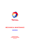 MECHANICAL MAINTENANCE BEARINGS TRAINING MANUAL COURSE EXP-MN-SM060 Revision 0 Field Operations Training Mechanical Maintenance Bearings MECHANICAL MAINTENANCE BEARINGS CONTENTS 1. OBJECTIVES ..................................................................................................................5 2. BASIC NOTIONS.............................................................................................................6 2.1. DEFINITION OF BEARINGS ....................................................................................6 2.2. WHAT PURPOSE DOES A BEARING SERVE? ITS ROLE .....................................7 2.3. BEARING VOCABULARY.........................................................................................8 2.3.1. Vocabulary used in a bearing assembly ............................................................9 2.3.2. Ball and roller bearing vocabulary ...................................................................10 2.3.3. Thrust bearing vocabulary ...............................................................................11 2.4. THE VARIOUS LOADS ACTING ON BEARINGS...................................................12 2.4.1. Loads on ball bearings ....................................................................................13 2.4.2. Loads on roller bearings ..................................................................................15 3. MANUFACTURING A BALL BEARING .........................................................................16 3.1. THE MATERIALS....................................................................................................16 3.1.1. Steel ................................................................................................................16 3.1.2. Ceramics .........................................................................................................16 3.1.3. Other materials................................................................................................17 3.2. THE MANUFACTURING METHODS......................................................................17 3.2.1. Manufacture of inner and outer bushings ........................................................18 3.2.1.1. Machining...................................................................................................18 3.2.1.2. Heat treatment ...........................................................................................19 3.2.1.3. Grinding......................................................................................................19 3.2.1.4. Superfinishing ............................................................................................20 3.2.2. Manufacturing the balls ...................................................................................20 3.2.2.1. Punching ....................................................................................................21 3.2.2.2. Rough machining of the balls .....................................................................21 3.2.2.3. Heat treatment ...........................................................................................22 3.2.2.4. Grinding on milling grinder .........................................................................22 3.2.2.5. Honing........................................................................................................22 3.2.2.6. Washing .....................................................................................................23 3.2.2.7. Final inspection ..........................................................................................23 3.2.3. Manufacturing of tapered rollers......................................................................23 3.2.3.1. Die forging (punching) ................................................................................24 3.2.3.2. Deburring in barrels....................................................................................24 3.2.3.3. Heat treatment ...........................................................................................24 3.2.3.4. Diameter grinding.......................................................................................24 3.2.3.5. Face grinding .............................................................................................25 3.2.3.6. Convex grinding .........................................................................................25 3.2.3.7. Washing .....................................................................................................25 3.2.3.8. Final inspection ..........................................................................................25 3.2.4. Manufacturing of cages ...................................................................................26 3.2.5. Final assembly (ball bearings).........................................................................26 4. THE DIFFERENT TYPES OF BEARINGS (the most widely used)................................28 Training Manual EXP-MN-SM060-EN Last revised: 17/10/2008 Page 2 / 110 Field Operations Training Mechanical Maintenance Bearings 4.1. BALL BEARINGS ....................................................................................................28 4.1.1. Rigid radial contact bearings ...........................................................................30 4.1.2. Angular contact ball bearings ..........................................................................31 4.1.3. Swivel bearing son balls ..................................................................................32 4.2. ROLLER BEARINGS ..............................................................................................33 4.2.1. Cylindrical roller bearings ................................................................................33 4.2.2. Tapered roller bearings ...................................................................................34 4.2.3. Bearings on spherical rol