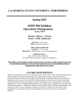 CALIFORNIA STATE UNIVERSITY, NORTHRIDGE Spring 2023 SOM 306 Syllabus Operations Management Section 13579 Monday 4:00 pm – 6:45 pm Room: Noski Auditorium Instructor: Jane Tierney Email: jane.tierney@csun.edu Office: Bookstein Hall 4245 Cell Phone: 719-339-1490 Office Hours: Monday 7 pm – 8 pm, and by appointment PREREQUISITES: Math 103, SOM 120 or Math 140 BUS 302/L (Recommended Co-requisite or Preparatory) This syllabus, course schedule, and the contents of course web site are subject to change in the event of extenuating circumstances. If you are absent from class, it is your responsibility to check on announcements made while you were absent. COURSE DESCRIPTION Operations management is the field of study that focuses on the effective and efficient transformation of resource inputs, such as labor and materials, into useful outputs, such as products and services. Students will become familiar with concepts and terminology of traditional subject areas in operations management, such as process flow analysis in production and service processes, demand forecasting, capacity planning, production planning, total quality management, project management, and inventory management, as well as emerging methodologies such as supply chain management, lean operations and time-based competition. Additionally, students will develop the ability to perform both quantitative and qualitative analysis of basic operational situations and decisions. Students will also improve their capabilities to communicate effectively to management the results of their analysis of operations problems. LEARNING GOALS This course introduces students to the terminologies, concepts, and key decision problems of operations management and it develops their ability to apply concepts and analytical techniques of operations management to decision making situations in the life of a productive system. Emphasis is also placed on the integration of various functions within the field of operations management and the interfaces between this discipline and other managerial functions. The course also provides a knowledge base for students who are interested in becoming professionals in this field. TEXT REQUIRED: Operations Management Stevenson, William J. McGraw-Hill Irwin Thirteenth Edition preferred; Fourteenth Edition acceptable PREREQUISITES The study of Operations Management requires knowledge and understanding of quantitative tools and techniques which should have been gained through the prerequisite courses. Examples of such tools and techniques are linear algebra of cost and revenue functions, systems of linear equations, estimation of mean and standard deviation, time series analysis, probability and sampling distributions, confidence interval estimates, etc. 1 STUDENT EVALUATION1 Students will be evaluated in the following manner: Method of Evaluation Two mid-term exams (200 points each) One final comprehensive exam Homework Problems Group Papers (2, 50 points each) Final Paper Team Evaluation Course Engagement (In-class and team participation) Weights 400 points 200 points 50 points 100 points 100 points 75 points 75 points ---------------1,000 points ========= TOTAL Grades will be determined on a curve. The highest student total will determine the starting point, and grades will be assigned as follows: Letter Grade A AB+ B BC+ C CD+ D DF Range of Total Points > 93.0 % 90.0 - 92.9 % 86.9 – 89.9 % 83.0 – 86.8 % 80.0 – 82.9 % 76.9 – 79.9 % 73.0 – 76.8 % 70.0 – 72.9 % 66.9 – 69.9 % 63.0 – 66.8 % 60.0 – 62.9 % < 60.0 % Attendance and punctuality Policy: Your cooperation, support and participation are essential to creating a positive learning environment. This course will be conducted with the expectation that all students are aware of and follow the following rules and policies: Arrive ON TIME, pay attention to the lectures, participate in class discussions Remain in the classroom until break time, return to class ON TIME, remaining until the end of class ALL electronic devices are prohibited from use during class – cell phones, tablets, computers. Shut down all electronics prior to the start of class and remain off for the entire class period. No side / personal conversations are allowed. NO food is allowed in class. Beverages are permitted, but consume in a quiet, polite fashion. 1The Instructor reserves the right to change course requirements and grading process to optimize the student learning experience. Students will be notified of any such changes. 2 Exams: Exams cover a variety of operations management problem solving tools/techniques. To reflect the quantitative nature of this course, each of the course’s three exams will be composed of about two-thirds quantitative questions and one-third conceptual questions. Exams are closed-book and closed-notes. Formula sheets will be furnished with exams, with a few exceptions which I will advise. Calculators may be used, but no cell phones or device with internet connectivity. Make-up examinations given on exception basis, at instructor discretion. Any student needing a makeup exam should contact me prior to the scheduled exam date with a valid reason for a make-up. Missed exams will receive a zero for the exam. Homework: Homework problems are assigned in the syllabus and are due at the start of class uploaded into Canvas ONLY. Homework will be collected each week, with 5 random weeks graded. No homework will be returned. No late submissions accepted. Papers / Group Project: Each student will be assigned to a group the second week of class. Each group will pick a company and write 2 papers covering different subjects covered in class. The final paper will build on the first 2. Each of the 2 papers should be 3-5 pages (excluding the cover page and appendix) on application of various topics covered in class related to the company you select. Papers will be due (uploaded into Canvas) before class begins. Papers should be typed in legible font (10-12pt), 1” marg