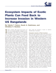 Society for Range Management Ecosystem Impacts of Exotic Plants Can Feed Back to Increase Invasion in Western US Rangelands By Valerie T. Eviner, Sarah A. Hoskinson, and Christine V. Hawkes I nvasive, nonnative plant species have become one of the most pressing rangeland management issues. In the western United States (the 17 US states from North Dakota, south to Texas, and west to the Pacific coast), 51 million hectares of rangeland are now dominated by invasive plants considered to be noxious weeds.1 In over two-thirds of western rangelands, nonnative annual grasses account for 50–85% of vascular plant cover.2 Invasive plants have large negative impacts on the prevalence and diversity of native species, and many decrease livestock production through decreases in forage quantity and/or quality (Table 1). Invasive species on US rangelands have an estimated annual cost of US$2 billion3 due to lost production and costs of control efforts. There are also hidden costs associated with invasive species in the form of degraded ecosystem services—key functions provided by ecosystems that benefit humans (e.g., water provisioning, flood control, erosion control, carbon storage, nutrient supply, climate regulation). In some cases, invasive species change ecosystem processes in ways that are self-reinforcing, making the system more suitable for the invader than for the previous inhabitants, in what is known as a positive feedback loop. The combination of degraded ecosystem properties and positive feedbacks can make invasive plant control and rangeland restoration much more challenging because in these cases, it is not sufficient to simply remove the invaders. The ecosystem impacts of invasive species can persist long after the plants have been removed, and when this occurs, the system can remain vulnerable to reinvasion until the ecosystem effects are mitigated or reversed. We review the ecosystem impacts of the current major rangeland invaders in the western United States, discuss the potential for these ecosystem changes to further promote invasion through positive feedbacks, and suggest strategies to address persistent ecosystem effects in order to enhance invasive February 2010 plant control and restoration of native (or otherwise desirable) plant communities. Ecosystem Impacts of Plant Invasions Most of the major rangeland invaders in the western United States have large impacts on at least some aspects of ecosystem function, ranging from forage productivity to soil and water quality1 (Table 1). Invasive plants in western rangelands typically reduce livestock production by 30–75% (however, not all invasive plants are detrimental to livestock production, and the effects of a given invader can be beneficial to some livestock species but detrimental to others; Table 1). Although forage quality and production are the most immediate concerns for ranchers, invasive species can also change many other ecosystem characteristics that can negatively impact both the ranch itself and the surrounding areas that rely on ecosystem services provided by rangelands. These ecosystem services include regulation of water flow and quality, soil fertility, soil carbon storage, and wildlife habitat. Water use by yellow starthistle, for example, can remove 15–25% of annual precipitation, decreasing soil water availability for other plants and ultimately reducing downstream water flow. In California’s Sacramento River watershed alone, the costs of lost water associated with yellow starthistle amount to US$16–75 million annually.4 Medusahead has been shown to decrease soil carbon stores, which can have major implications for those seeking credits for carbon sequestration on rangelands. Goatgrass, cheatgrass, medusahead, and spotted knapweed can reduce nitrogen recycling rates, thus potentially limiting rangeland productivity because nitrogen is the most commonly limiting nutrient to plant growth in these systems. Even when invaders do not alter the total amount of soil resources, they can change the timing of resource availability, restricting which plant species have access to soil resources.5 21 22 Rangelands Canadian thistle (Cirsium arvense), 2.86 million ha Barbed goatgrass (Aegilops triuncialis), data on area covered not available Decreases productivity on nonserpentine soils; on serpentine, increases productivity compared to serpentine natives Invader and its coverage in hectares across 17 western Plant US states productivity Can often form monotypic stands; decreases diversity particularly in serpentine soils, which had been a refuge for native species Decreases plant diversity Decreases livestock carrying capacity by 42%, can injure livestock Water availability and Diversity/ quality composition 40–75% decrease in livestock productivity Costs or economic losses Carbon storage Decreases nitrogen stored in microbial biomass Decreases decomposition compared to serpentine natives. Nitrogen availability and litter turnover Alters soil microbial community composition Soil microbes Disturbance regime Allelochemicals Batten et al. 2006 Gopher activity concentrated in patches dominated by goatgrass Pritekel et al. 2006 Malmstrom et al. 2009 Jacobsen 1929 Eviner and Chapin 2005 Drenovsky and Batten 2007 Canals et al. 2005 Batten et al. 2008 Batten et al. 2005 References Increases soil aggregation Other Table 1: Effects of major invasive plants in western US rangelands. Empty cells indicate that data were unreported for these properties (either because they are unmeasured, or because differences that are not statistically different tend not to get reported). Citations provide specific references (see web appendix), and much of this information is reviewed in DiTomaso (2000), Ehrenfeld (2003), and Duncan and Clark (2005) February 2010 23 Increased or decreased due to 10-fold variation in productivity year to year (vs. natives, which have more reliable production) Invader and its coverage in hectares Costs or ac