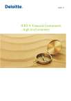 April, 13 IFRS 9: Financial Instruments – high level summary Background IFRS 9 Financial Instruments is the IASB’s replacement of IAS 39 Financial Instruments: Recognition and Measurement. The Standard includes requirements for recognition and measurement, impairment, derecognition and general hedge accounting. The version of IFRS 9 issued in 2014 supersedes all previous versions and is mandatorily effective for periods beginning on or after 1 January 2018 with early adoption permitted (subject to local endorsement requirements). For a limited period, previous versions of IFRS 91 may be adopted early, provided the relevant date of initial application is before 1 February 2015 (again, subject to local endorsement requirements). Observation The International Accounting Standards Board (IASB) has published an exposure draft (ED/2015/11) that proposes amendments to IFRS 4 Insurance Contracts that are intended to address concerns about the different effective dates of IFRS 9 Financial Instruments and the forthcoming new insurance contracts standard. The deadline of comments ended on 8 February and at the time of writing the IASB was considering the responses received. The purpose of this publication is to provide a high-level overview of the IFRS 9 requirements, focusing on the areas which are different from IAS 39. The following areas are considered: classification and measurement of financial assets; impairment; classification and measurement of financial liabilities; and hedge accounting. The derecognition model in IFRS 9 is carried over unchanged from IAS 39 and is therefore not considered further in this paper. Overview of IFRS 9 Classification and measurement of financial instruments Initial measurement of financial instruments Under IFRS 9 all financial instruments are initially measured at fair value plus or minus, in the case of a financial asset or financial liability not at fair value through profit or loss, transaction costs. This requirement is consistent with IAS 39. Financial assets: subsequent measurement Financial asset classification and measurement is an area where many changes have been introduced by IFRS 9. Consistent with IAS 39, the classification of a financial asset is determined at initial recognition, however, if certain conditions are met, an asset may subsequently need to be reclassified. Subsequent to initial recognition, all assets within the scope of IFRS 9 are measured at: • amortised cost; • fair value through other comprehensive income (FVTOCI); or • fair value through profit or loss (FVTPL). iii The FVTOCI classification is mandatory for certain debt instrument assets unless the option to FVTPL (‘the fair value option’) is taken. Whilst for equity investments, the FVTOCI classification is an election. The requirements for reclassifying gains or losses recognised in other comprehensive income (OCI) are different for debt and equity investments. For debt instruments measured at FVTOCI, interest income (calculated using the effective interest rate method), foreign currency gains or losses and impairment gains or losses are recognised directly in profit or loss. The difference between cumulative fair value gains or losses and the cumulative amounts recognised in profi or loss is recognised in OCI until derecognition, when the amounts in OCI are reclassified to profit or loss. This 2 contrasts with the accounting treatment for investments in equity instruments designated at FVTOCI under which only dividend income is recognised in profit or loss with all other gains and losses recognised in OCI and there is no reclassification on derecognition. Debt instruments A debt instrument that meets the following two conditions must be measured at amortised cost unless the asset is designated at FVTPL under the fair value option (see below): Business model test: The financial asset is held within a business model whose objective is to hold financial assets to collect their contractual cash flows (rather than to sell the assets prior to their contractual maturity to realise changes in fair value). Cash flow characteristics test: The contractual terms of the financial asset give rise, on specified dates, to cash flows that are solely payments of principal and interest on the principal amount outstanding. A debt instrument that meets the cash flow characteristics test and is not designated at FVTPL under the fair value option must be measured at FVTOCI if it is held within a business model whose objective is to hold financial assets in order to collect contractual cash flows and sell financial assets. All other debt instrument assets are measured at fair value through profit or loss (FVTPL). Observation The FVTOCI category for debt instruments is not the same as the available-for-sale category under IAS 39. Under IAS 39, impairment gains and losses are based on fair value, whereas under IFRS 9, impairment is based on expected losses and is measured consistently with amortised cost assets (see below). Also, the criteria for measuring at FVTOCI are based on the entity’s business model, which is not the case for the available-for-sale category. For example under IAS 39, certain instruments can be elected to be classified as available-for-sale, whereas under IFRS 9 the FVTOCI classification cannot be elected for debt instruments. Contractual cash flow characteristics test Only debt instruments are capable of meeting the contractual cash flows characteristics test required by IFRS 9. Derivative assets and investments in equity instruments will not meet the criteria. Contractual cash flows that are solely payments of principal and interest on the principal amount outstanding are consistent with a basic lending arrangement. In a basic lending arrangement, consideration for the time value of money and credit risk are typically the most significant elements of interest. However, in such an arrangement, interest can also include consideration for other basic lending ris