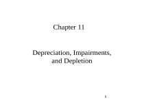 Chapter 11 Depreciation, Impairments, and Depletion 1 Depreciation in accounting is not about valuation, but cost allocation. Depletion is used for natural resources and Amortization for intangibles such as patents, copyrights GAAP requires the allocation over the asset’s life in a systematic and rational manner. Choice of method usually guided by the matching principle 1. Activity methods (miles, m/c hours, units of production) – depreciation a function of usage 2. Straight line method – depreciation a function of time Assumed same usefulness and maintenance expense each year 3. Accelerated methods – reducing expense: higher dep. expense in early years. New equipment more productive and require less maintenance; a more constant annual cost a. DDB– rate is a multiple of the st-line rate. SV not factored into calculation b. Sum of the years digits – rate of dep. = year # in reverse order / Sum of years c. MACRS – for tax purpose – eqt. class with published associated rates – see p.631 d. Special depreciation methods: group/composite and hybrid (combination) 2 p.637 E11-2 ( Depreciation— Conceptual Understanding) Hasselback Company acquired a plant asset at the beginning of Year Straight-Line SYD DDB Year 1. The asset has an estimated service life of 5 years. An 1 $ 9,000 $ 15,000 $ 20,000 employee has prepared depreciation schedules for this asset using 2 9,000 12,000 12,000 three different methods to compare the results of using one method 3 9,000 9,000 7,200 with the results of using other methods. You are to assume that the 4 9,000 6,000 4,320 following schedules have been correctly prepared for this asset 5 9,000 3,000 1,480 using (1) the straight-line method, (2) the sum-of the-years’-digits Total $ 45,000 $ 45,000 $ 45,000 method, and (3) the double-declining-balance method 5 yr m/c: Rate: 20% 5/15 for 1st yr. 40% Answer the following questions. a) What is the cost of the asset being depreciated? b) What amount, if any, was used in the depreciation calculations for the salvage value for this asset? c) Which method will produce the highest charge to income in Year 1? d) Which method will produce the highest charge to income in Year 4? e) Which method will produce the highest book value for the asset at the end of Year 3? f) If the asset is sold at the end of Year 3, which method would yield the highest gain ( or lowest loss) on disposal of the asset? a) For DDB: Cost*rate = dep. Cost = dep./rate = 20,000/40% = $50,000 b) St. line: Depreciable base = total depreciated = 45,000. SV = cost – base = $5,000 c) Highest dep. For year 1 – using the DDB method d) By observation – straight line method e) Highest BV => lowest acc. Dep. for year 3: Straight line method f) Highest gain => lowest BV, hence for year 3: DDB 3 4. Other Depreciation Methods – intention here is to simplify bookkeeping; averages out errors caused by under/over estimation of depreciation; recognize no gain/loss on disposal (by adjusting accumulated depreciation), hence do not distort Income Statement. a. Group and composite i) ii) Use Group method when assets are similar with approx. the same useful lives e.g. fleet of delivery trucks– similar to single-unit cost procedure [No gain/loss if sold – adjust acc. Dep.] Use Composite method otherwise – see I.11-8 p.612 Rate of dep. = sum of individual asset annual dep. ÷ by total cost of assets Composite life = Total depreciable amount / annual depreciation Methods basically capitalizes the total cost of the assets into one account and is treated as one “asset” for purpose of depreciation. If one, or some items in the “asset” is sold, the company does not recognize a gain or loss on that item because the entire “asset” is not retired. The difference between cash received and item cost is debited to accumulated. Gain/loss recognized when final item in group is retired. b. Hybrid or combination – mixture of straight-line and activity method 4 p.636 BE11-6 Dickinson Inc. owns the following assets. Asset Cost Salvage Estimated Useful Life A $ 70,000 $ 7,000 10 years B 50,000 5,000 5 years C 82,000 4,000 12 years Compute the composite depreciation rate and the composite life of Dickinson’s assets. Dickinson Inc. owns the following assets Asset Cost Salvage Est Life A 70,000 7,000 10 B 50,000 5,000 5 C 82,000 4,000 12 202,000 Total Depreciable Annual Dep 63,000 6,300 45,000 9,000 78,000 6,500 186,000 21,800 Composite rate = total annual depreciation / total equipment cost = 10.79% Composite life = total depreciable amount / annual dep. = 8.53 years Note that depreciation expense is computed by multiplying the composite rate by the cost of the remaining asset value. Note: Cost, not depreciable amount. 5 p.638 E11-9 ( Composite Depreciation) Presented below is information related to Morrow Manufacturing Corporation. Machine Cost Estimated Salvage Value Estimated Life Depreciable Ann. Dep. A $ 40,500 $ 5,500 10 35,000 3,500 B 33,600 4,800 9 28,800 3,200 C 36,000 3,600 8 32,400 4,050 D 19,000 1,500 7 17,500 2,500 E 23,500 2,500 6 21,000 3,500 a) Compute the rate of depreciation per year to be applied to the machines under the composite method. b) Prepare the adjusting entry necessary at the end of the year to record depreciation for the year. c) Prepare the entry to record the sale of Machine D for cash of $ 5,000. It was used for 6 years, and depreciation was entered under the composite method. a) Composite rate = total annual depreciation ÷ total “asset” cost = 10.98% Total “asset” cost = 152,600; depreciable amount = 134,700 depreciation = 16,750 Composite life = 134,700/16,750 = 8.04 years b) Depreciation expense 16,750 Accumulated depreciation 16,750 c) For Asset D: Cash 5,000 Acc. Dep. 14,000 Plant assets 19,000 Note: No gain/loss recognized. Equipment cost * rate Note that : equipment cost used and not depreciable amount – see rate calc. above What is the depreciation expense for the next year if no new asset added? 