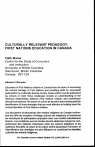 CULTURAllY RELEVANT PEDAGOGY: FIRST NATIONS EDUCATION IN CANADA Faith Maina Centre for the Study of Curriculum and Instruction University of British Columbia Vancouver, British Columbia Canada, V6T 1Z4 Abstract I Resume Educators of First Nations children in Canada face the tasks of recovering the cultural heritage of First Nations and providing skills for successful participation in a culturally diverse society. Issues which must be addressed by schools to meet these challenges include an understanding of the historical relationships between First Nations cultures and mainstream educational systems; the nature of culture as dynamic and evolving and the identification ofthose strategies that are most effedive in building upon the cultural identities of First Nations children. Les educateurs et educatrices des enfants indigenes du Canada confrontent les defis de recuperer I'heritage culturel des indigenes et foumissent les techniques de participation propspere dans une societe culturellement diverse. Les problemes que les ecoles doivent addresser incluent la comprehension des relations historiques entre les cultures indigenes et las systemes educatifs; la nature de la culture soient dynamique et evoluer, et I'identification des strategies les plus efficases en constituant les identites culturels des enfants indigenes. The Canadian Joumal of Native Stucfes XVII, 2(1991):293-314. Faith Maina 294 Introduction Indigenous people around the world are re-affinning the validity of their own cultures and re-defining their political, economic and social priorities in the late 20th century. Central to this process is the re-socialization of youth within their own cultures, giving them a sense of pride in their cultural heritages through education. It is a shift resulting from centuries of colonial domination deliberately undennining the cultural values of Indigenous people through assimilative, and later integrative, educational policies (Bannan, 1986; Kirkness, 1992). It is against this background that the educators of First Nations 1 children in Canada face the challenging task of recovering the cultural heritages of First Nations while "providing preparation for successful participation in a culturally diverse, modem technological society" (Hamme, 1996:21). Research on the education of First Nations and other minority group students has also shown that schools which respect and support a child's culture demonstrate significantly better outcomes in educating those students (Billings, 1995; Hamme, 1996; McCaleb, 1994). As well, classroom approaches which are responsive to the child's culture promote academic achievement by providing cultural relevance and a rationale for accepting school (Archibald, 1995). However, both academic and future success also depend upon students developing an accurate understanding of relationships with the larger Canadian society (Hampton 1995; Hamme, 1996; Calliou, 1995). Educational processes must provide First Nations students with some knowledge of how their cultures interact with the rest of the complex, multicultural Canadian society in order to allow them to increase their future options (McCaskill, 1987; Maclvor, 1995). Such students will then be able to participate successfully in the larger society if they choose to do so, while maintaining their own cultural identities (Hamme, 1996). The issues that must be addressed by schools in order to meet these challenges are multiple and complex. An understanding of the historical relationship between First Nations culture and education is essential (Hamme, 1996). As Kirkness (1992:103) argues, the First Nations children of today must know their past, their true history, in order to understand the present and plan for the future. First Nations cultures must once again be respected and the traditional values must again be held in high esteem. It is both a challenge and a responsibility for the educators of First Nations children to develop this understanding. The challenge is to present complex, sensitive material in a way which helps the students understand the realities of their past and present while maintaining a positive outlook for First Nations Education in Canada 295 future. The responsibility is to help students discover what role their people and they themselves as individuals should play in the future development oftheir communities, the country and the world (Indian and Northern Affairs, 1993). Another pertinent issue of concern is culture itself. First Nations cultures, like all other cultures, are dynamic and continuously evolving (Hamme, 1996; Hampton, 1995). Cultural beliefs and practices are continuously being reshaped through changing environmental circumstances and interactions with other cultures (Hampton, 1995; Merkel, 1984). Schools have the responsibility of validating both traditional and contemporary cultures of their students. It becomes problematic when First Nations cultures are presented in the classroom as static and unaffected by time. As a Nish'ga Elder recently said, "There was a lot more to our traditional education than just some 'mickey-mouse' courses in moccasin making" (Merkel, 1984:1). Or as Hampton argues, asking Natives to eschew automobiles, television, and bank accounts in the name of "preserving their culture" makes as much sense as asking VVhites to give up gun powder because it was invented by the Chinese or the zero because it was invented by the Arabs. It is the continuity of a living culture that is important to an Indian education, not the preservation of a frozen museum specimen (1995:29). VVhat the schools should do instead is to recognize and acknowledge those traditional and contemporary cultural contributions which First Nations people have made in shaping the larger Canadian multicultural society. Finally, educators of First Nations children must identify the educational strategies that most effectively build on the cultural identity of children while providing the