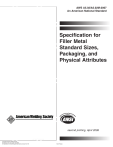 AWS A5.02/A5.02M:2007 An American National Standard Specification for Filler Metal Standard Sizes, Packaging, and Physical Attributes second printing, April 2008 --`,,```,,,,````-`-`,,`,,`,`,,`--- Copyright American Welding Society Provided by IHS under license with AWS No reproduction or networking permitted without license from IHS Not for Resale AWS A5.02/A5.02M:2007 An American National Standard Approved by the American National Standards Institute November 6, 2006 Specification for Filler Metal Standard Sizes, Packaging, and Physical Attributes 1st Edition Prepared by the American Welding Society (AWS) A5 Committee on Filler Metals and Allied Materials Under the Direction of the AWS Technical Activities Committee Approved by the AWS Board of Directors Abstract --`,,```,,,,````-`-`,,`,,`,`,,`--- This specification prescribes the requirements for standard sizes and packages of all types of welding filler metals, allowing these physical attributes to be incorporated by reference into the individual specification. The annex lists the manner by which the filler metal specification may refer to appropriate requirements in this specification. This specification makes use of both U.S. Customary Units and the International System of Units (SI). Since these are not equivalent, each system must be used independently of the other. 550 N.W. LeJeune Road, Miami, FL 33126 Copyright American Welding Society Provided by IHS under license with AWS No reproduction or networking permitted without license from IHS Not for Resale --`,,```,,,,````-`-`,,`,,`,`,,`--- AWS A5.02/A5.02M:2007 International Standard Book Number: 0-87171-059-5 American Welding Society 550 N.W. LeJeune Road, Miami, FL 33126 © 2007 by American Welding Society All rights reserved Printed in the United States of America Errata: 2nd Printing, April 2008 Photocopy Rights. No portion of this standard may be reproduced, stored in a retrieval system, or transmitted in any form, including mechanical, photocopying, recording, or otherwise, without the prior written permission of the copyright owner. Authorization to photocopy items for internal, personal, or educational classroom use only or the internal, personal, or educational classroom use only of specific clients is granted by the American Welding Society provided that the appropriate fee is paid to the Copyright Clearance Center, 222 Rosewood Drive, Danvers, MA 01923, tel: (978) 750-8400; Internet: <www.copyright.com>. ii Copyright American Welding Society Provided by IHS under license with AWS No reproduction or networking permitted without license from IHS Not for Resale AWS A5.02/A5.02M:2007 Statement on the Use of American Welding Society Standards All standards (codes, specifications, recommended practices, methods, classifications, and guides) of the American Welding Society (AWS) are voluntary consensus standards that have been developed in accordance with the rules of the American National Standards Institute (ANSI). When AWS American National Standards are either incorporated in, or made part of, documents that are included in federal or state laws and regulations, or the regulations of other governmental bodies, their provisions carry the full legal authority of the statute. In such cases, any changes in those AWS standards must be approved by the governmental body having statutory jurisdiction before they can become a part of those laws and regulations. In all cases, these standards carry the full legal authority of the contract or other document that invokes the AWS standards. Where this contractual relationship exists, changes in or deviations from requirements of an AWS standard must be by agreement between the contracting parties. AWS American National Standards are developed through a consensus standards development process that brings together volunteers representing varied viewpoints and interests to achieve consensus. While the AWS administers the process and establishes rules to promote fairness in the development of consensus, it does not independently test, evaluate, or verify the accuracy of any information or the soundness of any judgments contained in its standards. AWS disclaims liability for any injury to persons or to property, or other damages of any nature whatsoever, whether special, indirect, consequential, or compensatory, directly or indirectly resulting from the publication, use of, or reliance on this standard. AWS also makes no guarantee or warranty as to the accuracy or completeness of any information published herein. This standard may be superseded by the issuance of new editions. Users should ensure that they have the latest edition. Publication of this standard does not authorize infringement of any patent or trade name. Users of this standard accept any and all liabilities for infringement of any patent or trade name items. AWS disclaims liability for the infringement of any patent or product trade name resulting from the use of this standard. Finally, the AWS does not monitor, police, or enforce compliance with this standard, nor does it have the power to do so. On occasion, text, tables, or figures are printed incorrectly, constituting errata. Such errata, when discovered, are posted on the AWS web page (www.aws.org). Official interpretations of any of the technical requirements of this standard may only be obtained by sending a request, in writing, to the appropriate technical committee. Such requests should be addressed to the American Welding Society, Attention: Managing Director, Technical Services Division, 550 N.W. LeJeune Road, Miami, FL 33126 (see Annex B). With regard to technical inquiries made concerning AWS standards, oral opinions on AWS standards may be rendered. These opinions are offered solely as a convenience to users of this standard, and they do not constitute professional advice. Such opinions represent only the personal opinions of the particular individuals giving them. These individuals do not speak on behalf of AWS