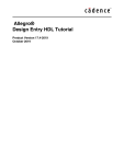 Allegro® Design Entry HDL Tutorial Product Version 17.4-2019 October 2019 © 1991–2019 Cadence Design Systems, Inc. All rights reserved. Portions © Apache Software Foundation, Sun Microsystems, Free Software Foundation, Inc., Regents of the University of California, Massachusetts Institute of Technology, University of Florida. Used by permission. Printed in the United States of America. Cadence Design Systems, Inc. (Cadence), 2655 Seely Ave., San Jose, CA 95134, USA. Product Allegro® Design Entry HDL contains technology licensed from, and copyrighted by: Apache Software Foundation, 1901 Munsey Drive Forest Hill, MD 21050, USA © 2000-2005, Apache Software Foundation. Sun Microsystems, 4150 Network Circle, Santa Clara, CA 95054 USA © 1994-2007, Sun Microsystems, Inc. Free Software Foundation, 59 Temple Place, Suite 330, Boston, MA 02111-1307 USA © 1989, 1991, Free Software Foundation, Inc. Regents of the University of California, Sun Microsystems, Inc., Scriptics Corporation, © 2001, Regents of the University of California. Daniel Stenberg, © 1996 - 2006, Daniel Stenberg. UMFPACK © 2005, Timothy A. Davis, University of Florida, (davis@cise.ulf.edu). Ken Martin, Will Schroeder, Bill Lorensen © 1993-2002, Ken Martin, Will Schroeder, Bill Lorensen. Massachusetts Institute of Technology, 77 Massachusetts Avenue, Cambridge, Massachusetts, USA © 2003, the Board of Trustees of Massachusetts Institute of Technology. All rights reserved. Trademarks: Trademarks and service marks of Cadence Design Systems, Inc. contained in this document are attributed to Cadence with the appropriate symbol. For queries regarding Cadence’s trademarks, contact the corporate legal department at the address shown above or call 800.862.4522. Open SystemC, Open SystemC Initiative, OSCI, SystemC, and SystemC Initiative are trademarks or registered trademarks of Open SystemC Initiative, Inc. in the United States and other countries and are used with permission. All other trademarks are the property of their respective holders. Restricted Permission: This publication is protected by copyright law and international treaties and contains trade secrets and proprietary information owned by Cadence. Unauthorized reproduction or distribution of this publication, or any portion of it, may result in civil and criminal penalties. Except as specified in this permission statement, this publication may not be copied, reproduced, modified, published, uploaded, posted, transmitted, or distributed in any way, without prior written permission from Cadence. Unless otherwise agreed to by Cadence in writing, this statement grants Cadence customers permission to print one (1) hard copy of this publication subject to the following conditions: 1. The publication may be used only in accordance with a written agreement between Cadence and its customer. 2. The publication may not be modified in any way. 3. Any authorized copy of the publication or portion thereof must include all original copyright, trademark, and other proprietary notices and this permission statement. 4. The information contained in this document cannot be used in the development of like products or software, whether for internal or external use, and shall not be used for the benefit of any other party, whether or not for consideration. Disclaimer: Information in this publication is subject to change without notice and does not represent a commitment on the part of Cadence. Except as may be explicitly set forth in such agreement, Cadence does not make, and expressly disclaims, any representations or warranties as to the completeness, accuracy or usefulness of the information contained in this document. Cadence does not warrant that use of such information will not infringe any third party rights, nor does Cadence assume any liability for damages or costs of any kind that may result from use of such information. Restricted Rights: Use, duplication, or disclosure by the Government is subject to restrictions as set forth in FAR52.227-14 and DFAR252.227-7013 et seq. or its successor. Allegro Design Entry HDL Tutorial Contents 1 Introduction to Design Entry HDL Tutorial . . . . . . . . . . . . . . . . . . . . . . 7 Overview . . . . . . . . . . . . . . . . . . . . . . . . . . . . . . . . . . . . . . . . . . . . . . . . . . . . . . . . . . . . . . 7 Design Entry HDL in the PCB Flow . . . . . . . . . . . . . . . . . . . . . . . . . . . . . . . . . . . . . . . . . . 8 How To Use this Tutorial . . . . . . . . . . . . . . . . . . . . . . . . . . . . . . . . . . . . . . . . . . . . . . . . . . 9 Brief Outline of Chapters . . . . . . . . . . . . . . . . . . . . . . . . . . . . . . . . . . . . . . . . . . . . . . . . . 10 2 Creating a Project . . . . . . . . . . . . . . . . . . . . . . . . . . . . . . . . . . . . . . . . . . . . . . . . 11 Overview . . . . . . . . . . . . . . . . . . . . . . . . . . . . . . . . . . . . . . . . . . . . . . . . . . . . . . . . . . . . . Reference Libraries . . . . . . . . . . . . . . . . . . . . . . . . . . . . . . . . . . . . . . . . . . . . . . . . . . The cds.lib File . . . . . . . . . . . . . . . . . . . . . . . . . . . . . . . . . . . . . . . . . . . . . . . . . . . . . . Creating a Project . . . . . . . . . . . . . . . . . . . . . . . . . . . . . . . . . . . . . . . . . . . . . . . . . . . . . . Adding Libraries Using Project Setup . . . . . . . . . . . . . . . . . . . . . . . . . . . . . . . . . . . . . . . 11 12 12 13 20 3 Creating a Schematic: Basics . . . . . . . . . . . . . . . . . . . . . . . . . . . . . . . . . . . 29 Overview . . . . . . . . . . . . . . . . . . . . . . . . . . . . . . . . . . . . . . . . . . . . . . . . . . . . . . . . . . . . . Starting Design Entry HDL . . . . . . . . . . . . . . . . . . . . . . . . . . . . . . . . . . . . . . . . . . . . . . . . Setting the Pre-Select Use Model . . . . . . . . . . . . . . . . . . . . . . . . . . . . . . . . . . . . . . . . . . Adding a Page Border . . . . . . . . . . . . . . . . . 