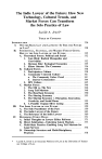 The Indie Lawyer of the Future: How New Technology, Cultural Trends, and Market Forces Can Transform the Solo Practice of Law Lucille A. Jewel* TABLE OF CONTENTS INTRODUCTION ....................................................... I. OFF-THE-RACK LAW AND LAWBOTS-Is THIS THE FUTURE oF LAW? . . . . . . . . . . . . . . . . . . . . . . . . . . . . . . . . . . . . . . . . . . . . . . . . .. . II. THEORETICAL, CULTURAL, AND MARKET FORCES GIVING RISE TO THE INDI LAWYER OF THE FUTURE ............... III. IV. * A. Theoretical Forces: Political and Social ............. 1. Ivan Illich: Radical Monopolies and ............................... Conviviality 2. Herman Daly: Ecological Economics ............ 3. Elinor Ostrom: The Commons ................. B. Cultural Forces ............................... 1. Participatory Culture ........................ ............... 2. Community Centered Culture .. a. The Community Values Trend .............. ..................... b. Internet Communities .............................. 3. DIY Culture ................................ C. Market Forces 1. The Old vs. The New ........................ 2. Long Tail Markets .......................... 3. The Heartbeat Economy ..................... 4. The Sharing Economy ....................... 5. The Sharing Economy v. Disruption, Innovation, .................. Creativity, and Social Harm 6. A Possible Utopian Silver Lining ............... THE INDIE LAWYER OF THE FUTURE ...................... A. The Solo Practitioner of the Past . ................. B. The Indie Lawyer of the Future .................... C. The Relevance of the Indie Lawyer ................ REFORMING ETHICS RULES ............................... A. Initial Thoughts on Lawyer Ethics Reforms .......... B. Direct Solicitation-Unlocking Latent Markets ....... C. Multi-State Practice: Enabling Long Tail Markets for ...... .................... Legal Services... D. Ownership Structure and Multi-Disciplinary .................................... Practices 326 . 328 332 332 332 335 336 338 338 341 341 344 345 346 346 348 350 353 355 358 359 359 363 369 371 371 373 376 378 Lucille A. Jewel is an Associate Professor of Law at the University of Tennessee College of Law. SMU Science and Technology Law Review 326 V. [Vol. XVII E. Lawyer Speech: Promoting Supportive Communities for Indie Lawyers.................................... 381 CONCLUSION ................................................ 383 INTRODUCTION This article is about individual lawyers innovating in the practice of law. It theorizes that technology, cultural trends, and market forces have the potential to awaken latent markets for one-to-one legal services grounded in the sharing economy, the commons, do-it-yourself (DIY) businesses, and similar endeavors. These forces might reshape the solo practice of law, which in turn might help bring about structural change in the legal system. Despite the mass commoditization of many law products, there is potentially a new market for craft-oriented lawyers who directly connect with clients. When we connect the sharing economy and the cultural values that support it, with the ability to connect with clients over the Internet, new practice style opportunities emerge for solo practitioners (and lawyers practicing in small firms). The lawyers operating in this new market space are "indie"' lawyers. Generally speaking, the term indie connotes independence from corporate sponsorship.2 Indie also refers to a market approach that combines economic and non-economic motives. "Unlike a majority of global firms, many [indie] producers are not solely motivated by economic profit, but rather a combination of emotional and monetary rewards."3 For instance, indie producers may find motivation in earning a sustainable living, cultivating creativity, earning the respect of their peers, or making the world a better place.4 As applied to lawyering, indie emphasizes the independent and autonomous characteristics of the lawyer's work, as well as his or her focus on the community and the collective good. Indie also works as a rhetorical response to the negative view that legal culture projects onto solo and small-firm prac1. See Indie, 2. Id.; see also Brian J. Hracs et al., Standing Out in the Crowd: The Rise of Exclusivity-Based Strategies to Compete in the Contemporary Marketplacefor Music and Fashion, 45 ENVIRONMENT AND PLANNING A 1144, 1145 (2013) WIKIPEDIA, http://en.wikipedia.org/wiki/Indie (last visited June 25, 2014) (Indie is a short form of the word "independent" and may refer to a wide variety of cultural products such as design, computer games, music, and film.). ("[I]ndie refers to individuals and small groups who produce cultural goods and services on their own."); Steve Albini, The Problem With Music, 5 THE BAFFLER, at *1 (1994), availableat http://www.thebaffler.com/salvos/the-problem- with-music (In music, the term refers to bands that produce their music outside of major label recording contracts.). See generally MICHAEL AZERRAD, OUR BAND COULD BE YOUR LIFE: SCENES FROM THE AMERICAN INDIE UNDER- 3. 1981-1991 (2002); HENRY H. OWINGS, THE INDIE CRED TEST (Perigee Trade 2012) (2011); ANDREW EARLES, GIMME INDIE ROCK (2014). Hracs et al., supra note 2, at 1145. 4. Id. GROUND The Indie Lawyer of the Future 2014] 327 titioners. Solo practitioners5 are perceived as occupying the lowest rung on the legal profession's ladder6 and statistically have received the most professional discipline for ethics violations.7 The general view is that solo practitioners are the most unethical segment of the legal profession.8 As the legal community continues to confront the severe scarcity of legal jobs in relation to legal jobseekers,9 it is time to re-imagine solo practice. However, for the indie lawyer to thrive, the legal community must revamp several key ethical regulations that obstruct these new professional pathways. These ethical rules include bars on direct solicitation, multi-jurisdictional