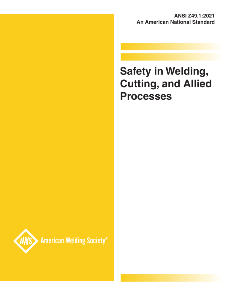ANSI Z49.1:2021 An American National Standard Safety in Welding, Cutting, and Allied Processes ANSI Z49.1:2021 An American National Standard Approved by the American National Standards Institute July 2, 2021 Safety in Welding, Cutting, and Allied Processes Revises ANSI Z49.1:2012 Prepared by the Accredited Standards Committee Z49, Safety in Welding and Cutting Secretariat American Welding Society Abstract This standard covers all aspects of safety and health in the welding environment, emphasizing oxygen gas and arc welding processes with some coverage given to resistance and high energy beam welding, brazing and soldering. It contains information on protection of personnel and the general area, ventilation, fire prevention and protection, and confined spaces. A significant section is devoted to precautionary information, showing examples, and an extensive bibliography is included. ANSI Z49.1:2021 American National Standard Approval of an American National Standard requires review by ANSI that the requirements for due process, consensus, and other criteria for approval have been met by the standards developer. Consensus is established when, in the judgment of the ANSI Board of Standards Review, substantial agreement has been reached by directly and materially affected interests. Substantial agreement means much more than a simple majority, but not necessarily unanimity. Consensus requires that all views and objections be considered, and that a concerted effort be made toward their resolution. The use of American National Standards is completely voluntary; their existence does not in any respect preclude anyone, whether he has approved the standards or not, from manufacturing, marketing, purchasing, or using products, processes, or procedures not conforming to the standards. The American National Standards Institute does not develop standards and will in no circumstances give an interpretation of any American National Standard. Moreover, no person shall have the right or authority to issue an interpretation of an American National Standard in the name of the American National Standards Institute. Requests for interpretations should be addressed to the secretariat or sponsor whose name appears on the title page of this standard. CAUTION NOTICE: This American National Standard may be revised or withdrawn at any time. The procedures of the American National Standards Institute require that action be taken periodically to reaffirm, revise, or withdraw this standard. Purchasers of American National Standards may receive current information on all standards by calling or writing the American National Standards Institute. ISBN Print: 978-1-64322-208-0 ISBN PDF: 978-1-64322-209-7 © 2021 by American Welding Society All rights reserved Printed in the United States of America Photocopy Rights. No portion of this standard may be reproduced, stored in a retrieval system, or transmitted in any form, including mechanical, photocopying, recording, or otherwise, without the prior written permission of the copyright owner. Authorization to photocopy items for internal, personal, or educational classroom use only or the internal, personal, or educational classroom use only of specific clients is granted by the American Welding Society provided that the appropriate fee is paid to the Copyright Clearance Center, 222 Rosewood Drive, Danvers, MA 01923, tel: (978) 750-8400; Internet: <www.copyright.com>. ii ANSI Z49.1:2021 Personnel (The following is the roster of the Committee at the time of final committee action on the document.) American National Standard Committee Z49 A. F. Manz, Chair D. A. Werba, Vice Chair S. P. Hedrick, Secretary AMERICAN FOUNDRY SOCIETY J. Garcshe AMERICAN COLLEGE OF OCCUPATIONAL AND ENVIRONMENTAL MEDICINE L. Lee AMERICAN PUBLIC HEALTH ASSOCIATION P. F. Dooley AMERICAN SOCIETY OF SAFETY PROFESSIONALS T. J. Martin AMERICAN WELDING SOCIETY D. A. Werba S. P. Hedrick (Alternate) CANADIAN STANDARDS ASSOCIATION J. J. Palach CANADIAN WELDING BUREAU C. Cadorin COMPRESSED GAS ASSOCIATION A. F. Manz INTERNATIONAL ASSOCIATION OF BRIDGE, STRUCTURAL, ORNAMENTAL AND REIFORCING IRON WORKERS E. Abbott INTERNATIONAL THERMAL SPRAY ASSOCIATION D. Hayden INTERNATIONAL SAFETY EQUIPMENT ASSOCIATION, INCORPORATED C. Fargo MECHANICAL CONTRACTORS ASSOCIATION OF AMERICA, INCORPORATED P. Chaney W. Sperko (Alternate) NATIONAL ELECTRICAL MANUFACTURERS ASSOCIATION, INCORPORATED S. Farah M. Madsen (Alternate) NATIONAL FIRE PROTECTION ASSOCIATION L. E. Moreno (nonvoting) iii ANSI Z49.1:2021 SHEET METAL WORKERS INTERNATIONAL M. Van Avery U.S. DEPARTMENT OF THE AIR FORCE R. Baker R. Foster (Alternate) U.S. DEPARTMENT OF THE ARMY L. B. Keaton U.S. DEPARTMENT OF THE NAVY E. Berg U.S. PUBLIC HEALTH SERVICE (NIOSH) J. M. Antonini iv ANSI Z49.1:2021 Foreword This foreword is not part of this standard but is included for informational purposes only. The huge demands for production placed on the United States by World War II brought a tremendous expansion to the use of welding. In mid 1943, it was recognized that some type of code or standard was needed relating to safe practices for performing welding. Under the auspices of the American Standards Association, the standard was drafted and published in 1944. It was entitled American War Standard Z49.1, Safety in Electric and Gas Welding, and Cutting Operations. Following the war, the standard was first revised in 1950. Subsequent revisions occurred in 1958, 1967, 1973, and 1983. Each updated the standard in accordance with changing technology and welding practices. The revisions up to and including 1973 were largely evolutionary and closely preserved the format of the original war standard. In 1983, a major rewrite was undertaken to take proper account of the vast changes in welding which had occurred in the 40 years of the standard's existence and to clarify the somewhat patchwork presentation that had built up during the evolutionary revisions. The scope was redefined to ad