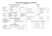 PHYS 2310 Engineering Physics I Formula Sheets Chapters 1-18 Chapter 1/Important Numbers Chapter 2 Velocity Quantity Units for SI Base Quantities Unit Name Unit Symbol Length Meter M Time Second s Mass (not weight) Kilogram kg 1 kg or 1 m 1m 1m 1 second 1m Common Conversions 1000 g or m 1m 100 cm 1 inch 1000 mm 1 day 1000 milliseconds 1 hour 3.281 ft 360° Average Velocity Average Speed 1 × 106 ππ 2.54 cm 86400 seconds 3600 seconds 2π rad Important Constants/Measurements Mass of Earth 5.98 × 1024 kg Radius of Earth 6.38 × 106 m 1 u (Atomic Mass Unit) 1.661 × 10−27 kg Density of water 1 π/ππ3 or 1000 ππ/π3 g (on earth) 9.8 m/s 2 Circumference Surface area (sphere) Density Common geometric Formulas Area circle πΆ = 2ππ ππ΄ = 4ππ 2 Volume (rectangular solid) Instantaneous Velocity πππ£π = πππ πππππππππ‘ βπ₯ = π‘πππ βπ‘ π‘ππ‘ππ πππ π‘ππππ π‘πππ Μ ππ₯ βπ₯ π£ = lim = βπ‘→0 βπ‘ ππ‘ π ππ£π = Average Acceleration βπ£ βπ‘ ππ£ π2 π₯ π= = ππ‘ ππ‘ 2 πππ£π = Motion of a particle with constant acceleration π΄ = ππ 4 Volume (sphere) π = ππ 3 3 π =πβπ€ββ π = ππππ β π‘βππππππ π 2.3 2.4 Acceleration Instantaneous Acceleration 2 2.2 π£ = π£0 + ππ‘ 1 βπ₯ = (π£0 + π£)π‘ 2 1 βπ₯ = π£0 π‘ + ππ‘ 2 2 π£ 2 = π£02 + 2πβπ₯ 2.11 2.17 2.15 2.16 2.7 2.8 2.9 Chapter 3 Adding Vectors Geometrically Adding Vectors Geometrically (Associative Law) Chapter 4 πβ + πββ = πββ + πβ 3.2 (πβ + πββ) + πβ = πβ + (πββ + πβ) 3.3 3.5 Magnitude of vector |π| = π = √ππ₯2 + ππ¦2 3.6 Angle between x axis and vector ππ¦ π‘πππ = ππ₯ 3.6 Unit vector notation πβ = ππ₯ πΜ + ππ¦ πΜ + ππ§ πΜ 3.7 ππ₯ = ππ₯ + ππ₯ ππ¦ = ππ¦ + ππ¦ ππ§ = ππ§ + ππ§ 3.10 3.11 3.12 πβ β πββ = πππππ π 3.20 Adding vectors in Component Form Scalar (dot product) Scalar (dot product) Projection of πβ ππ πββ or component of πβ ππ πββ Vector (cross) product magnitude πβ β πββ = (ππ₯ πΜ + ππ¦ πΜ + ππ§ πΜ) β (ππ₯ πΜ + ππ¦ πΜ + ππ§ πΜ ) πβ β πββ = ππ₯ ππ₯ + ππ¦ ππ¦ + ππ§ ππ§ displacement Average Acceleration Instantaneous Acceleration 4.4 βπ₯ βπ‘ 4.8 ππβ = π£π₯ πΜ + π£π¦ πΜ + π£π§ πΜ ππ‘ βπ£β πβππ£π = βπ‘ ππ£β πβ = ππ‘ πβ = ππ₯ πΜ + ππ¦ πΜ + ππ§ πΜ π£β = Projectile Motion π£π¦ = π£0 π πππ0 − ππ‘ 3.24 1 βπ¦ = π£0 π ππππ‘ − ππ‘ 2 2 2 2 π£π¦ = (π£0 π πππ0 ) − 2πβy πΜ ππ§ | ππ§ 4.16 4.17 4.22 4.24 4.23 2 Trajectory Range 3.26 π ππ¦ ππ¦ 4.15 4.21 π£π¦ = π£0 π πππ0 − ππ‘ π = πππ πππ 4.10 4.11 4.23 1 βπ₯ = π£0 πππ ππ‘ + ππ₯ π‘ 2 2 or βπ₯ = π£0 πππ ππ‘ if ππ₯ =0 πβ β πββ |π| or πΜ ββ πβπ₯π = πππ‘ |ππ₯ ππ₯ βπβ = βπ₯πΜ + βπ¦πΜ + βπ§πΜ ββππ£π = π Instantaneous Velocity 3.22 πβπ₯πββ = (ππ₯ πΜ + ππ¦ πΜ + ππ§ πΜ)π₯(ππ₯ πΜ + ππ¦ πΜ + ππ§ πΜ ) = (ππ¦ ππ§ − ππ¦ ππ§ )πΜ + (ππ§ ππ₯ − ππ§ ππ₯ )πΜ + (ππ₯ ππ¦ − ππ₯ ππ¦ )πΜ Vector (cross product) 4.4 Average Velocity ππ₯ = ππππ π ππ¦ = ππ πππ Components of Vectors πβ = π₯πΜ + π¦πΜ + π§πΜ Position vector Relative Motion Uniform Circular Motion π¦ = (π‘πππ0 )π₯ − π = ππ₯ 2(π£0 πππ π0 )2 π£02 sin(2π0 ) π βββββββ π£π΄πΆ = βββββββ π£π΄π΅ + βββββββ π£π΅πΆ ππ΄π΅ = ββββββββ βββββββ ππ΅π΄ π= π£2 π π= 2ππ π£ 4.25 4.26 4.44 4.45 4.34 4.35 General Component form Chapter 5 Chapter 6 Newton’s Second Law Friction πΉβπππ‘ = ππβ πΉπππ‘,π₯ = πππ₯ πΉπππ‘,π¦ = πππ¦ πΉπππ‘,π§ = πππ¦ 5.1 Kinetic Frictional Weight πΉπ = ππ π = ππ πβπ ,πππ₯ = ππ πΉπ 6.1 πβπ = ππ πΉπ 6.2 5.2 Drag Force Gravitational Force Gravitational Force Static Friction (maximum) Terminal velocity 1 π· = πΆππ΄π£ 2 2 2πΉπ π£π‘ = √ πΆππ΄ 6.14 6.16 5.8 5.12 Centripetal acceleration Centripetal Force π£2 π= π πΉ= ππ£ 2 π 6.17 6.18 Chapter 7 Work- Kinetic Energy Theorem 7.1 π = πΉππππ π = πΉβ β πβ 7.7 7.8 Spring Force (Hooke’s law) Work done by spring Work done by Variable Force Average Power (rate at which that force does work on an object) Instantaneous Power π₯π π¦π π₯π π¦π πππ£π = Mechanical Energy πΈπππ = πΎ + π 8.12 7.15 Principle of conservation of mechanical energy πΎ1 + π1 = πΎ2 + π2 πΈπππ = βπΎ + βπ = 0 8.18 8.17 7.20 7.21 Force acting on particle π§π π= 7.36 π§π π βπ‘ ππ = πΉππππ π = πΉβ β π£β ππ‘ 8.7 8.11 7.25 π = ∫ πΉπ₯ ππ₯ + ∫ πΉπ¦ ππ¦ + ∫ πΉπ§ ππ§ βπ = ππβπ¦ 1 2 ππ₯ 2 7.12 βπΎ = ππ + ππ ππ = πππππππ πΉππππ πΉβπ = −ππβ πΉπ₯ = −ππ₯ (along x-axis) Gravitational Potential Energy 8.1 8.6 π(π₯) = ππ = ππππππ π 1 2 1 2 ππ₯ − ππ₯ 2 π 2 π βπ = −π = − ∫ πΉ(π₯)ππ₯ Elastic Potential Energy 7.10 ππ = Potential Energy π₯π βπΎ = πΎπ − πΎ0 = π Work done by gravity Work done by lifting/lowering object π₯π 1 πΎ = ππ£ 2 2 Kinetic Energy Work done by constant Force Chapter 8 7.42 7.43 7.47 Work on System by external force With no friction Work on System by external force With friction Change in thermal energy Conservation of Energy *if isolated W=0 πΉ(π₯) = − ππ(π₯) ππ₯ 8.22 π = βπΈπππ = βπΎ + βπ 8.25 8.26 π = βπΈπππ + βπΈπ‘β 8.33 βπΈπ‘β = ππ π