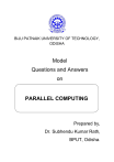 BIJU PATNAIK UNIVERSITY OF TECHNOLOGY, ODISHA Model Questions and Answers on PARALLEL COMPUTING Prepared by, Dr. Subhendu Kumar Rath, BPUT, Odisha. Model Questions and Answers Subject – Parallel Computing (Module-I,II,III) By Dr. Subhendu Kumar Rath, BPUT Short Questions: 1) What is Parallel Computing? Answer: Parallel Computing resembles the study of designing algorithms such that the time complexity is minimum. Thus the speed up factor is taken into consideration. 2) What is a parallel computer? Answer: A parallel Computer is simply a collection of processors, typically of the same type, interconnected in a certain fashion to allow the coordination of their activities and the exchange of data. 3) What is Moore’s Law? Answer: Moore's Law states that ‘circuit complexity doubles every eighteen months’. 4) What are the applications parallel computing? Answer: There are several applications of parallel computing. • Effective parallel algorithms are required for problems such as association rule mining, clustering, classification, and time-series analysis. • Bioinformatics and astrophysics • Optimization and Branch-and-bound, and Genetic programming • Association rule mining, clustering, classification, and time-series analysis. 5) What is pipelining? Answer: Pipelining is a technique of dividing one task into multiple subtasks and executing the subtasks in parallel with multiple hardware units. 6) What is super-scalar Execution? Answer: The ability of a processor to issue multiple instructions in the same cycle is referred to as superscalar execution. 7) What is true data dependency? Answer: If the results of an instruction is required for subsequent instructions then this is referred to as true data dependency. 8) What is resource dependency? Answer: The dependency in which two instructions compete for a single processor resource is referred to as resource dependency. 9) What is Horizontal Waste? Answer: If only part of the execution units is used during a cycle, it is termed horizontal waste. 10) What is Vertical Waste? Answer: If, during a particular cycle, no instructions are issued on the execution units, it is referred to as vertical waste. 11) What is VLIW? Answer: Instructions that can be executed concurrently are packed into groups and parceled off to the processor as a single long instruction word to be executed on multiple functional units at Prepared by Dr. Subhendu Kumar Rath, BPUT Page 1 the same time. This is called very large instruction word (VLIW). 12) What is bandwidth of memory? Answer: The rate at which data can be pumped from the memory to the processor determines the bandwidth of the memory system. 13) What is latency of memory? Answer: The time taken in putting a request for a memory word and returns a block of data of size b containing the requested word is referred to as the latency of the memory. 14) What is logical and physical organization of parallel programming platforms? Answer: The logical organization refers to a programmer's view of the platform while the physical organization refers to the actual hardware organization of the platform. 15) Differentiate between SIMD and MIMD? Answer: In architectures referred to as single instruction stream, multiple data stream (SIMD), a single control unit dispatches instructions to each processing unit. In an SIMD parallel computer, the same instruction is executed synchronously by all processing units. Computers in which each processing element is capable of executing a different program independent of the other processing elements are called multiple instruction stream, multiple data stream (MIMD) computers. SIMD computers require less hardware than MIMD computers because they have only one global control unit. SIMD computers require less memory because only one copy of the program needs to be stored. In contrast, MIMD computers store the program and operating system at each processor. 16) Differentiate between UMA and NUMA. Answer: If the time taken by a processor to access any memory word in the system (global or local) is identical, the platform is classified as a uniform memory access (UMA) multicomputer. On the other hand, if the time taken to access certain memory words is longer than others, the platform is called a non-uniform memory access (NUMA) multicomputer. 17) What is Cache Coherence? Answer: In shared address space platform ensuring that concurrent operations on multiple copies of the same memory word have well-defined semantics is called cache coherence. 18) What is PRAM Model? Answer: A Model of computation (the Random Access Machine, or RAM) consists of p processors and a global memory of unbounded size that is uniformly accessible to all processors. All processors access the same address space. Processors share a common clock but may execute different instructions in each cycle. This ideal model is also referred to as a parallel random access machine (PRAM). 19) Differentiate between Static and Dynamic Network. Answer: Static networks consist of point-to-point communication links among processing nodes and are also referred to as direct networks. Dynamic networks, on the other hand, are built using switches and communication links. 20) What is Bus-based Network? Answer: A bus-based network is perhaps the simplest network consisting of a shared medium that is common to all the nodes. A bus has the desirable property that the cost of the network Prepared by Dr. Subhendu Kumar Rath, BPUT Page 2 scales linearly as the number of nodes, p. 21) What is a star network? Answer: In a star-connected network, one processor acts as the central processor. Every other processor has a communication link connecting it to this processor. 22) What is a linear array? Answer: A linear array is a static network in which each node (except the two nodes at the ends) has two neighbors, one each to its left and right. 23) What is Diameter? Answer: The diameter of a network is the maximum distance between any 
